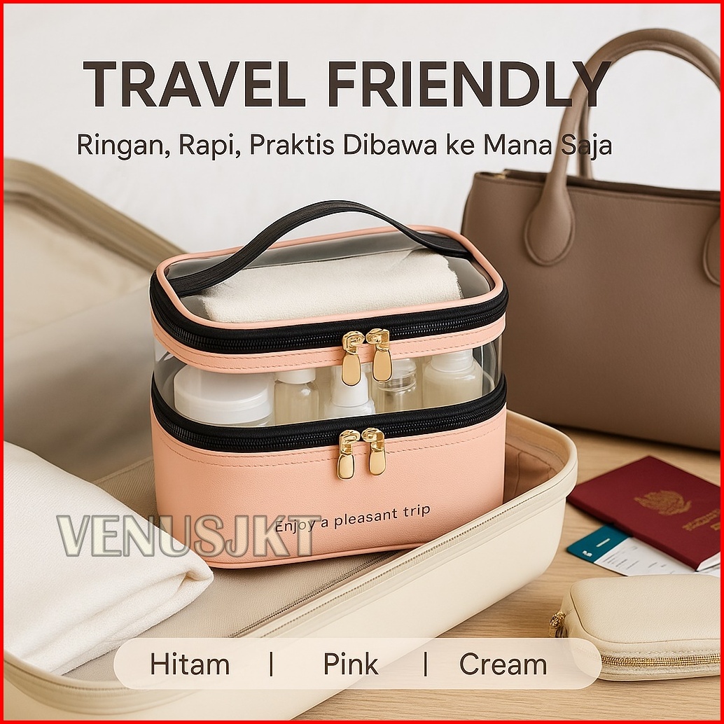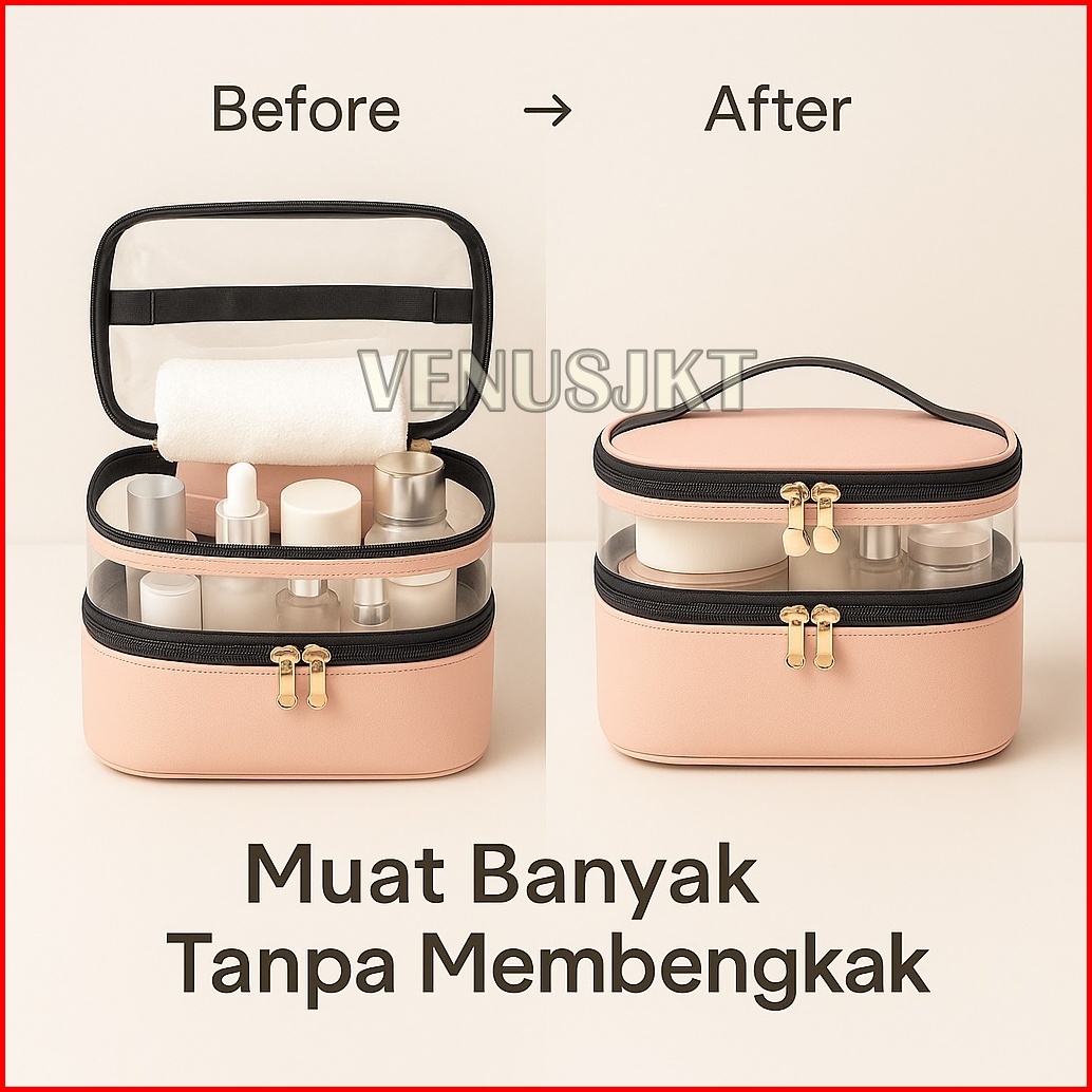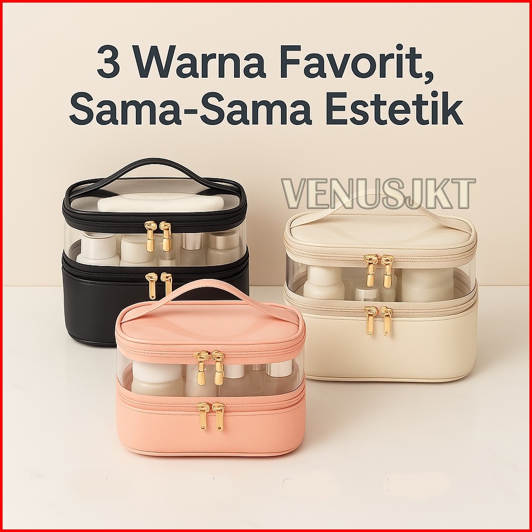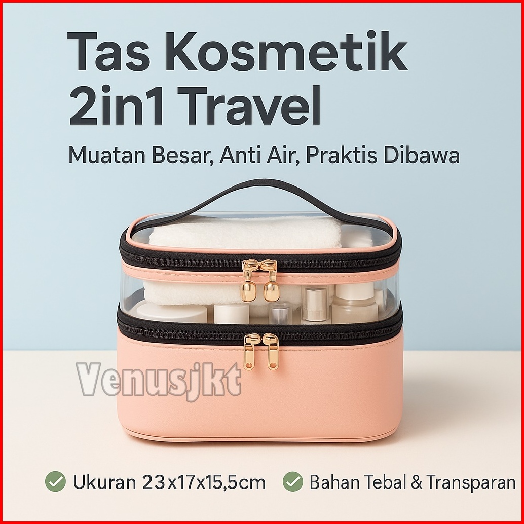 Tas Kosmetik Transparan Portable Pouch Travel Korea Tas Kosmetik Set 2 Tingkat Tas Kosmetik Pu Tahan Air Tempat Penyimpa