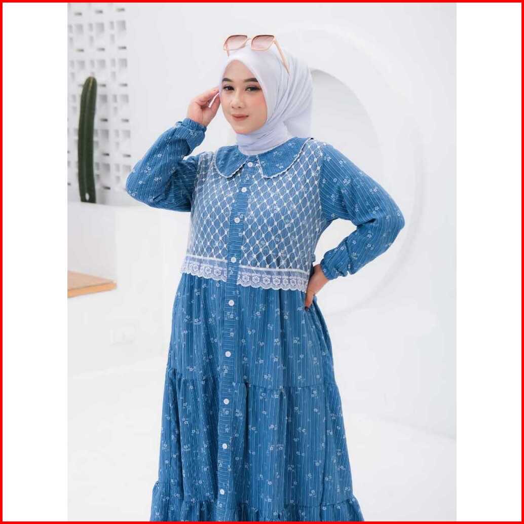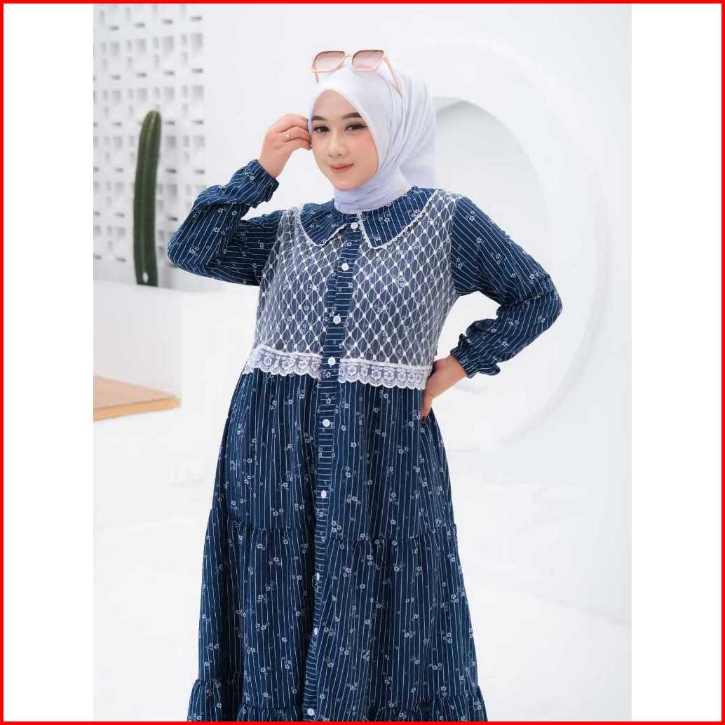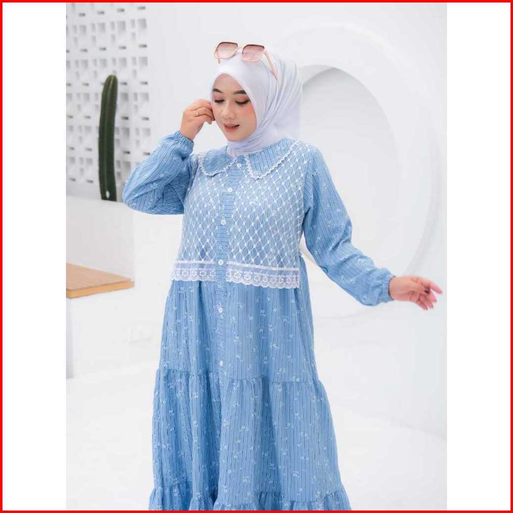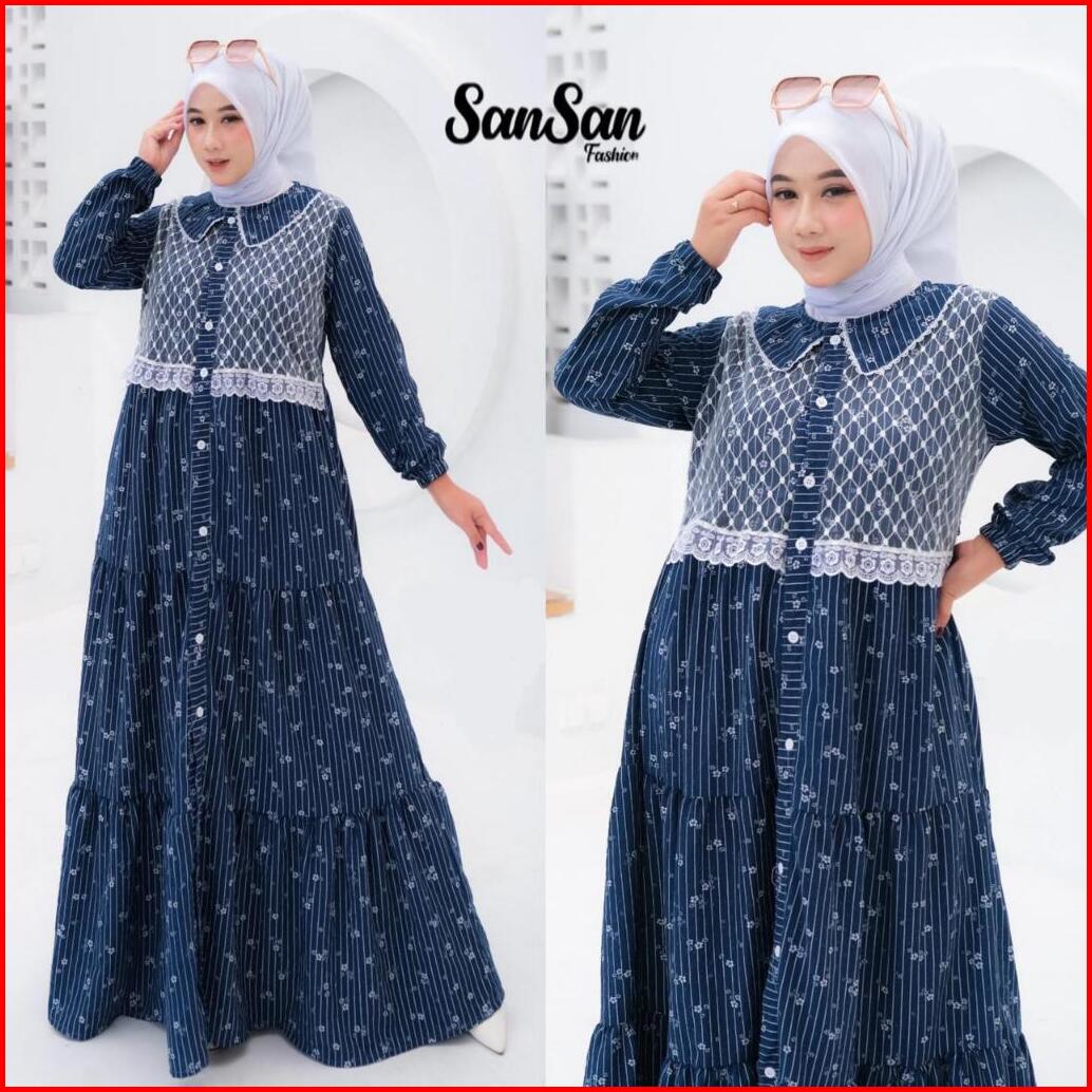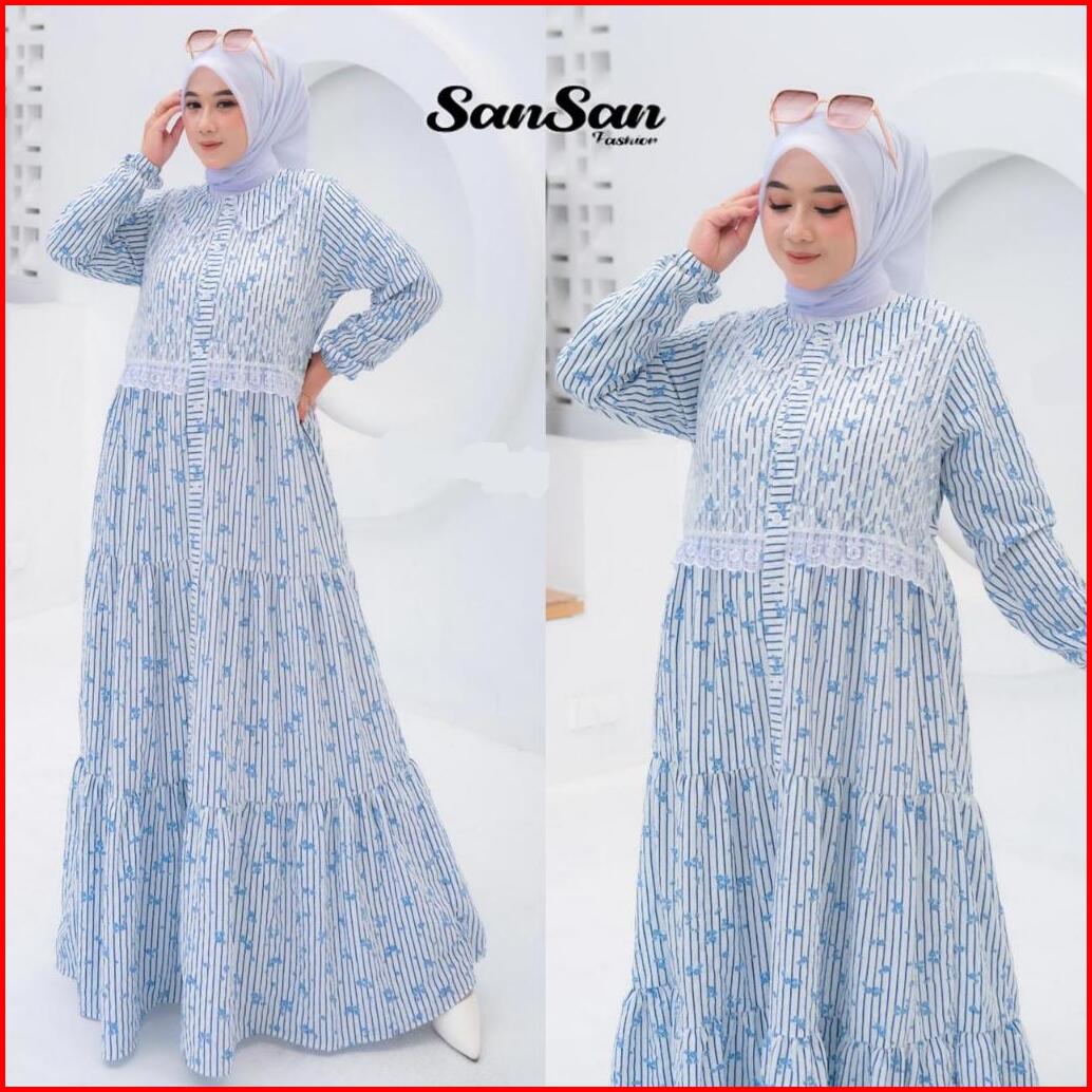 Alluna Midi Dress Gamis Motif Salur Brukat Sansans Fashion Korean Style Wanita Remaja Dewasa Terbaru