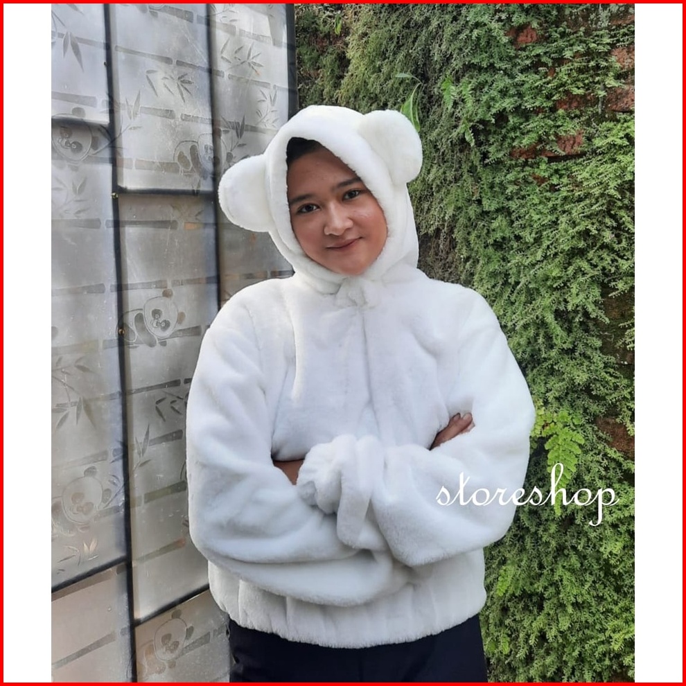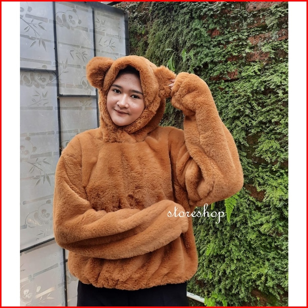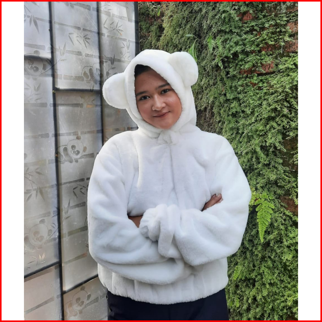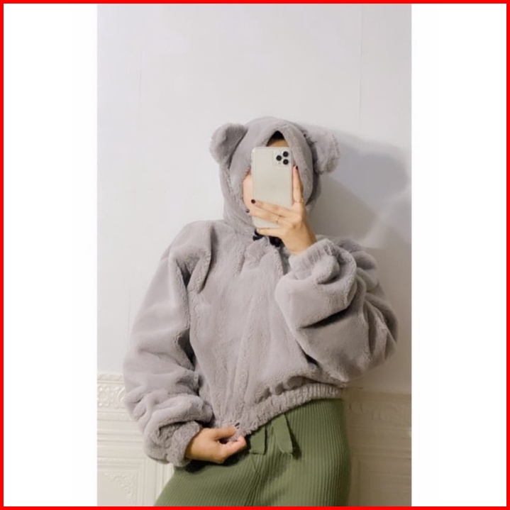 Jaket Sherpa Hoodie Bulu Bear Crop Wanita