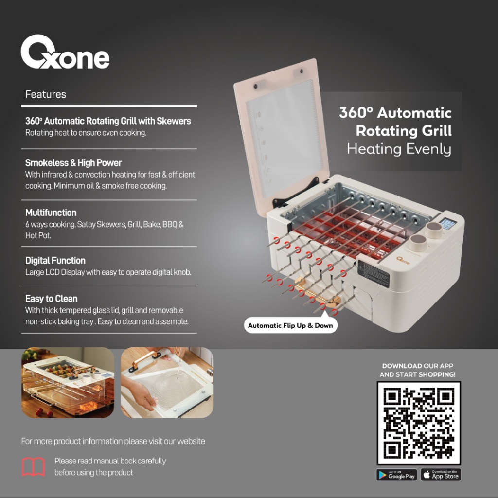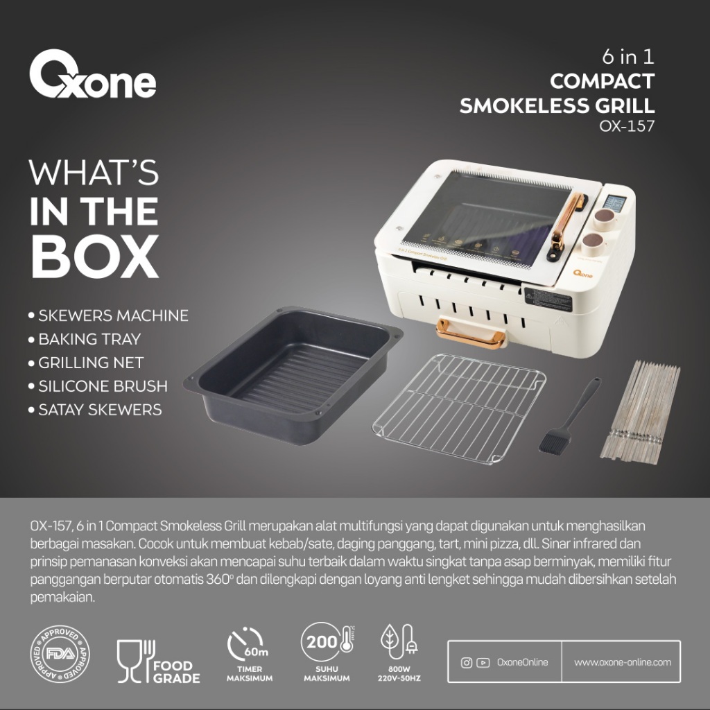 Oxone OX157 Compact Smokeless Grill 6 in 1 | Pembuat Sate | Multifungsi | Pemanggang listrik tanpa arang dan asap