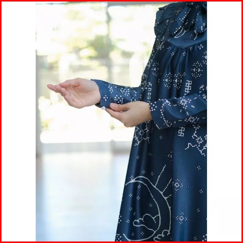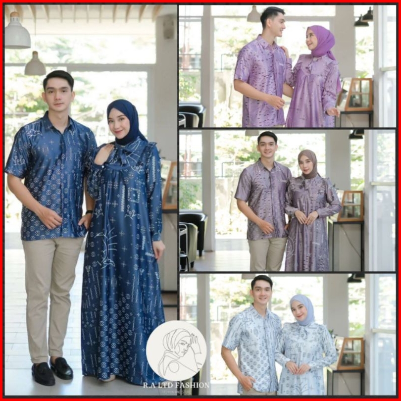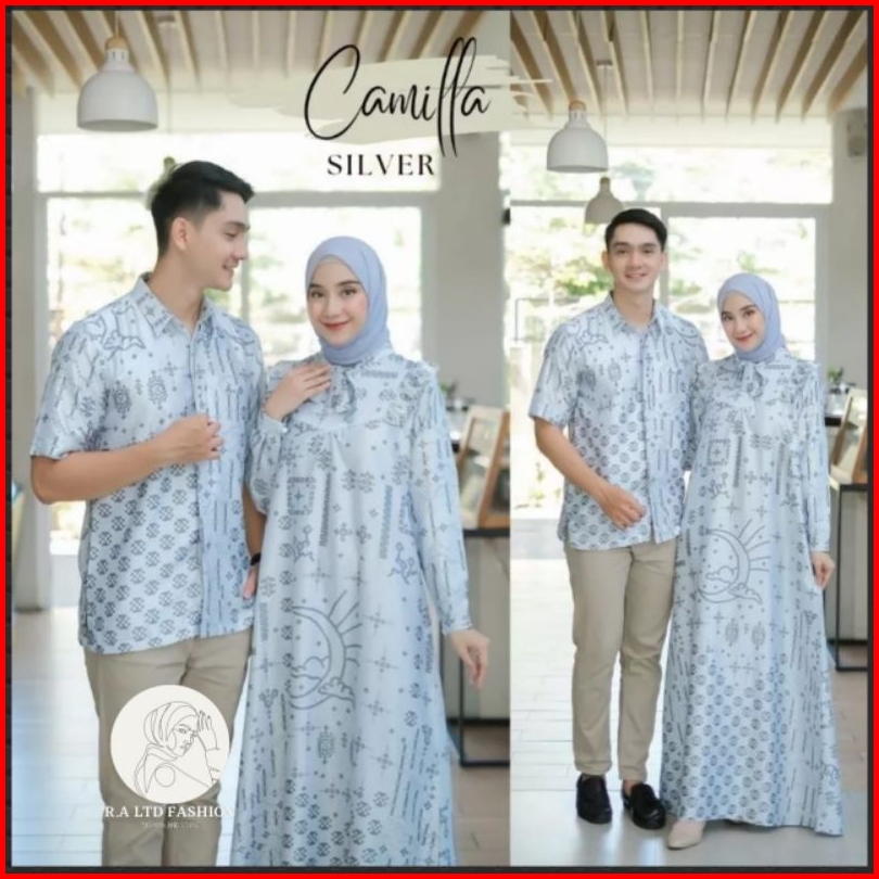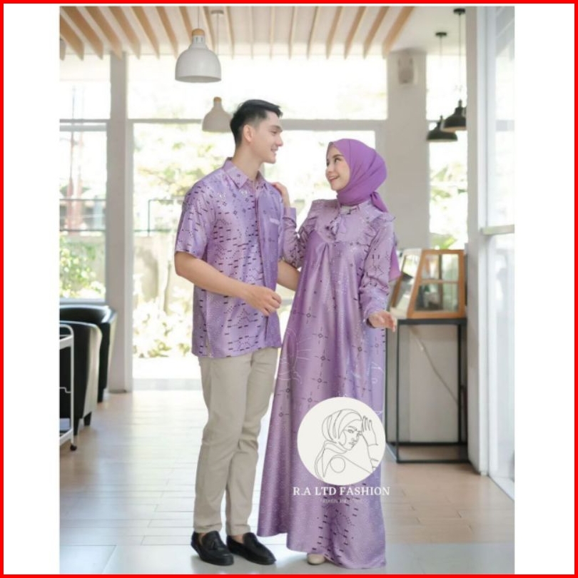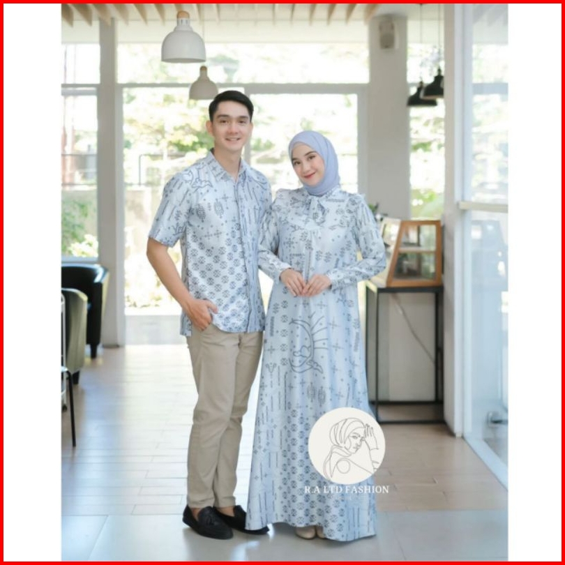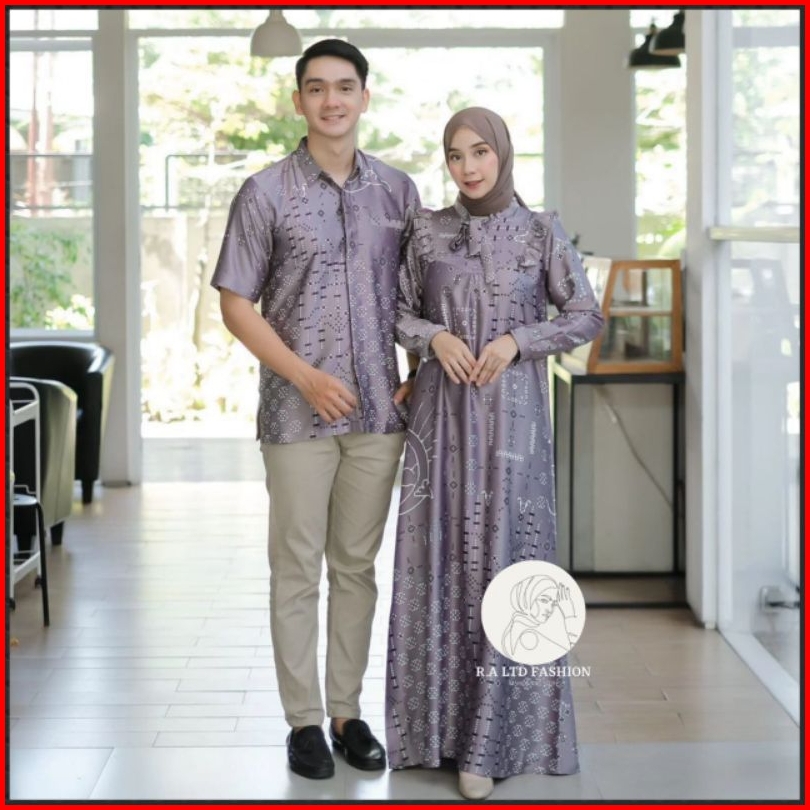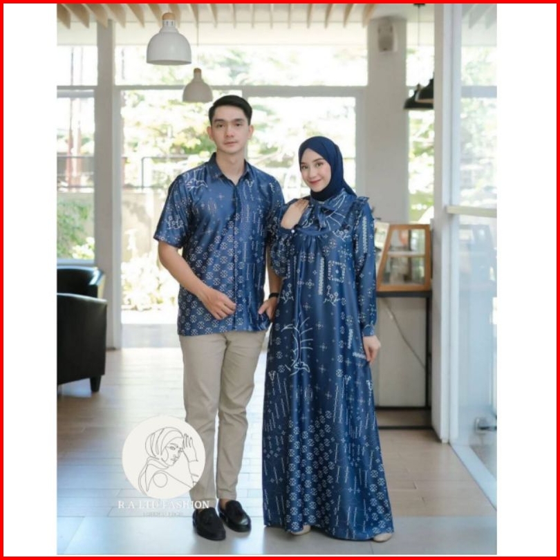 Couple Baju Muslim Pasangan Gamis Dan Kemeja Pria Kondangan Kekinian Bahan Silk Dress Busui Motif Bulan Bintang Tebaru