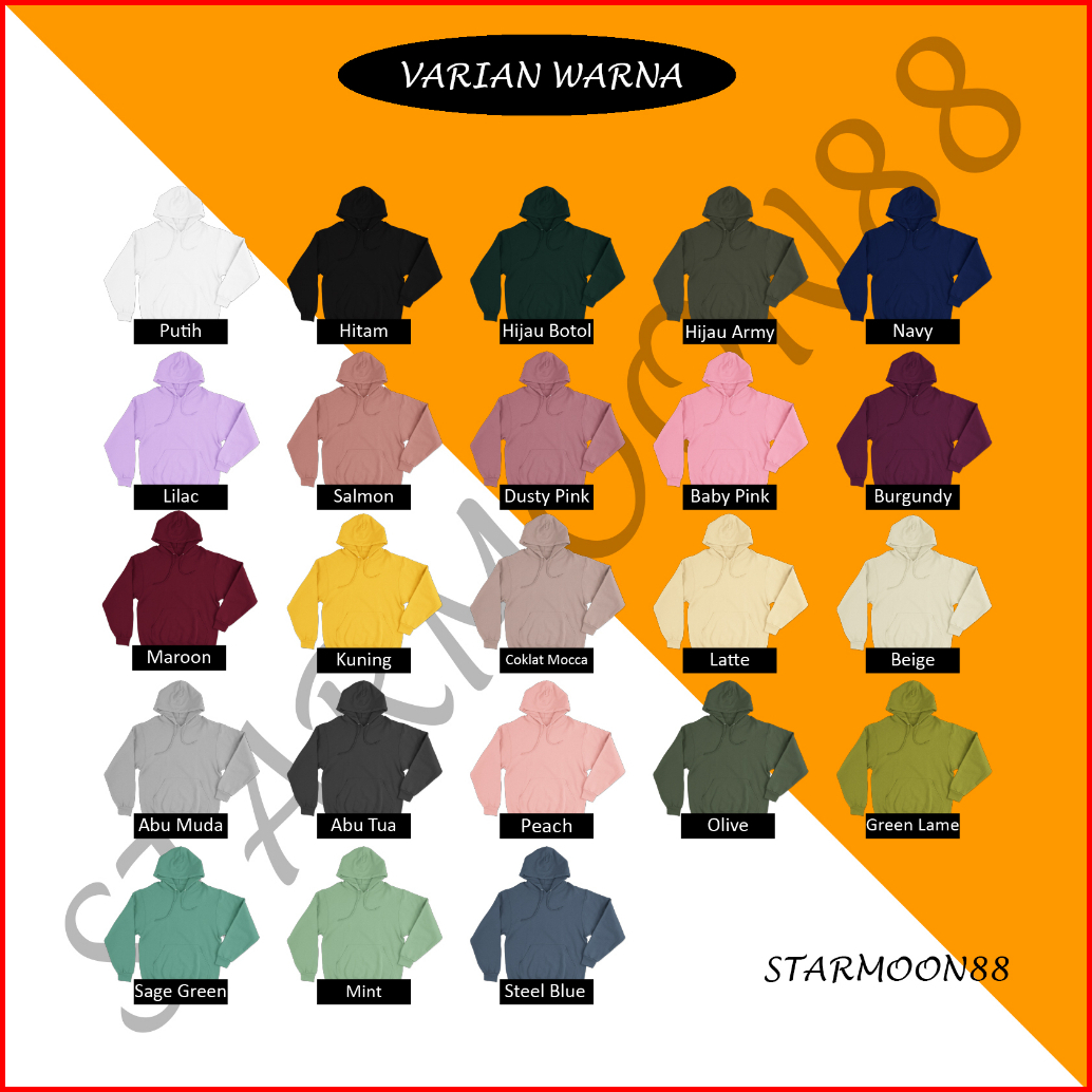 HITAM, MOCCA, ABU MUDA, BEIGE, STEEL BLUE, OLIVE, PUTIH, ABU TUA, DUSTY PINK, LATTE, SAGE GREEN, PEACH, MINT, HIJAU BOTOL, ARMY, BABY PINK, KUNING, SALMON, NAVY, LILAC, MAROON, BURGUNDY