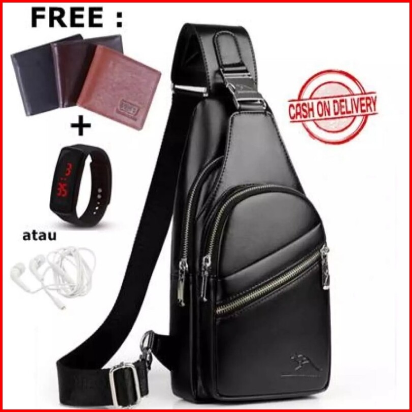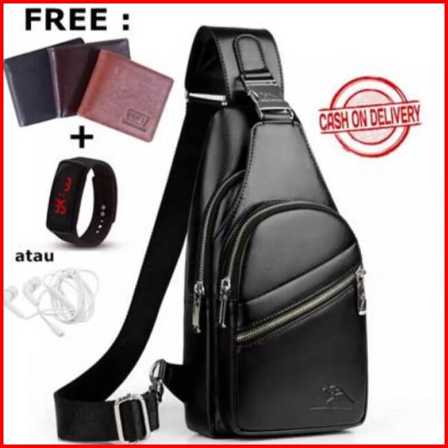 Tas Selempang Pria Kulit Murah Anti Air - Jason Bag Bonus Dompet Jam Tangan Led Headset
