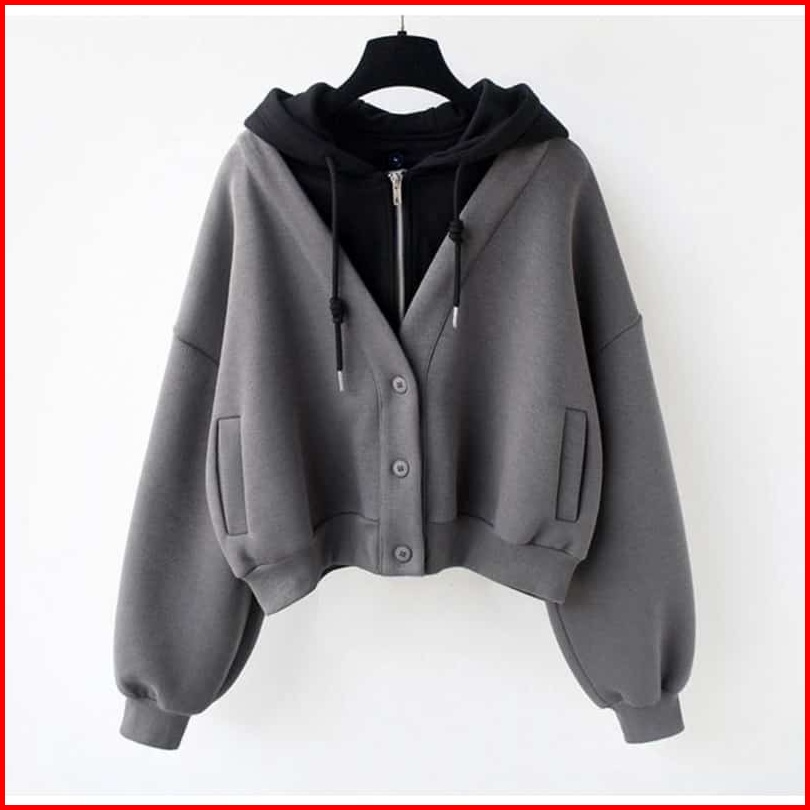 - Zip Combie Button Jaket Hoodie Twotone Ziper Outerwear Matt Fleece Tebal Ootd Wanita Remaja Korean Style Premium