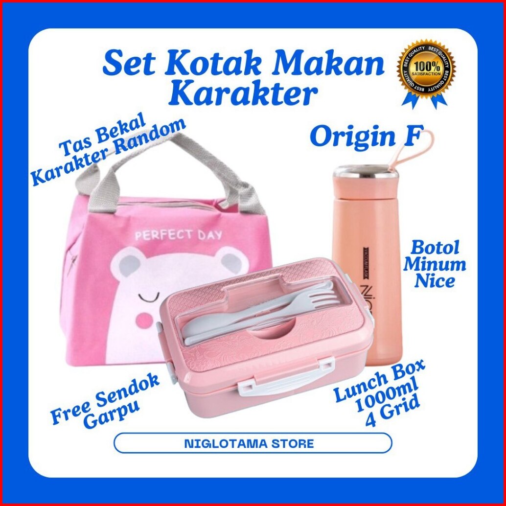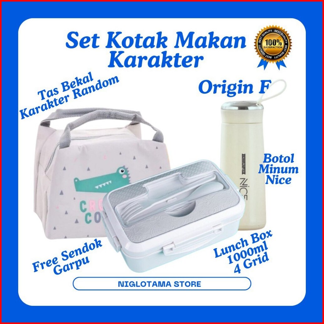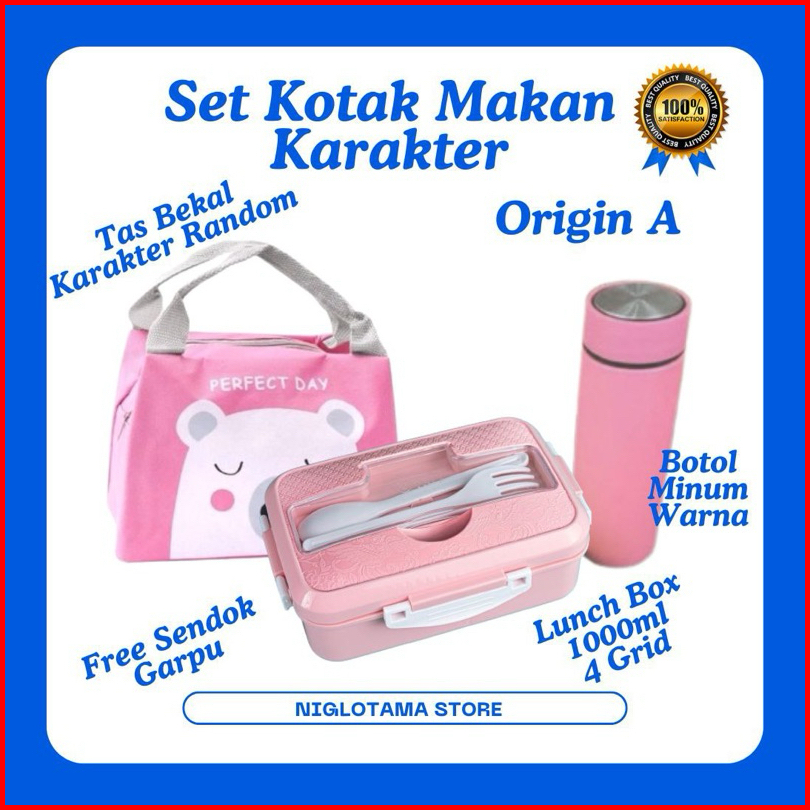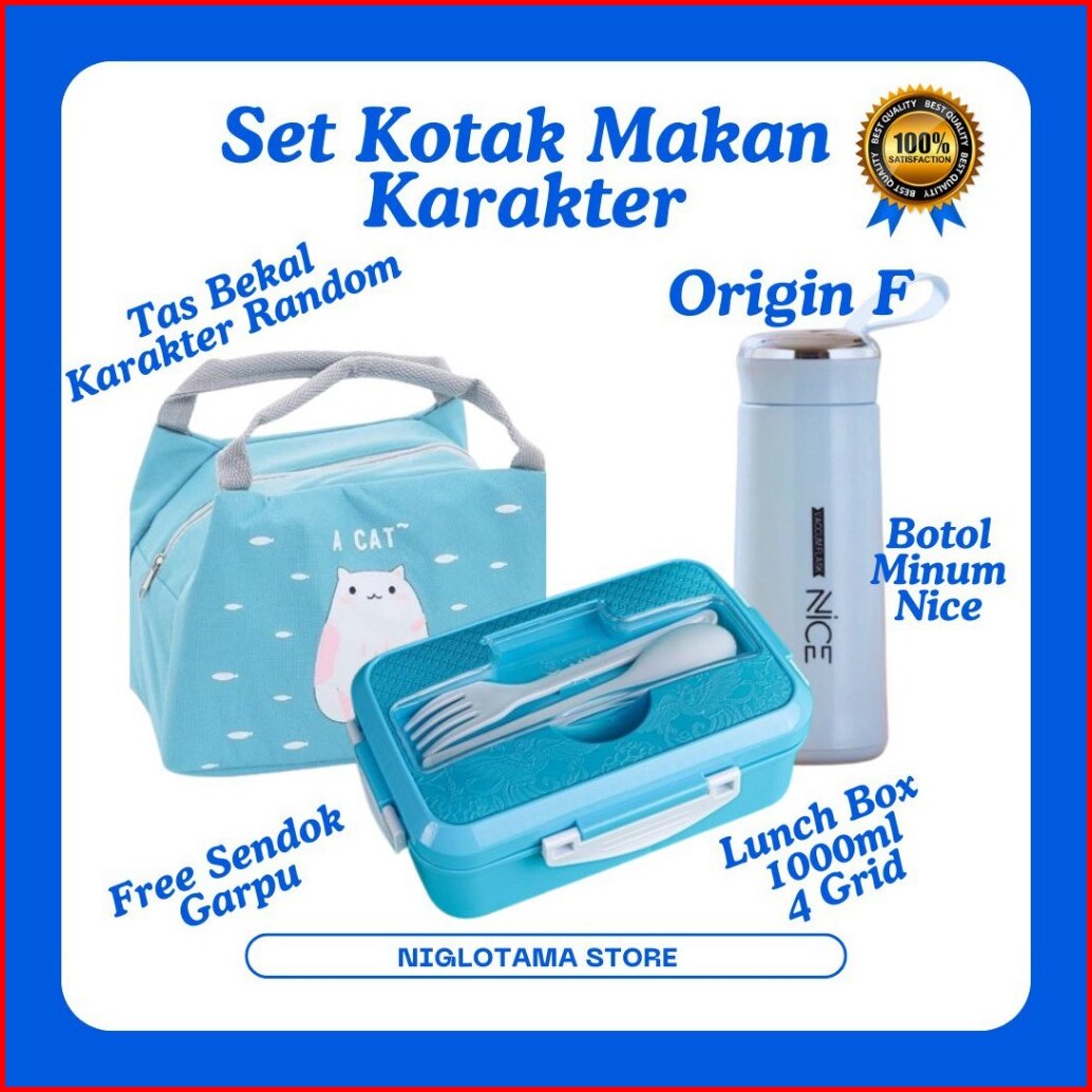 Lunch Box Set Kotak Bekal Makan Anak Anti Tumpah 4 Grid 1000ml Free Sendok Garpu Tas Bekal Makan Karakter Lucu Untuk Ana