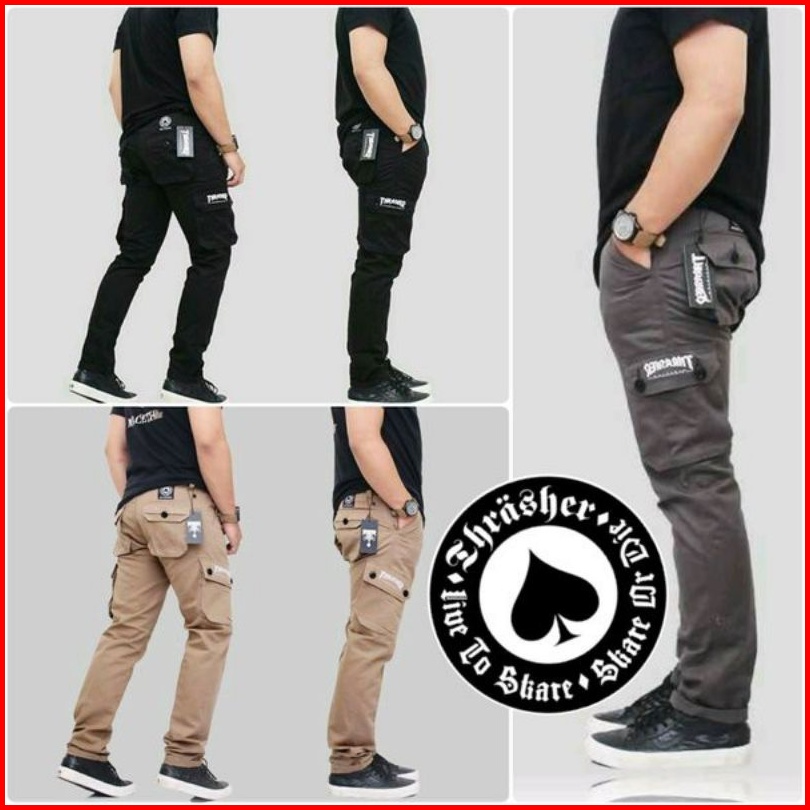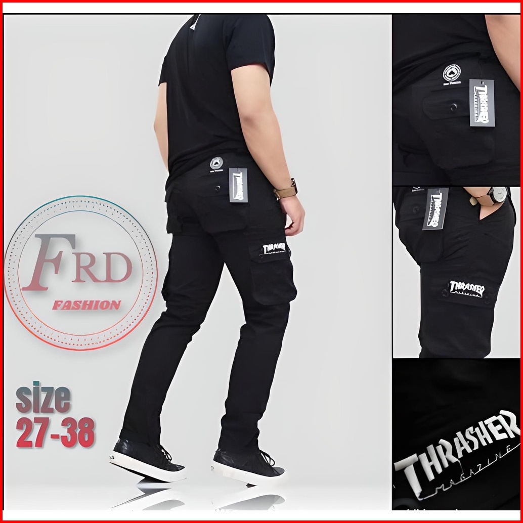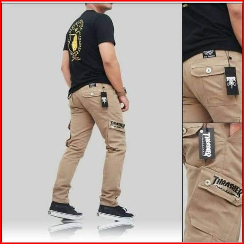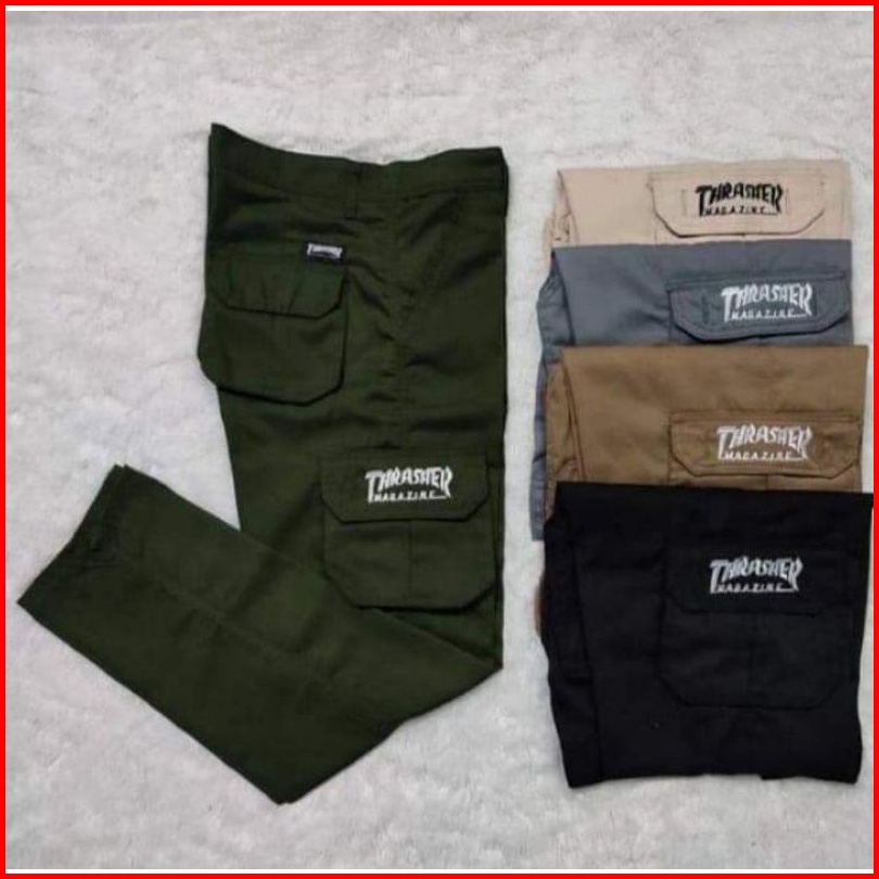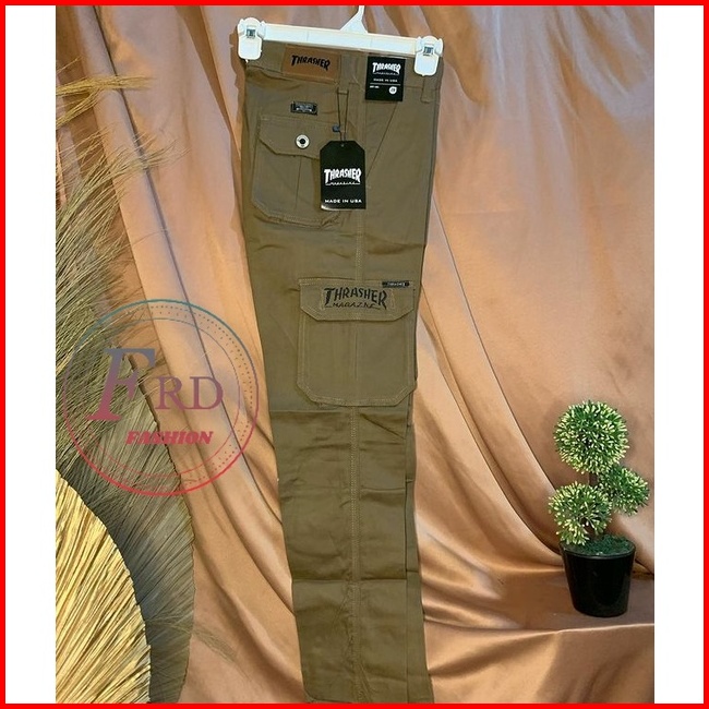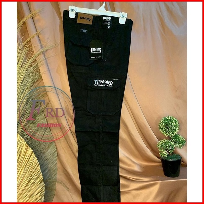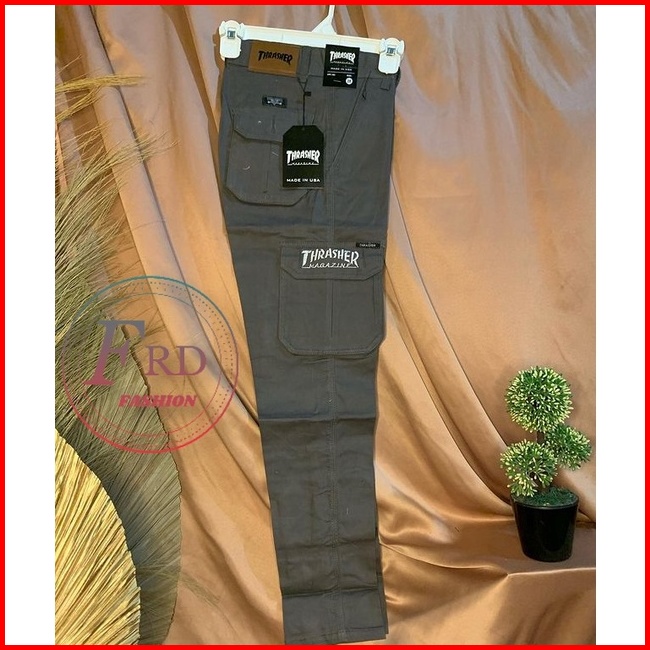 Celana Cargo Panjang Pria Thrasher Bahan Katun Tebal Nyaman Di Pakai Kimpul Banyak Kantong Size Jumbo 28-38