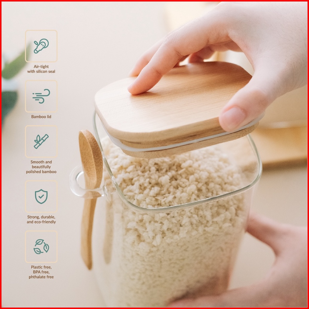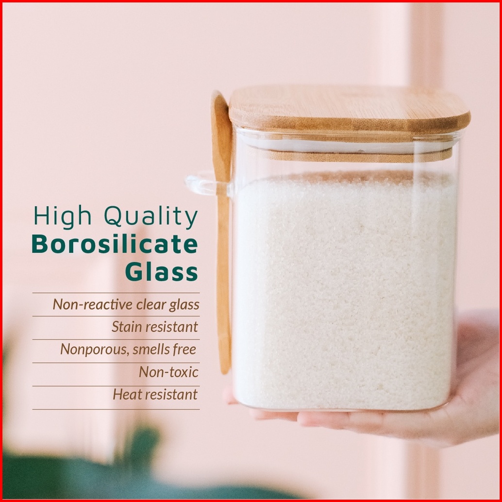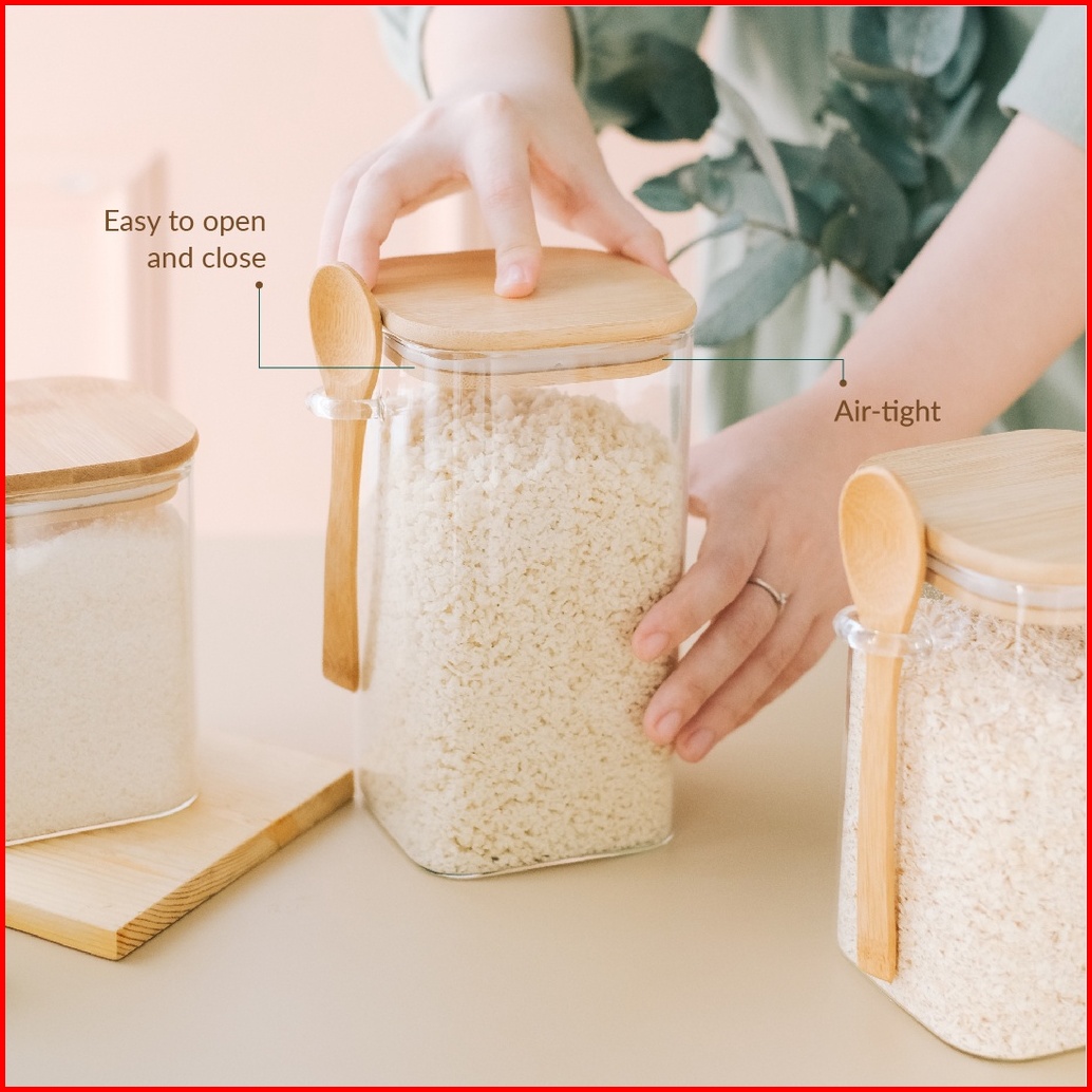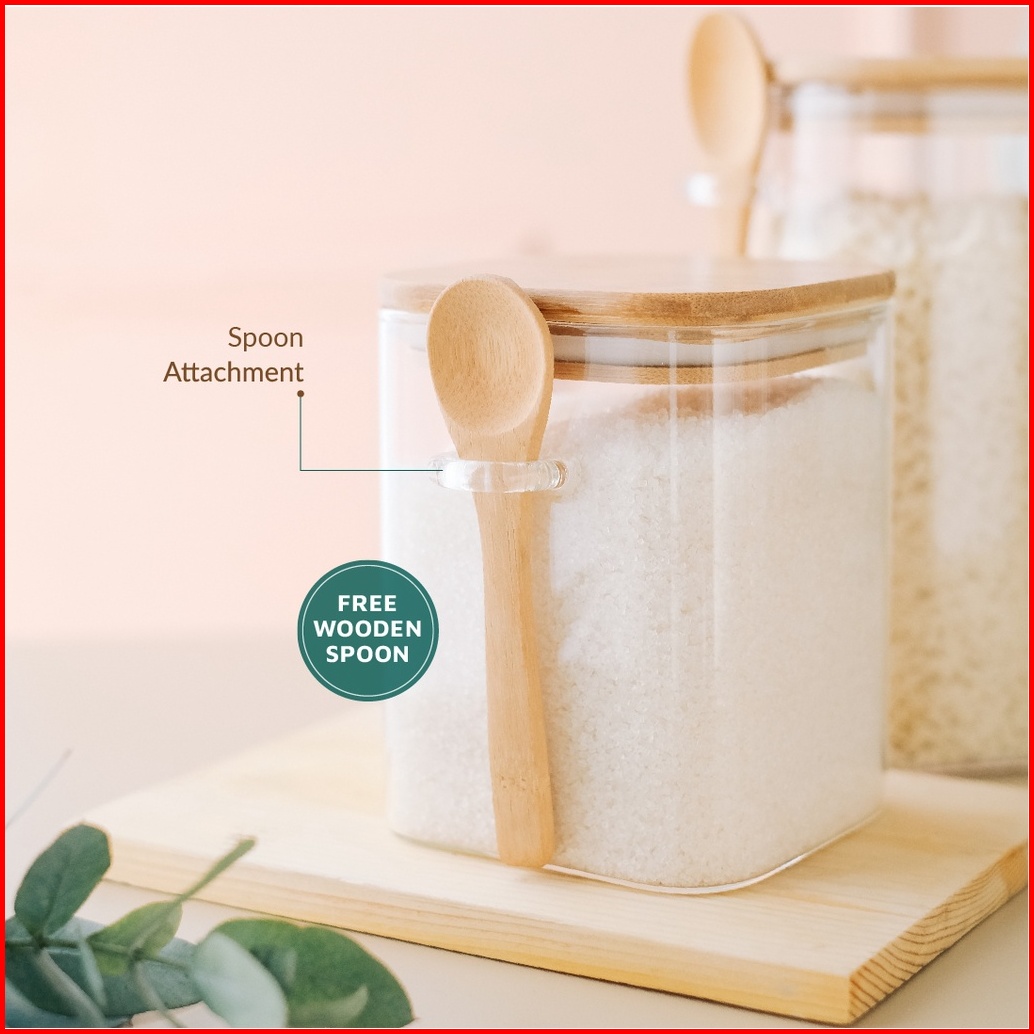 Toples Kaca Kotak Tempat Bumbu Gula Kopi Storage Jar Borosilicate Free Sendok Kedap Udara Tutup Kayu Wadah Tempat Penyim
