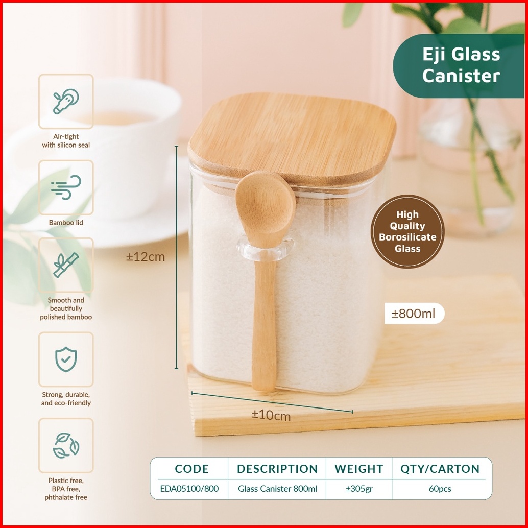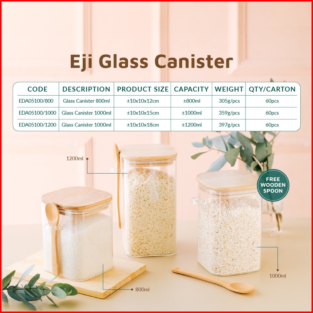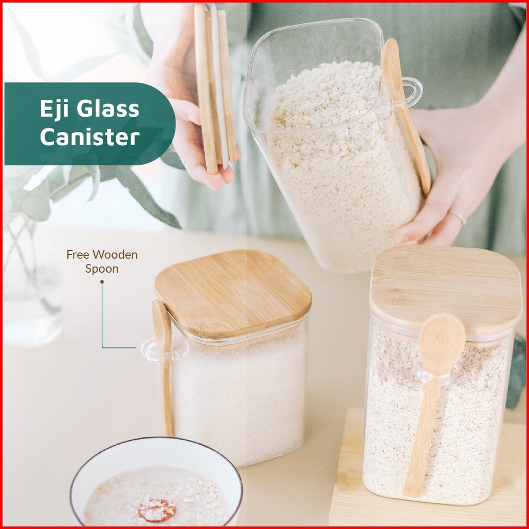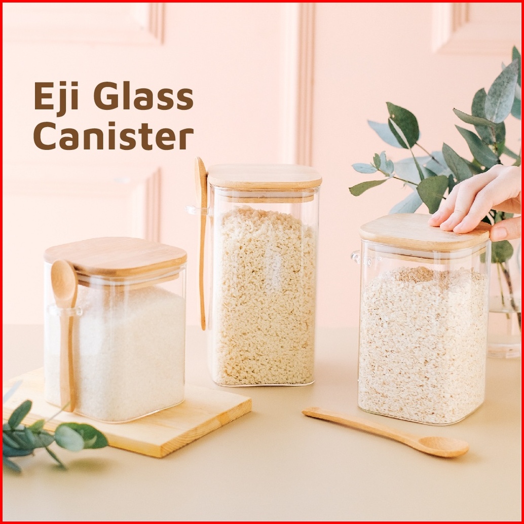 Toples Kaca Kotak Tempat Bumbu Gula Kopi Storage Jar Borosilicate Free Sendok Kedap Udara Tutup Kayu Wadah Tempat Penyim