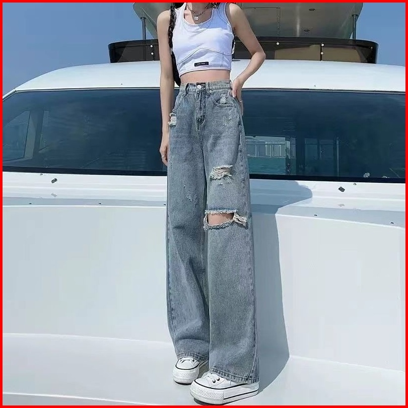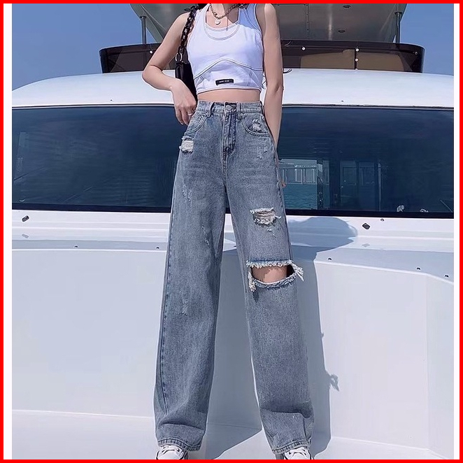 Celana Jeans Sobek Wanita Kekinian Highwaist Kulot Jeans Ripped Loose Celana Panjang Jeans Denim Import Korean Style Oot