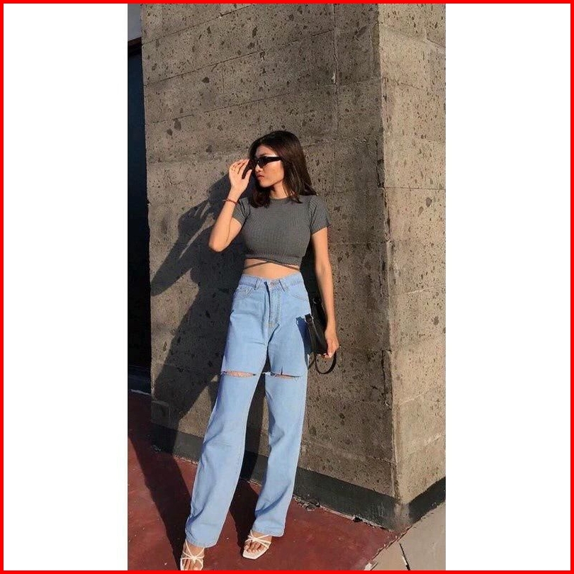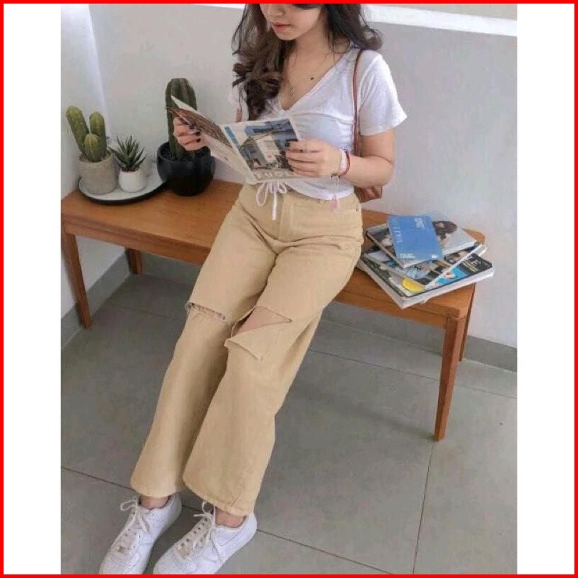 Celana Kulot Jeans Wanita Sobek Ripped Jins Denim Highwaist Termurah Cewek