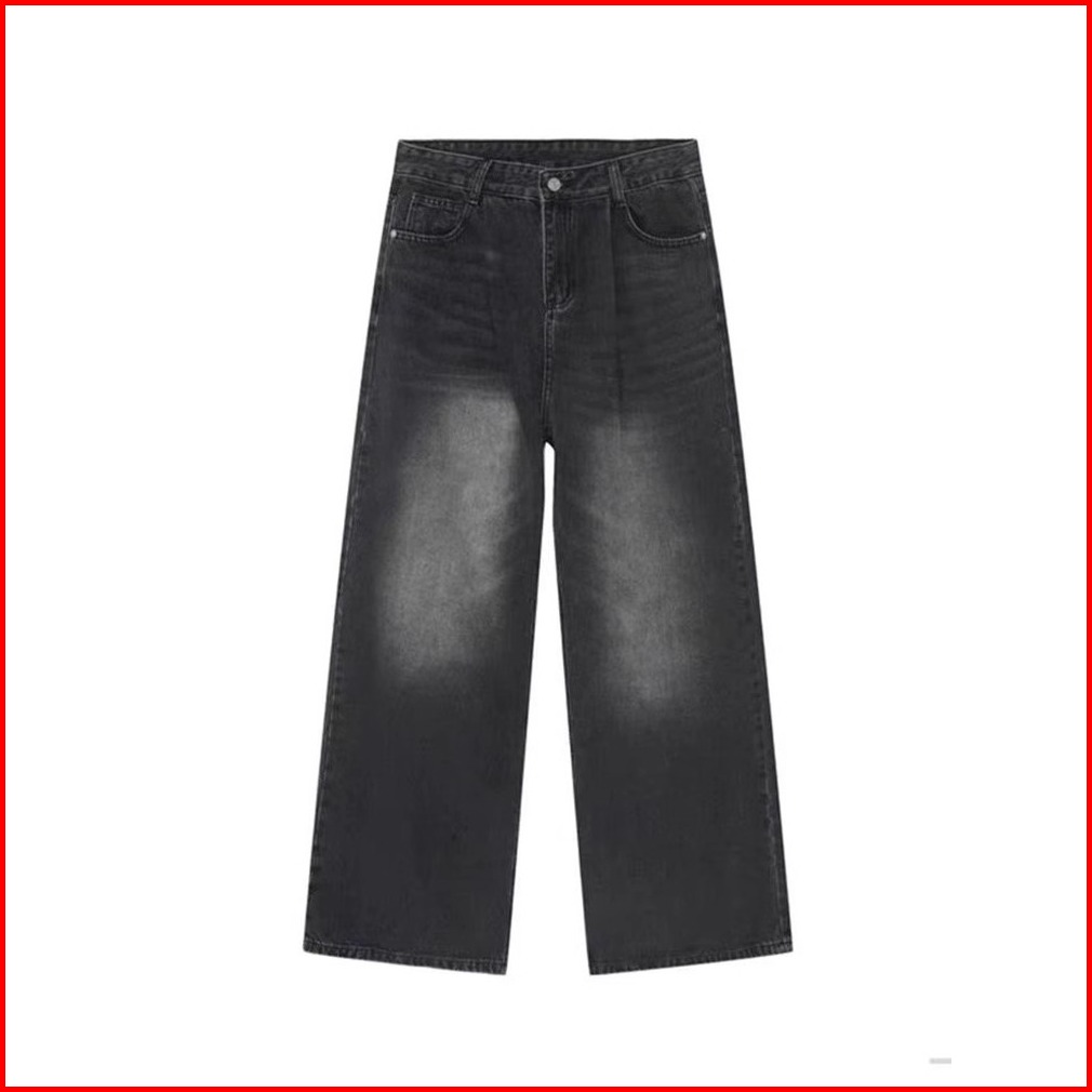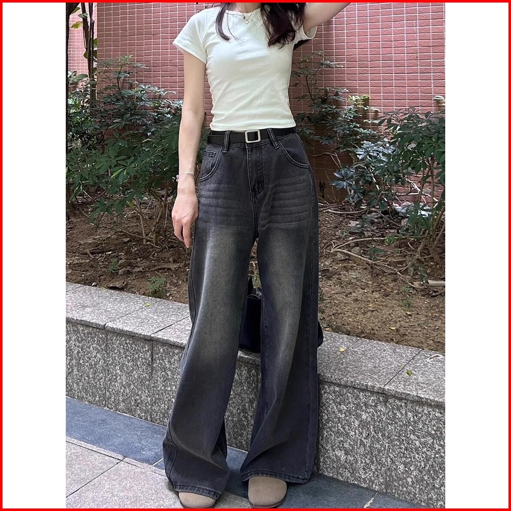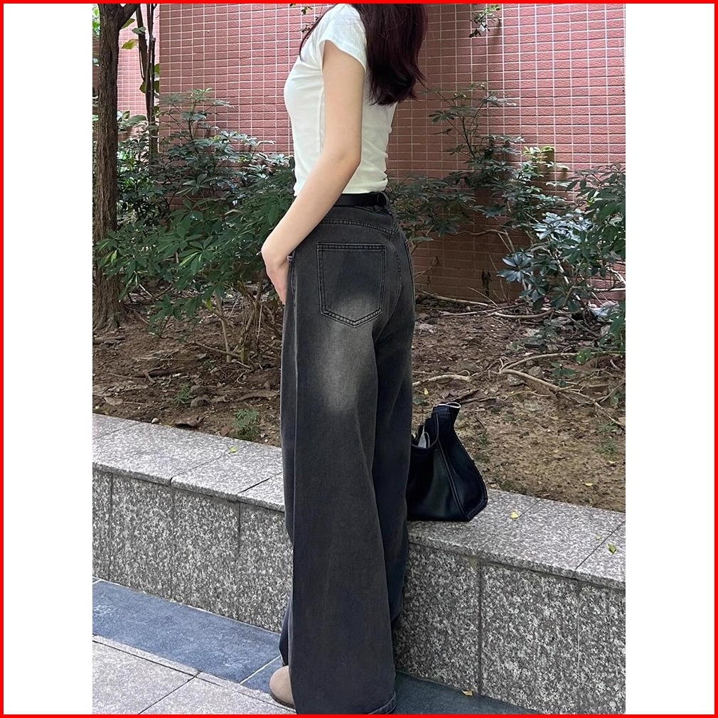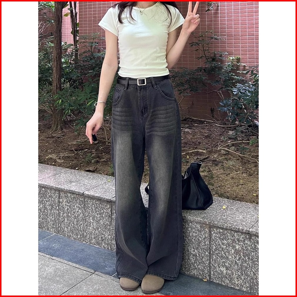 Highwaist Kulot Loose Jeans Wanita Celana Jeans Panjang Kekinian Longgar Hitam Dan Abu Ala Korea