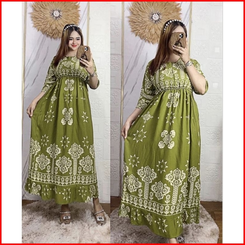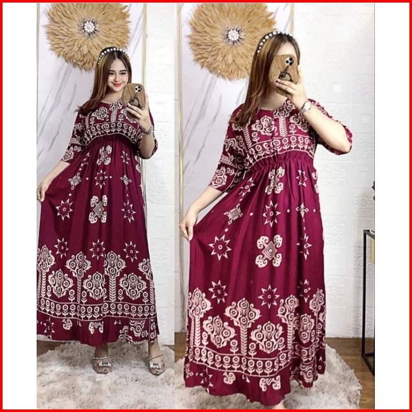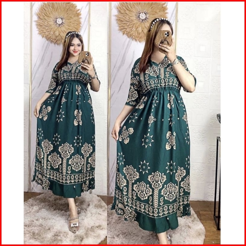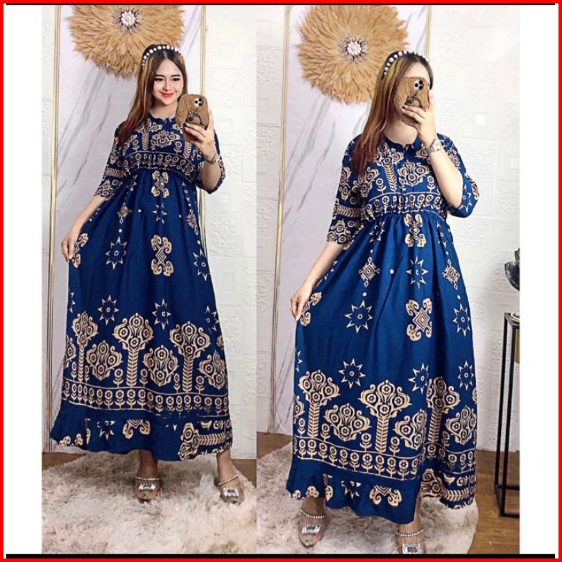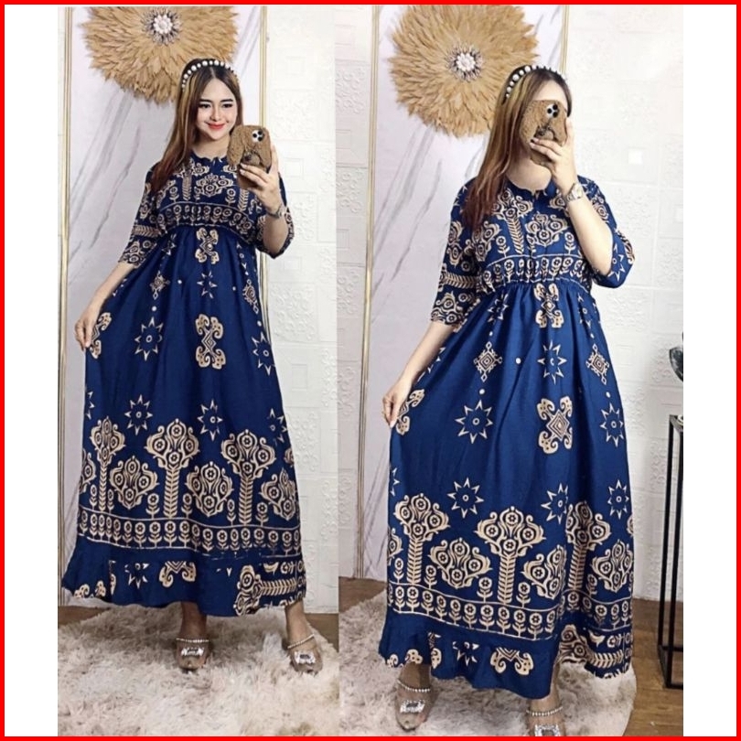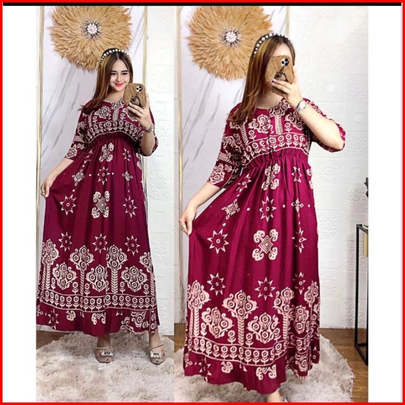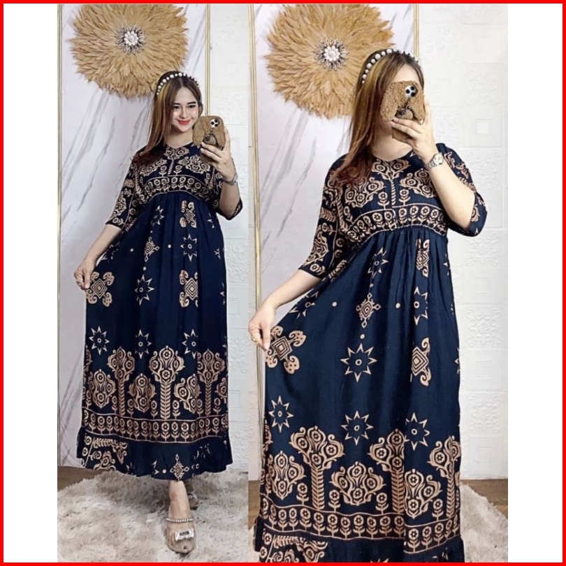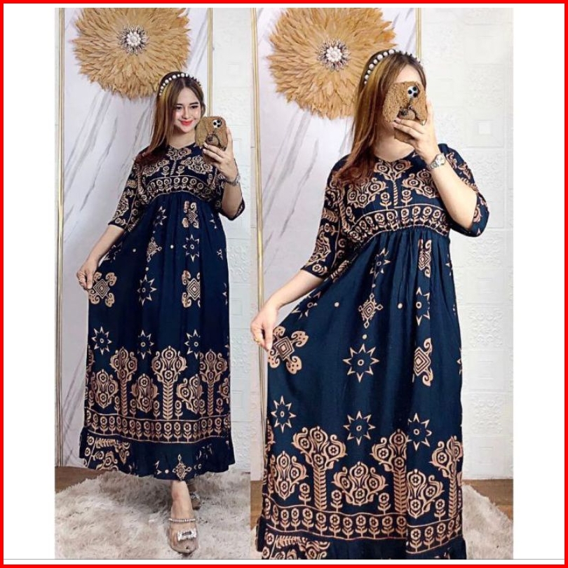 Dress Midi Motif Sultan Jumbo Ld 120 Kerut Dada Panjang Busui Resleting Depan Rayon Premium