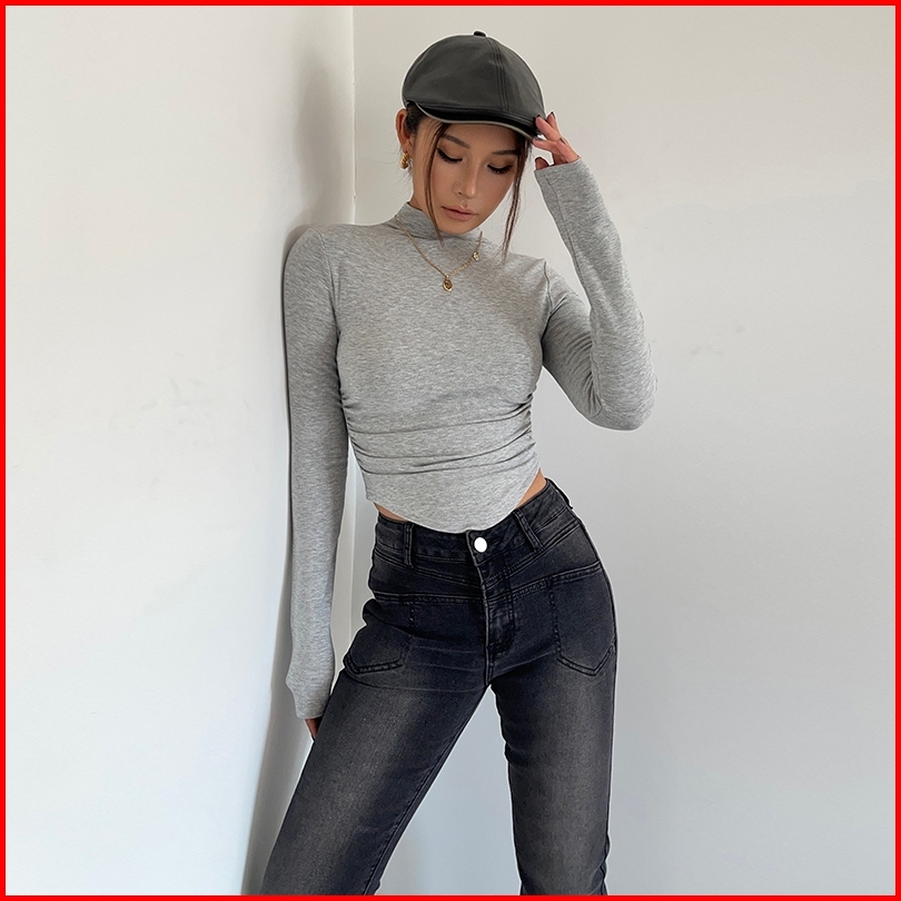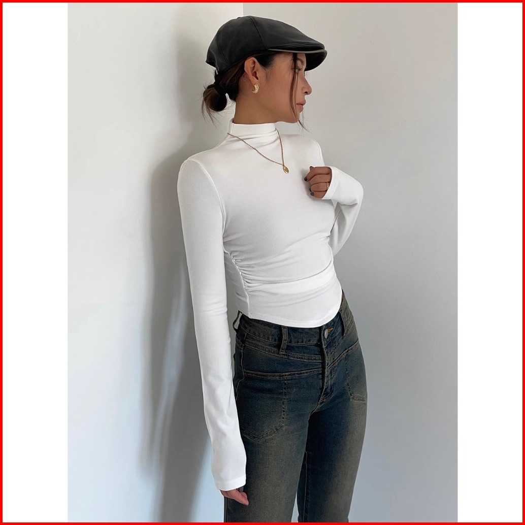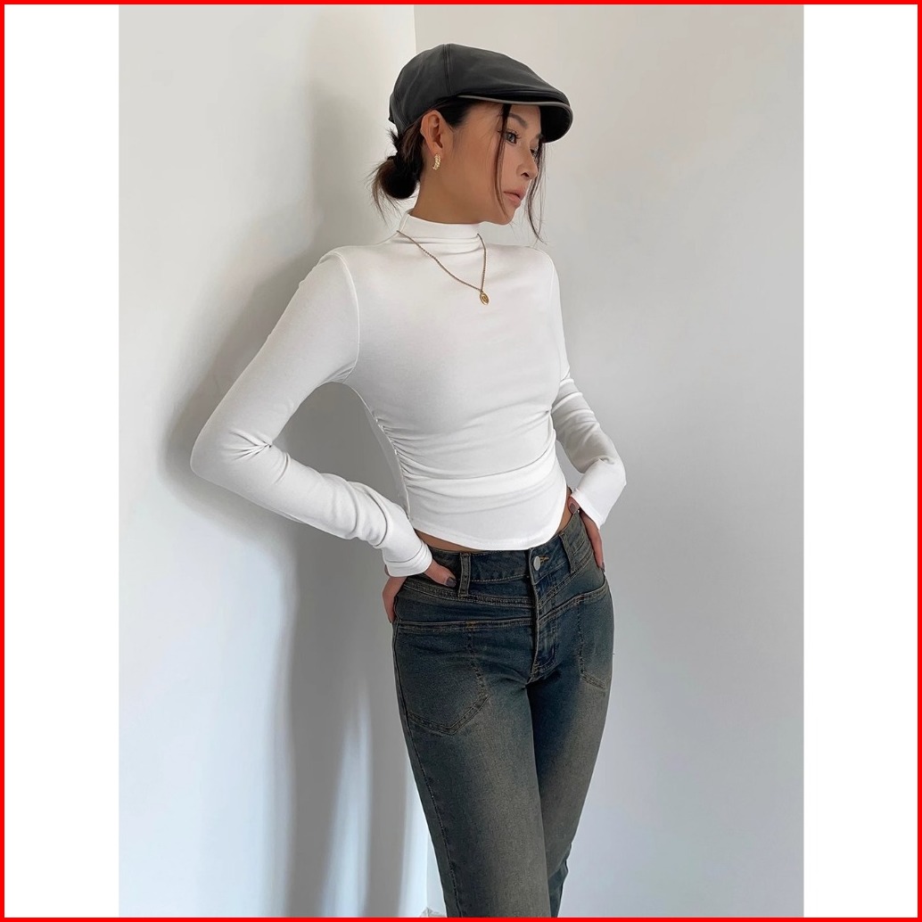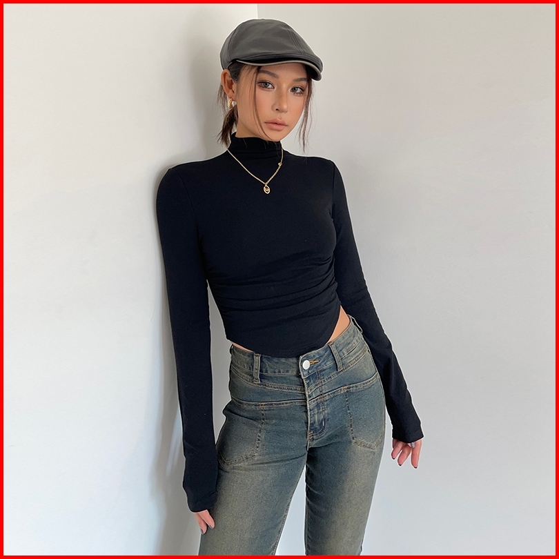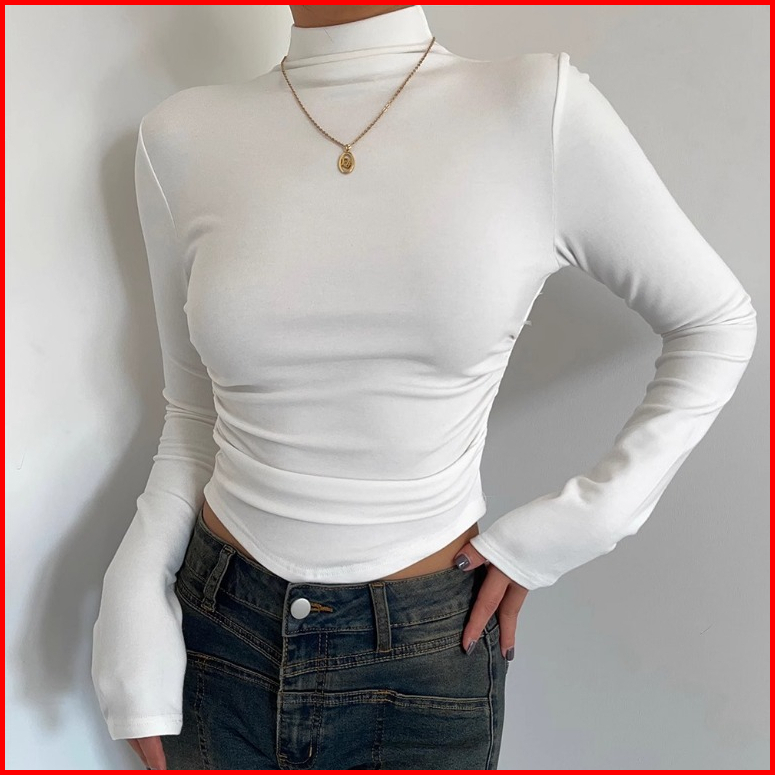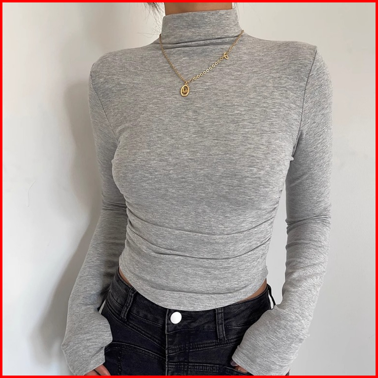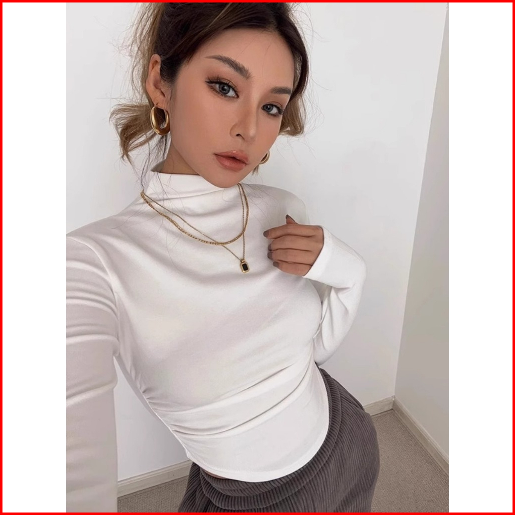 Premium Atasan Turtleneck Wanita Baju Lengan Panjang Wanita Polos Kaos Crop Slim Fit Ala Korea