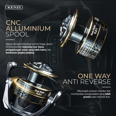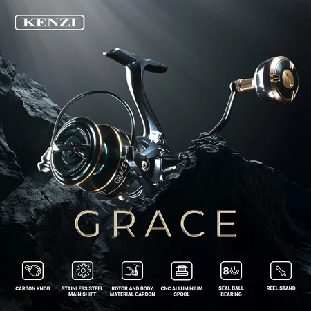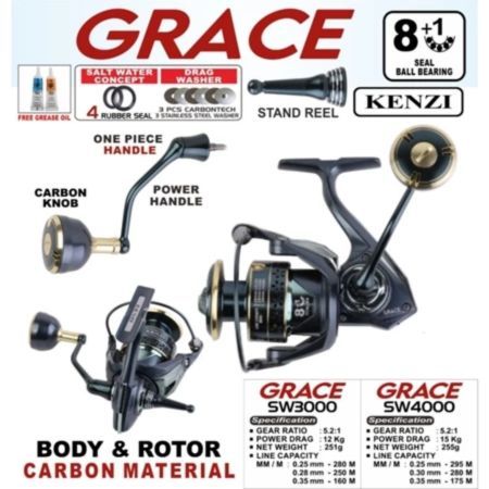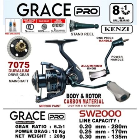 REEL KENZI GRACE PRO SW 2000 3000 4000 SPINNING CARBON BODY MIRROR PAINT PREMIUM ONE PIECE POWER HANDLE with REEL STAND