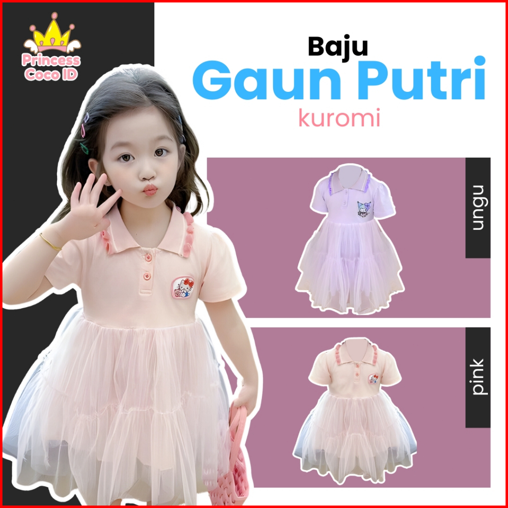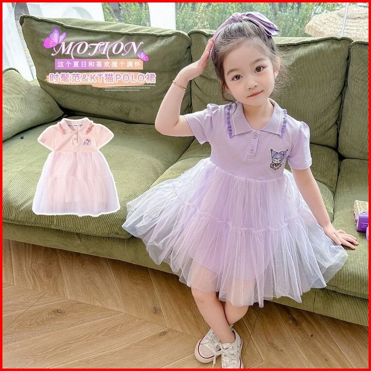 Princesscoco 1-11 Tahun Gaun Kuromi Rok Polo Jala Lengan Pendek Rok Putri Kartun Gaya Baru