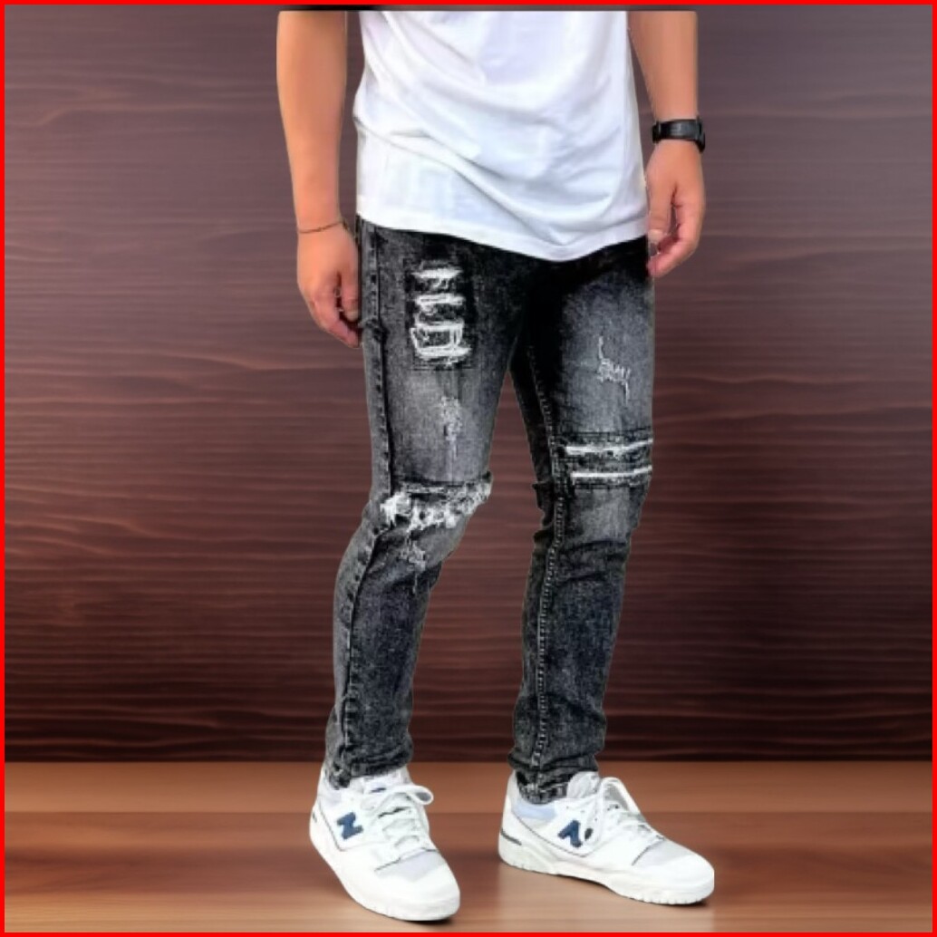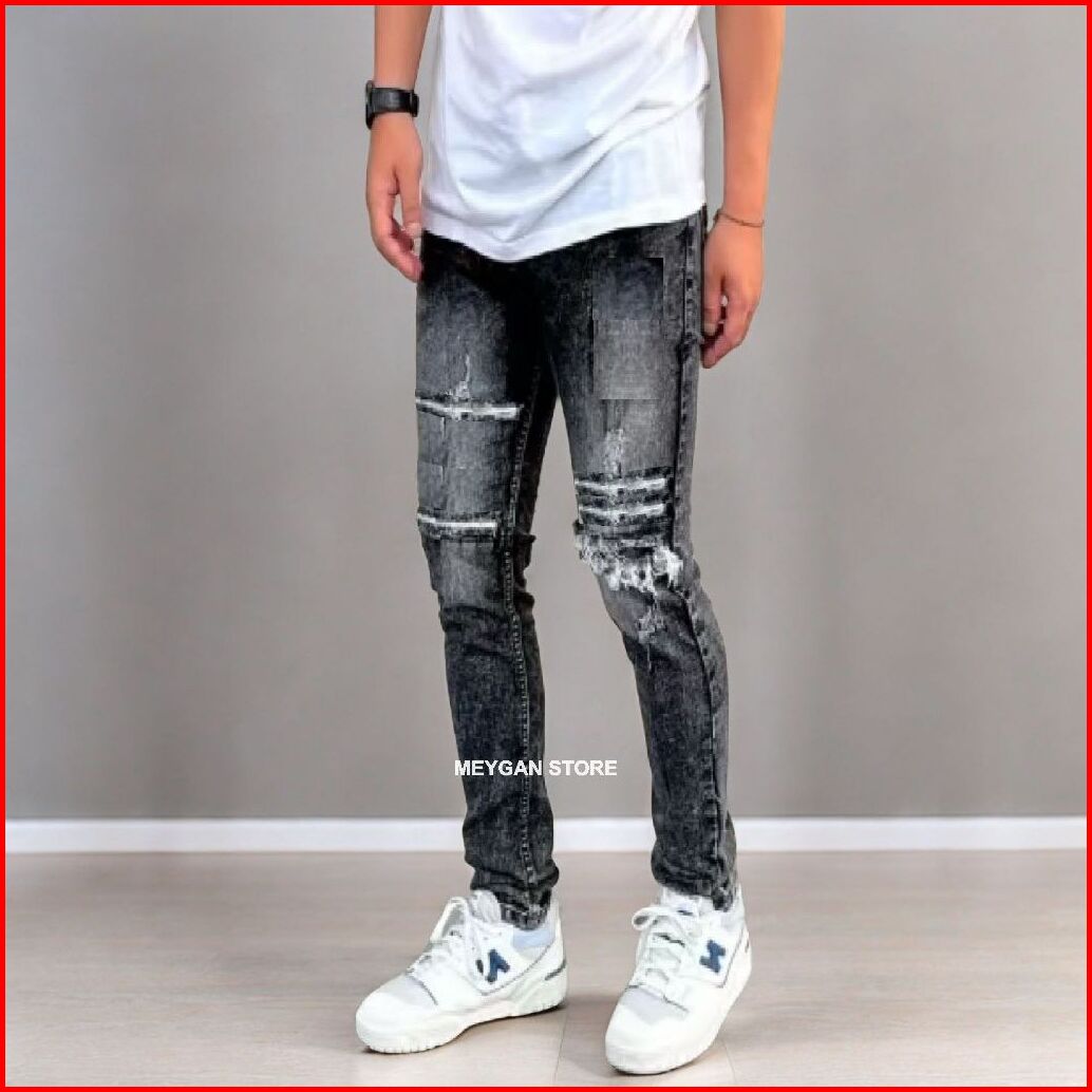 Celana Jeans Pria Sobek Panjang Ripped Ngaret Tidak Tembus Slim Fit Skinny