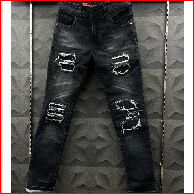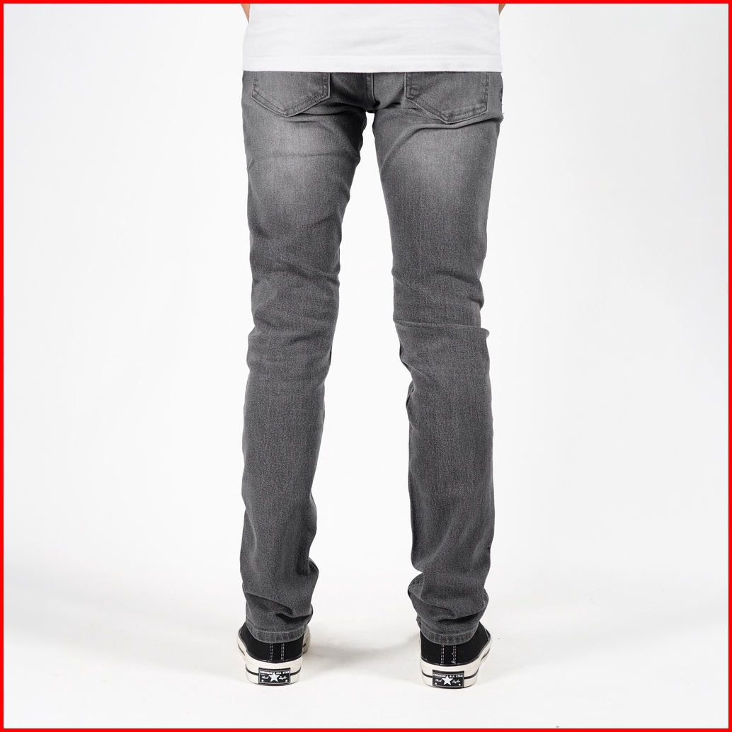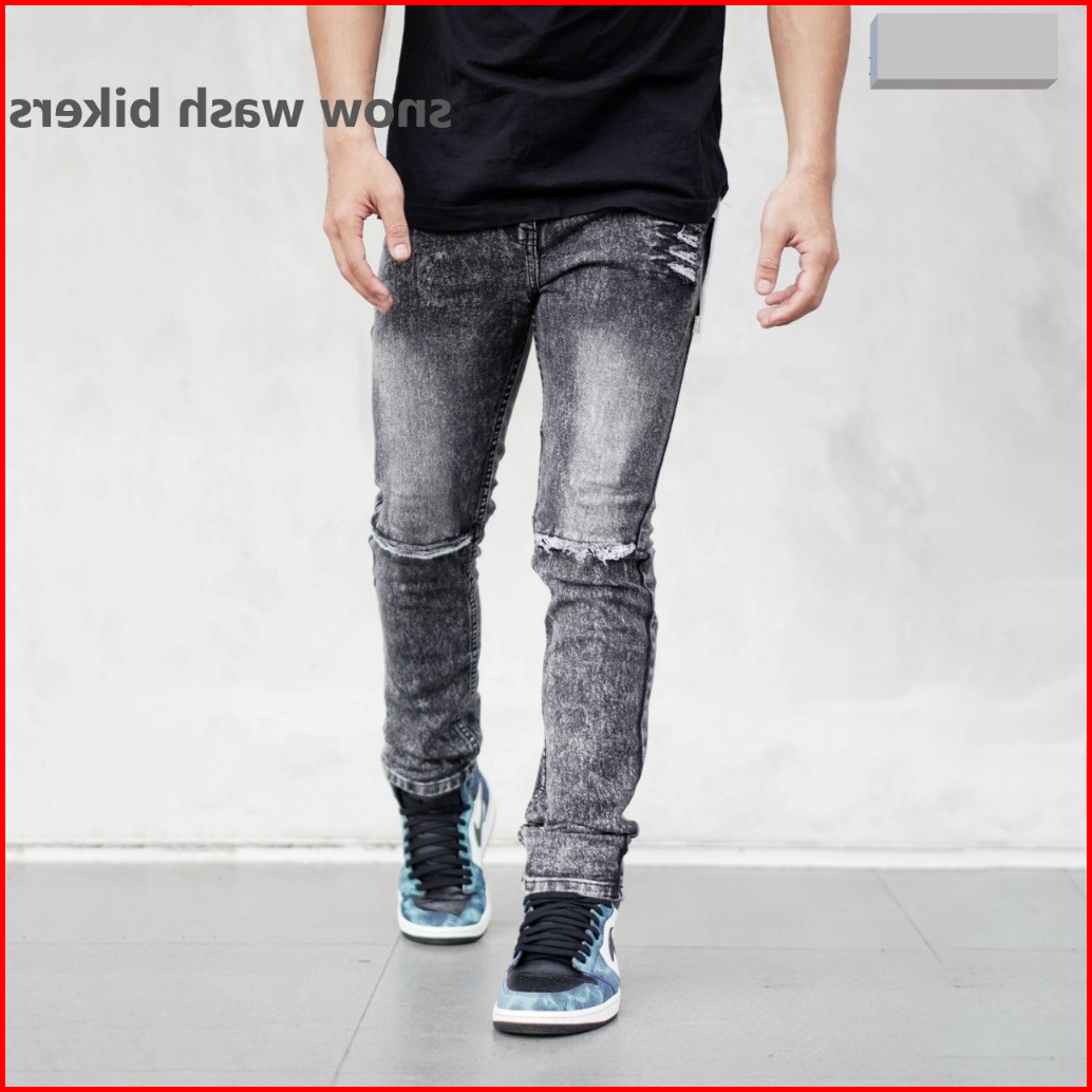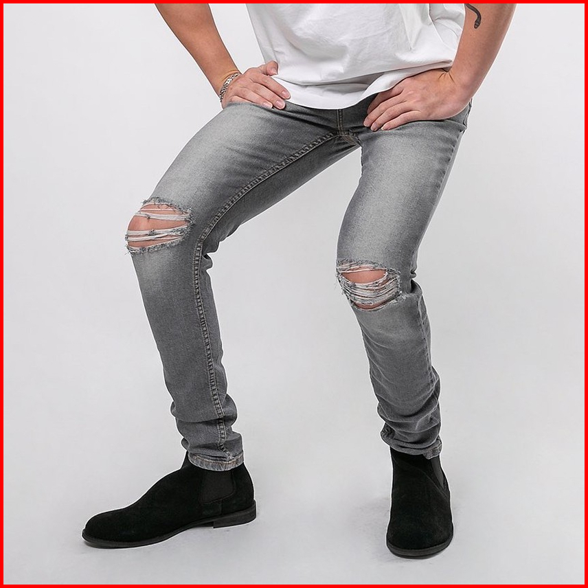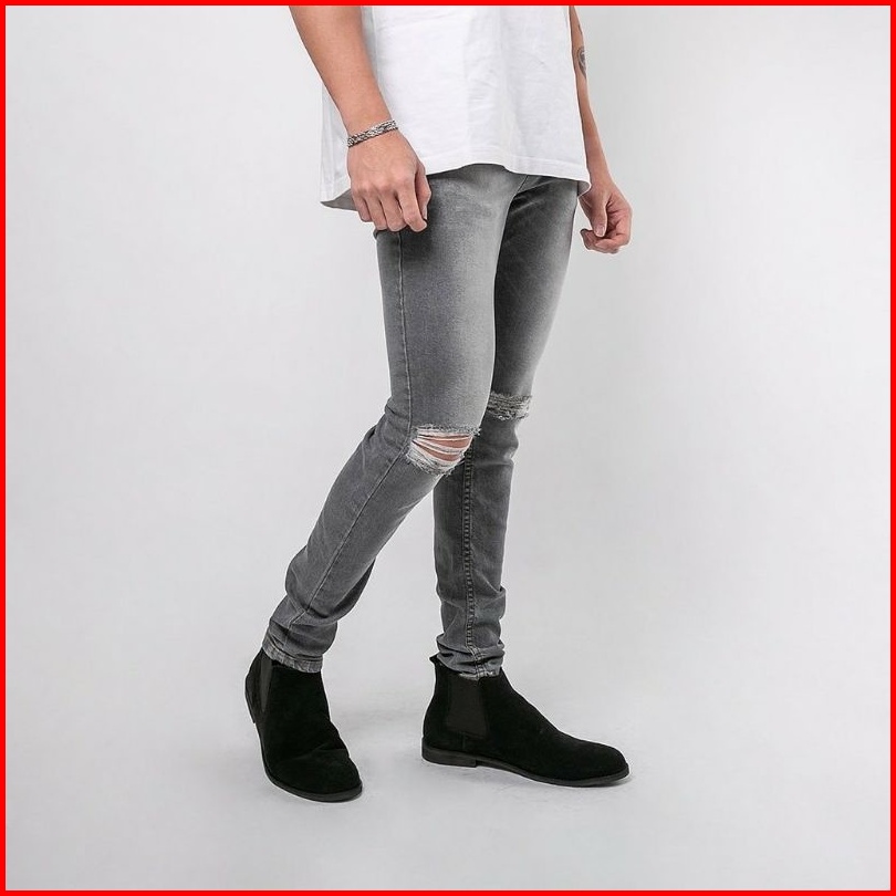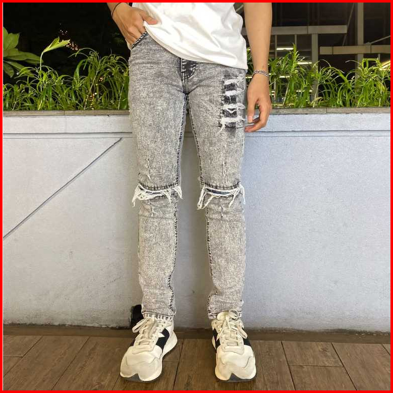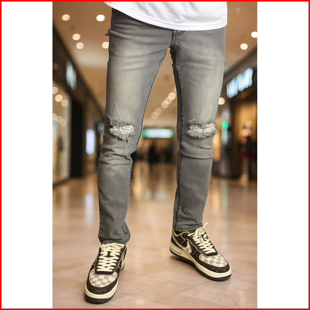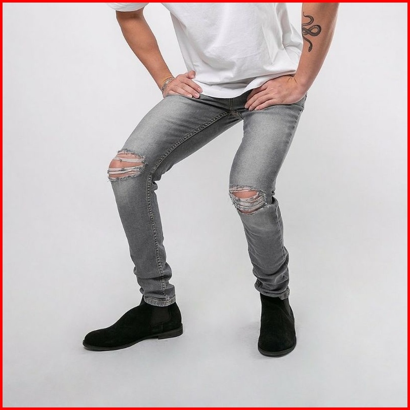 Celana Jeans Pria Grey Wash Ripped Slim Fit Gaya Kasual Modern Trendy