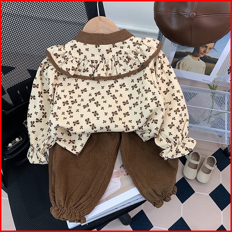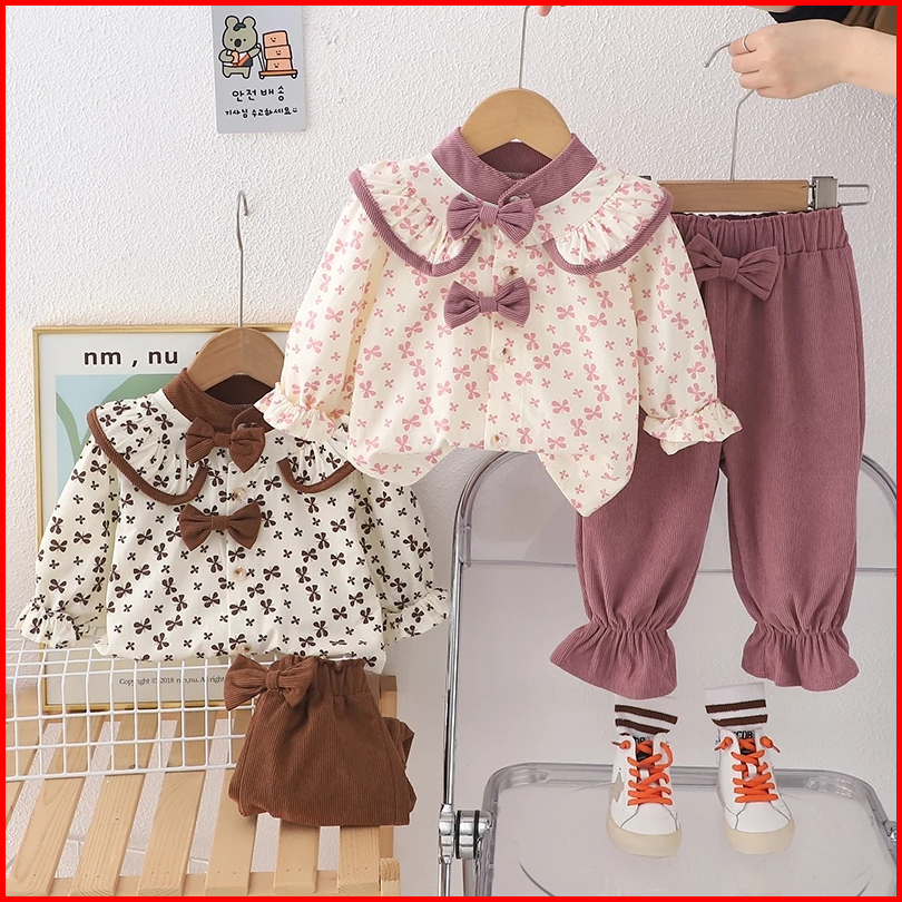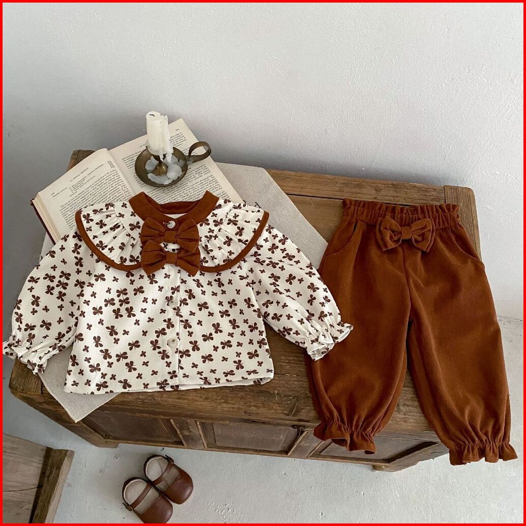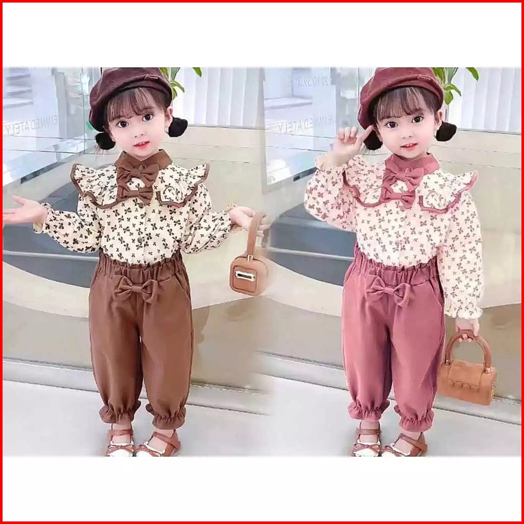 Joyfultots Setelan Anak Gaya Korea Atasan Bunga Pita Gaya Barat Celana Kasual Anak Perempuan Set