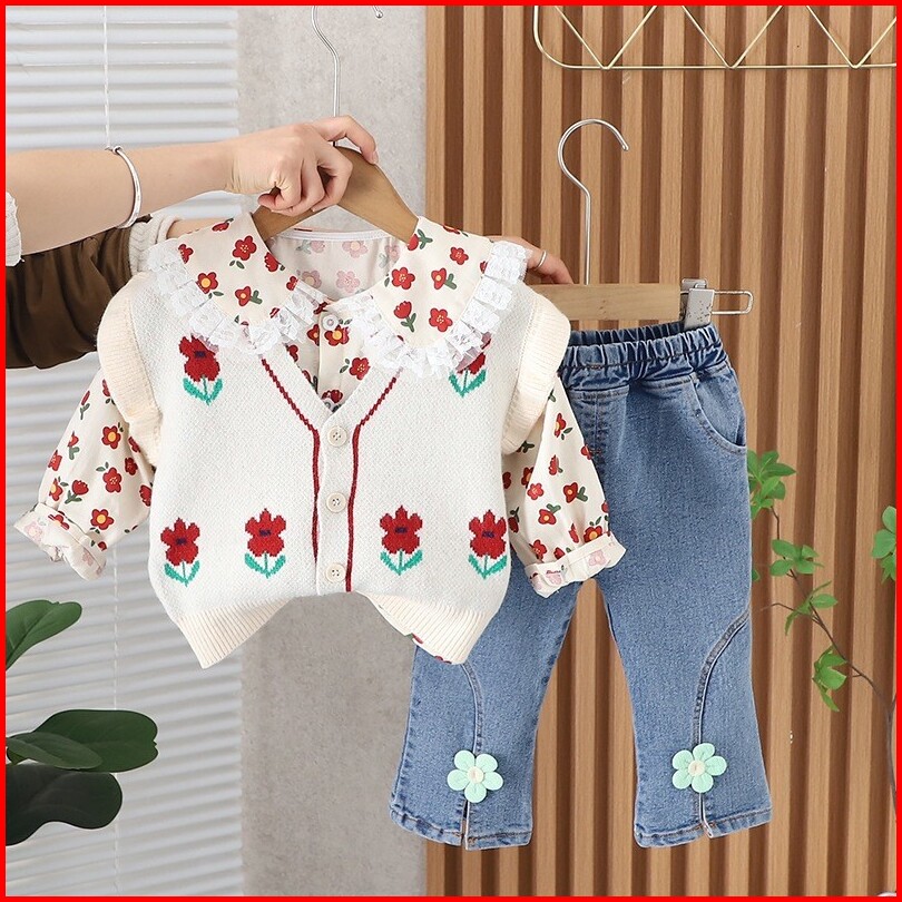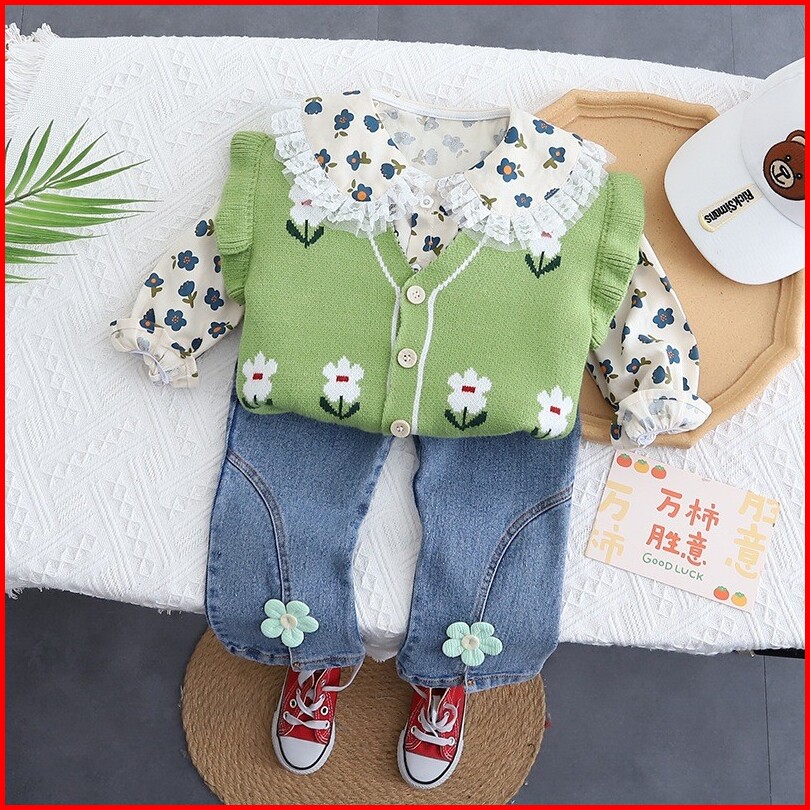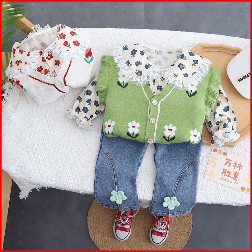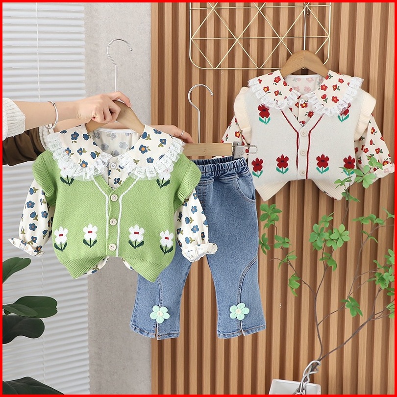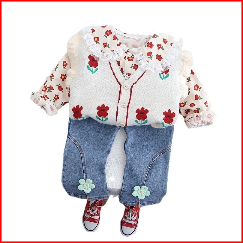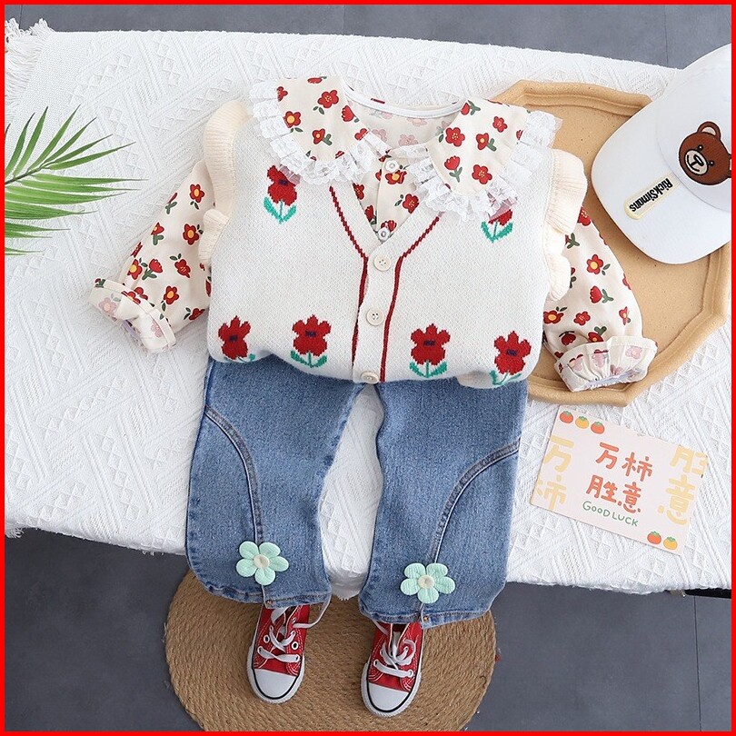 Joyfultots Setelan Lengan Panjang Anak Perempuan Sweter Kardigan Gaya Korea Kemeja Celana Denim