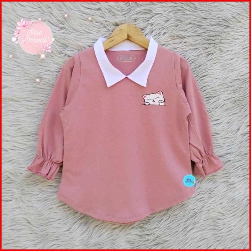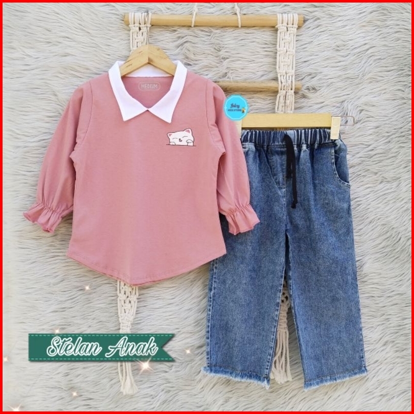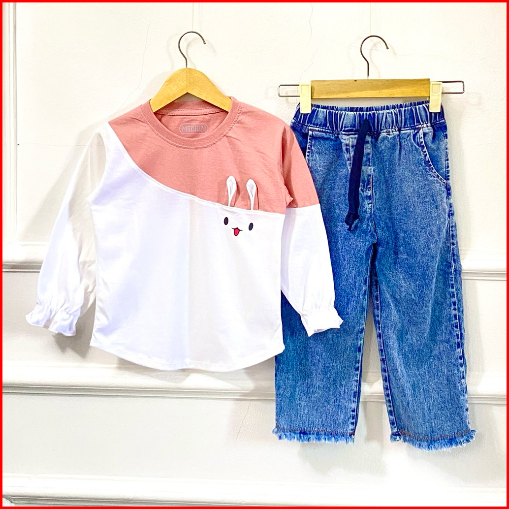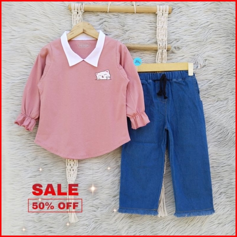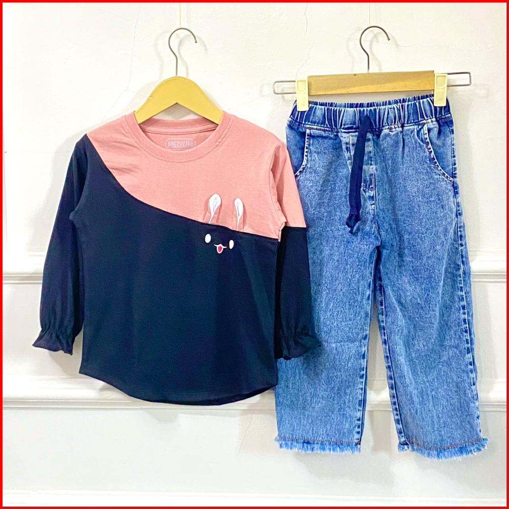Setelan Baju Anak Perempuan Lengan Panjang Usia 3-12 Tahun Celan Kulot Denim Anak