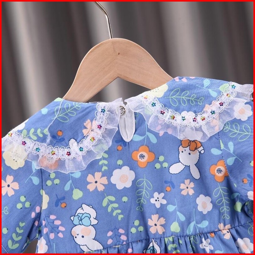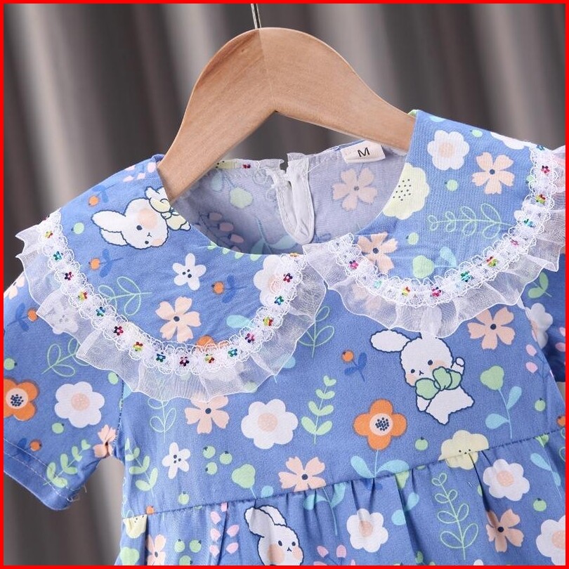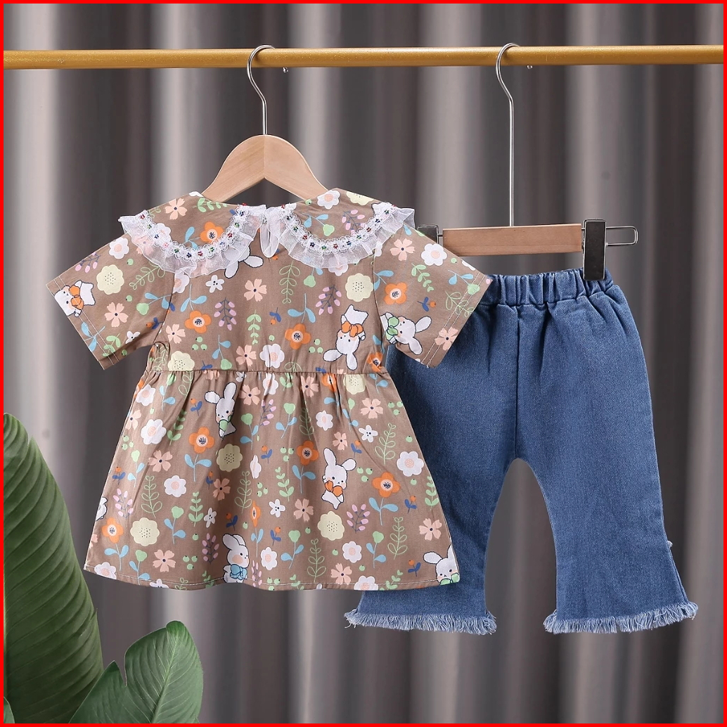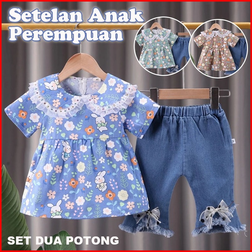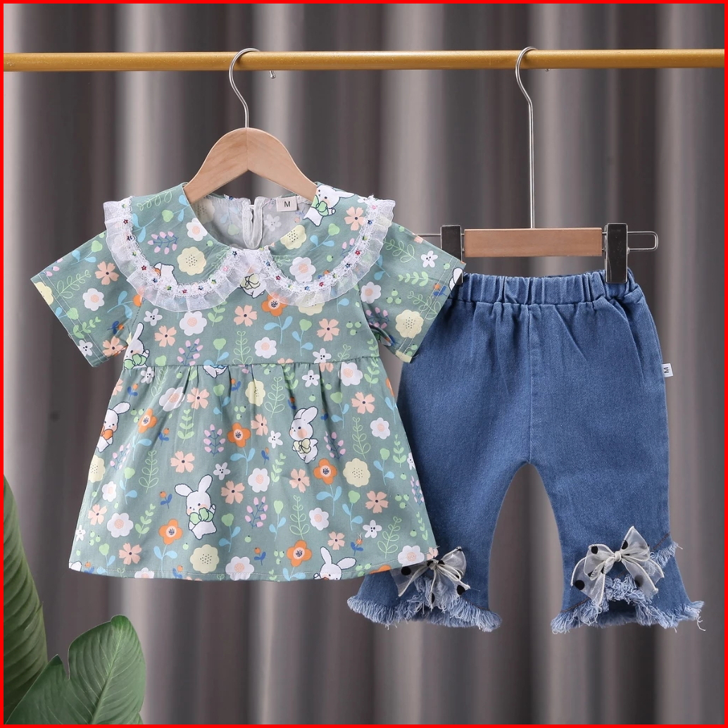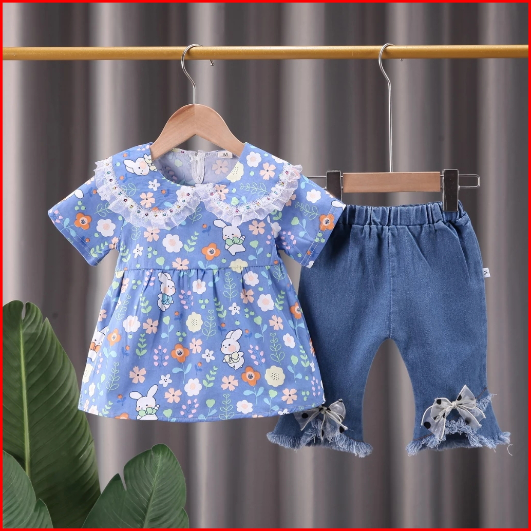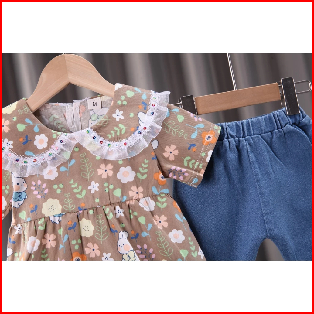 Rainbow Setelan Anak Perempuan Katun Jeans Motif Bunga Lengan Pendek Renda Import Casual Style