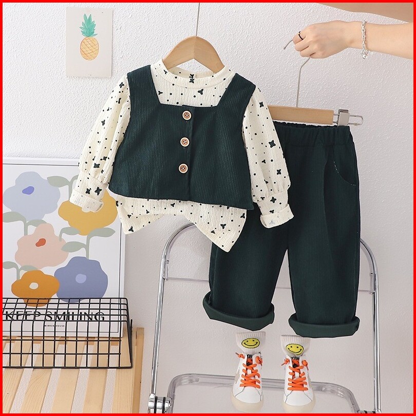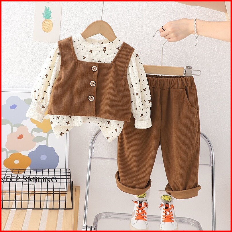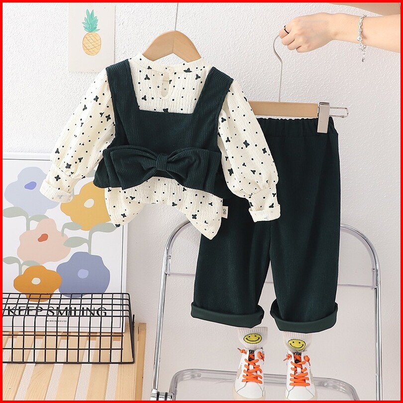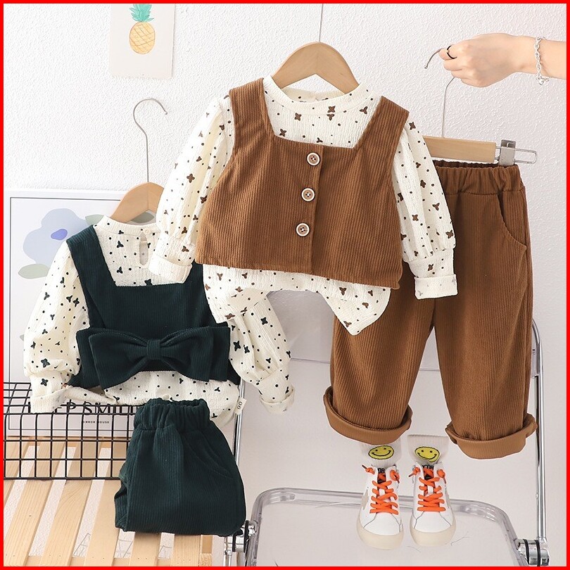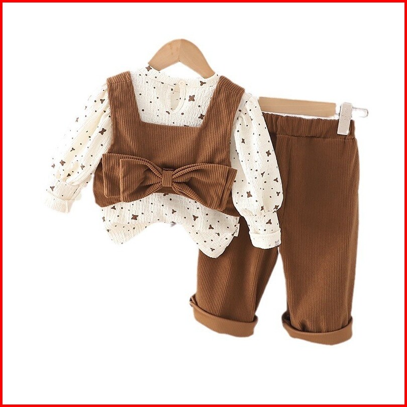 Joyfultots Setelan Anak Perempuan Rompi Pita Gadis Modis Celana Kemeja Bermotif Lengan Panjang Set