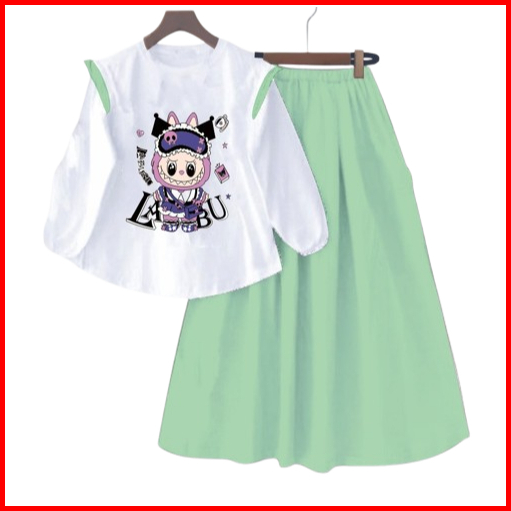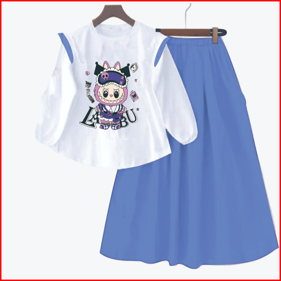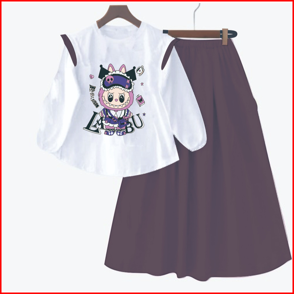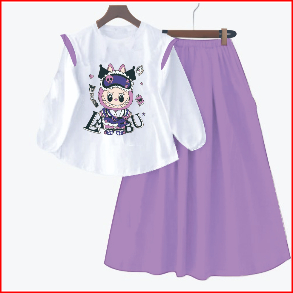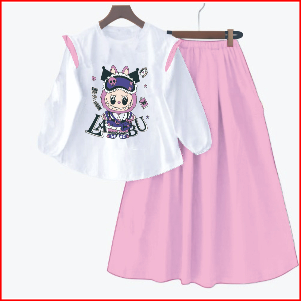 Setelan Rok Labubu Kuromi Set Anak Perempuan Terbaru Bahan Crincle Air Flow Usia 3-12 Tahun Fashion 2024