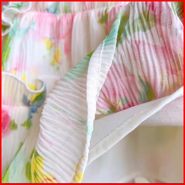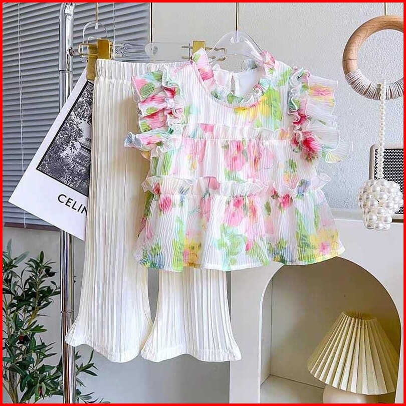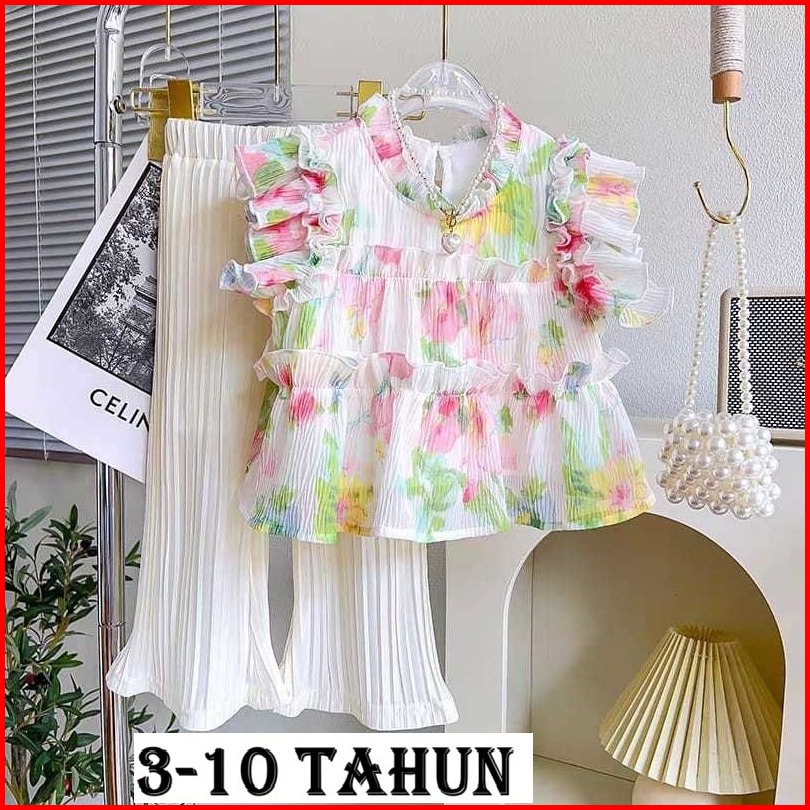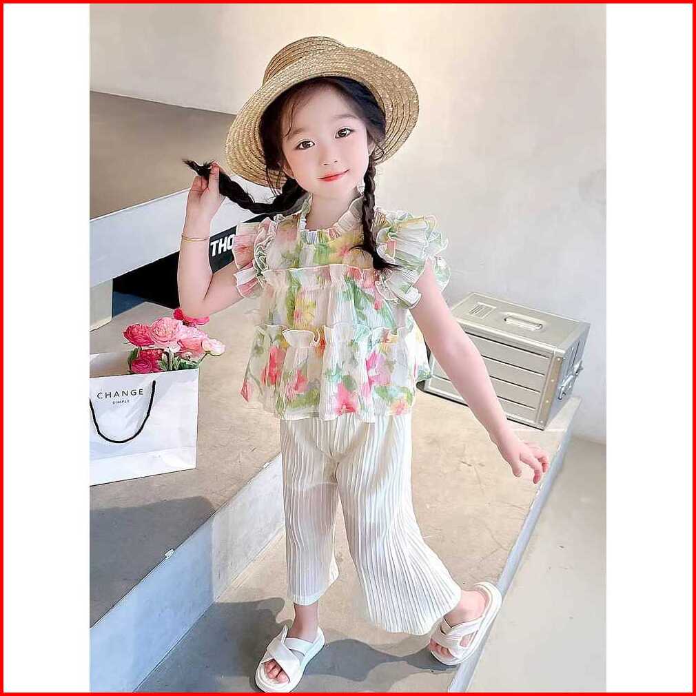 Kd34 Setelan Set Anak Perempuan Blouse Ruffle Oversize Celana Plisket Bunga Vibrant