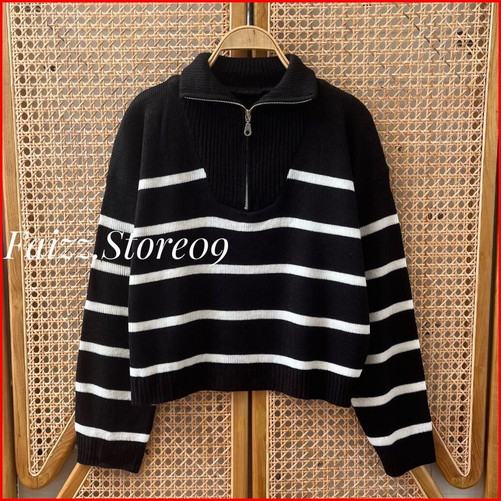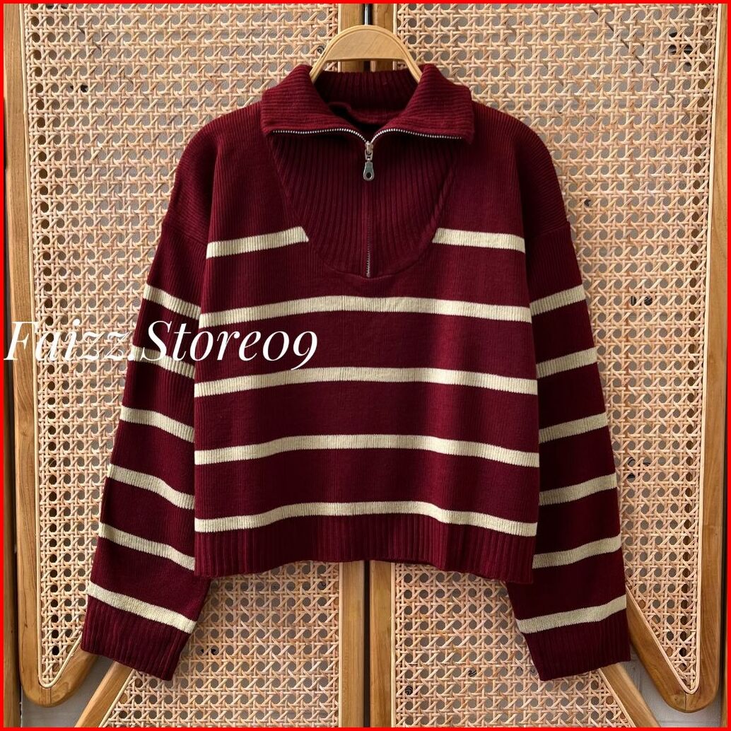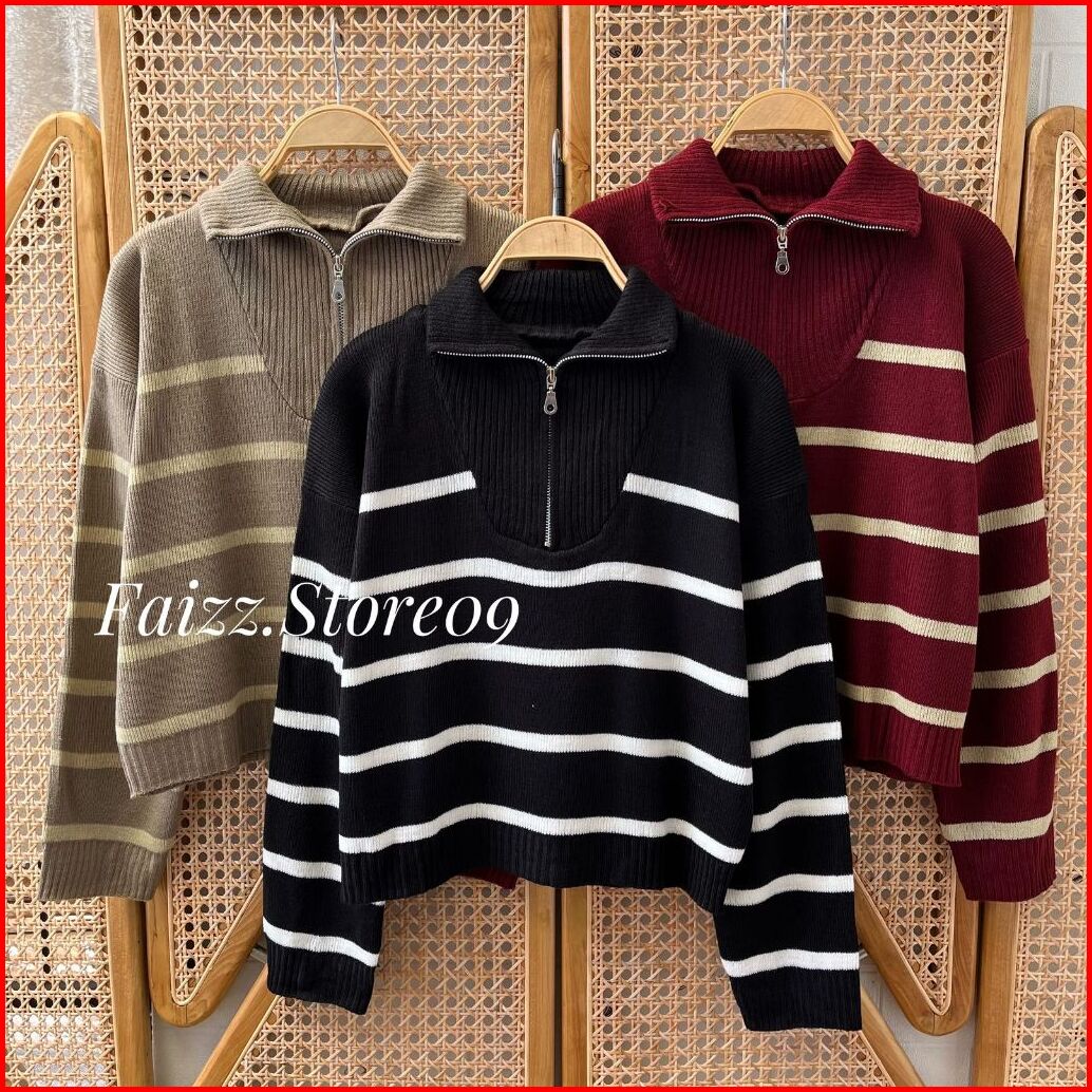 Aira Sweater Knit Zipper Motif Stripe Crop Premium Atasan Rajut Wanita Resleting Korean Style