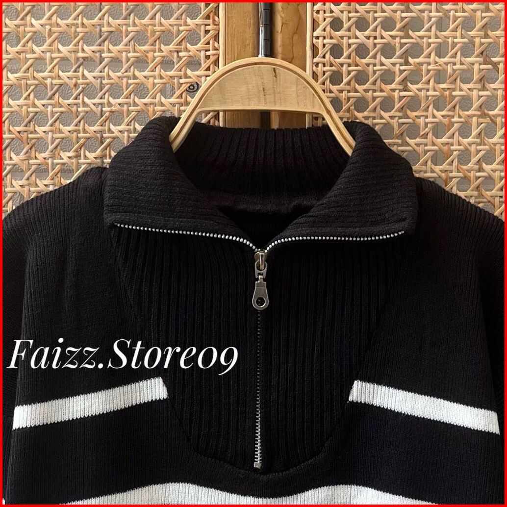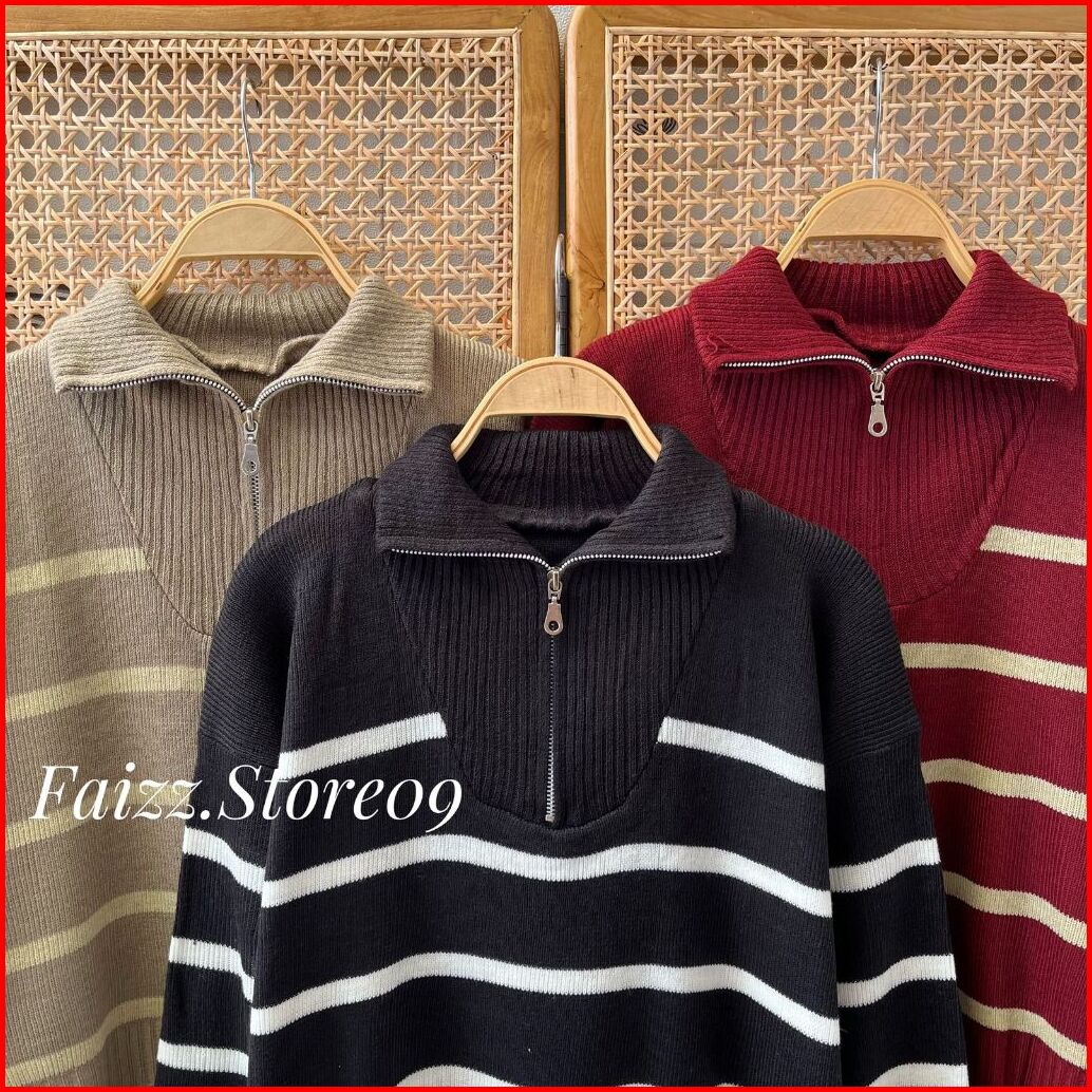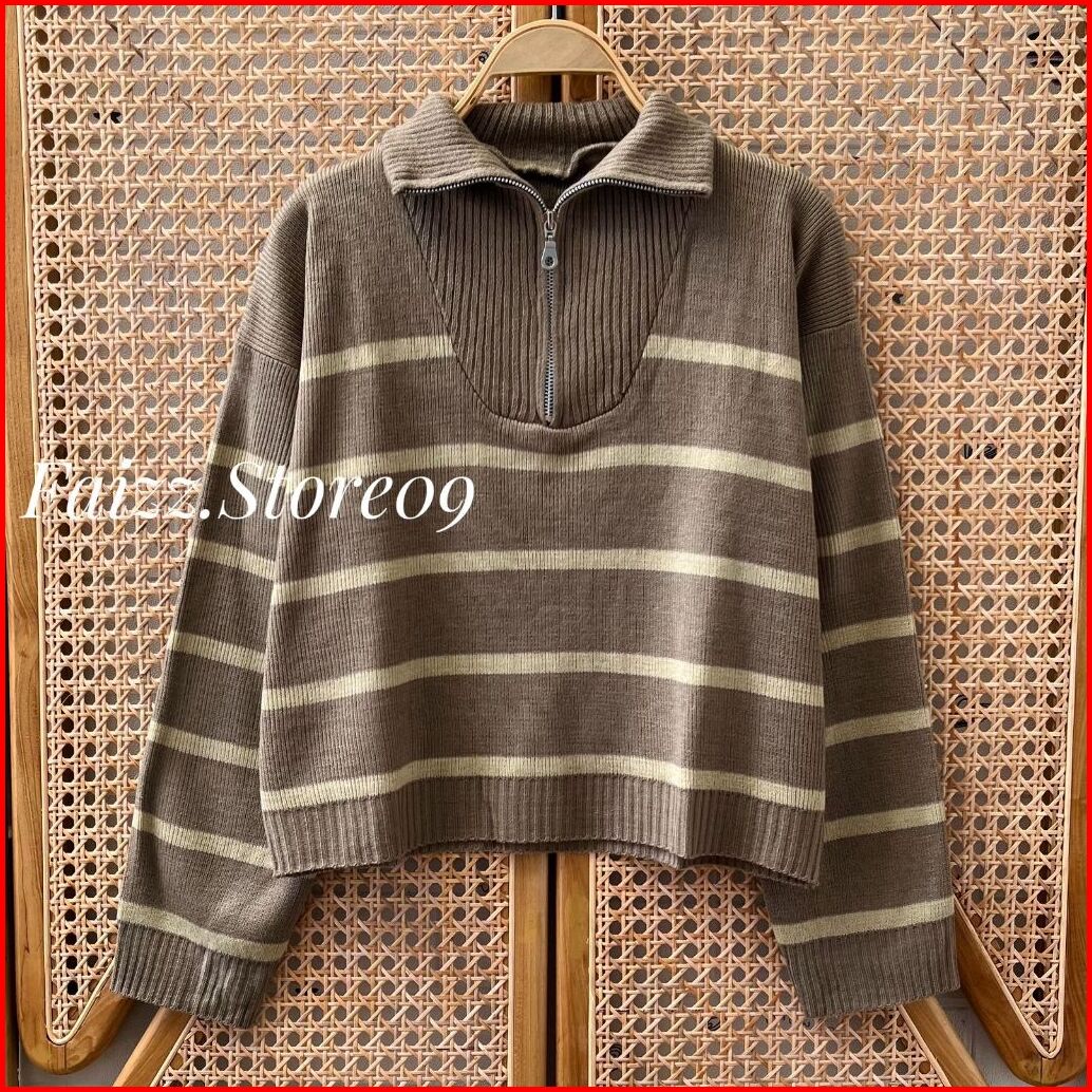 Aira Sweater Knit Zipper Motif Stripe Crop Premium Atasan Rajut Wanita Resleting Korean Style