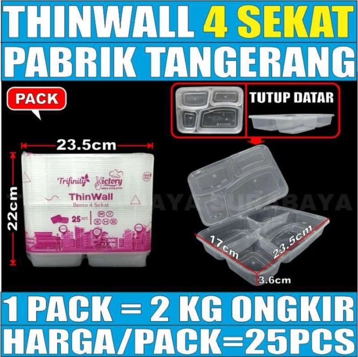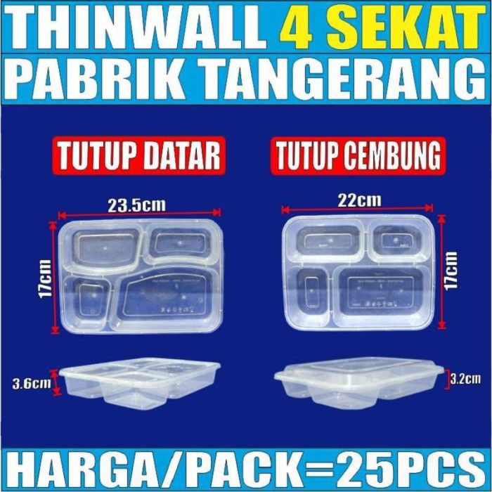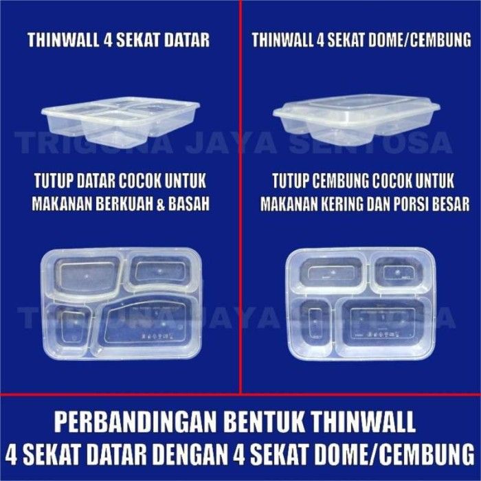Thinwall 4 Sekat Tutup Datar / 4sekat Cembung Per Pack Bento Plastik - 4 Sekat Rata