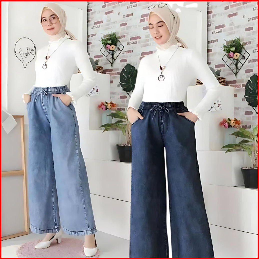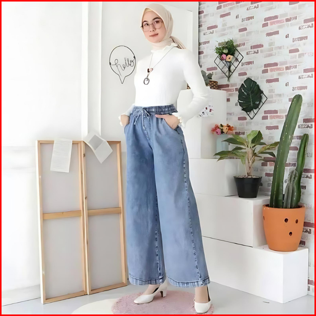 Karinafashion - Celana Kulot Jeans Size Jumbo Tali Serut Pinggang Full Karet Model Hight Waist Terbaru Wanita Modern 202