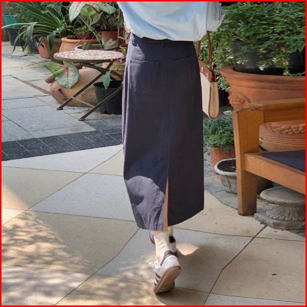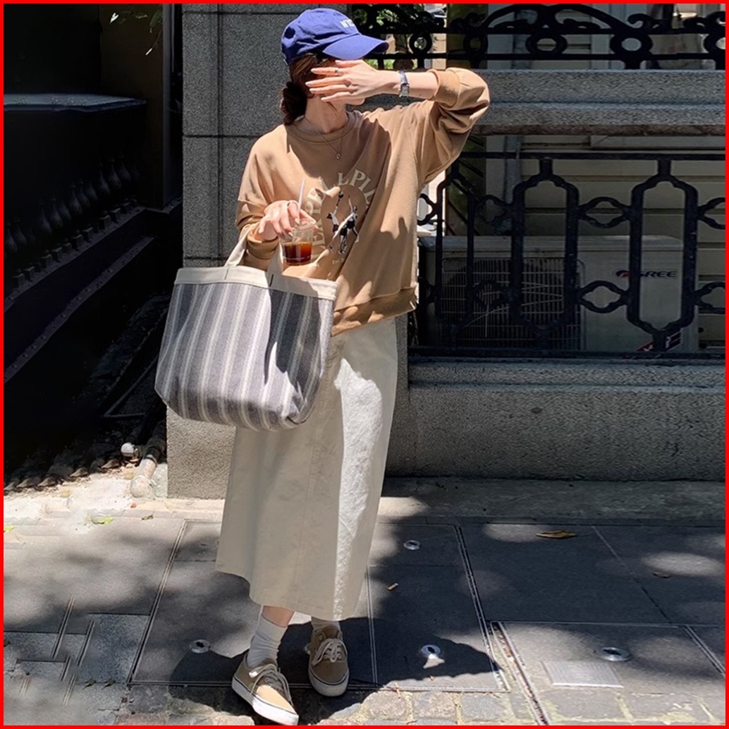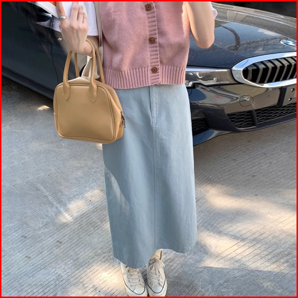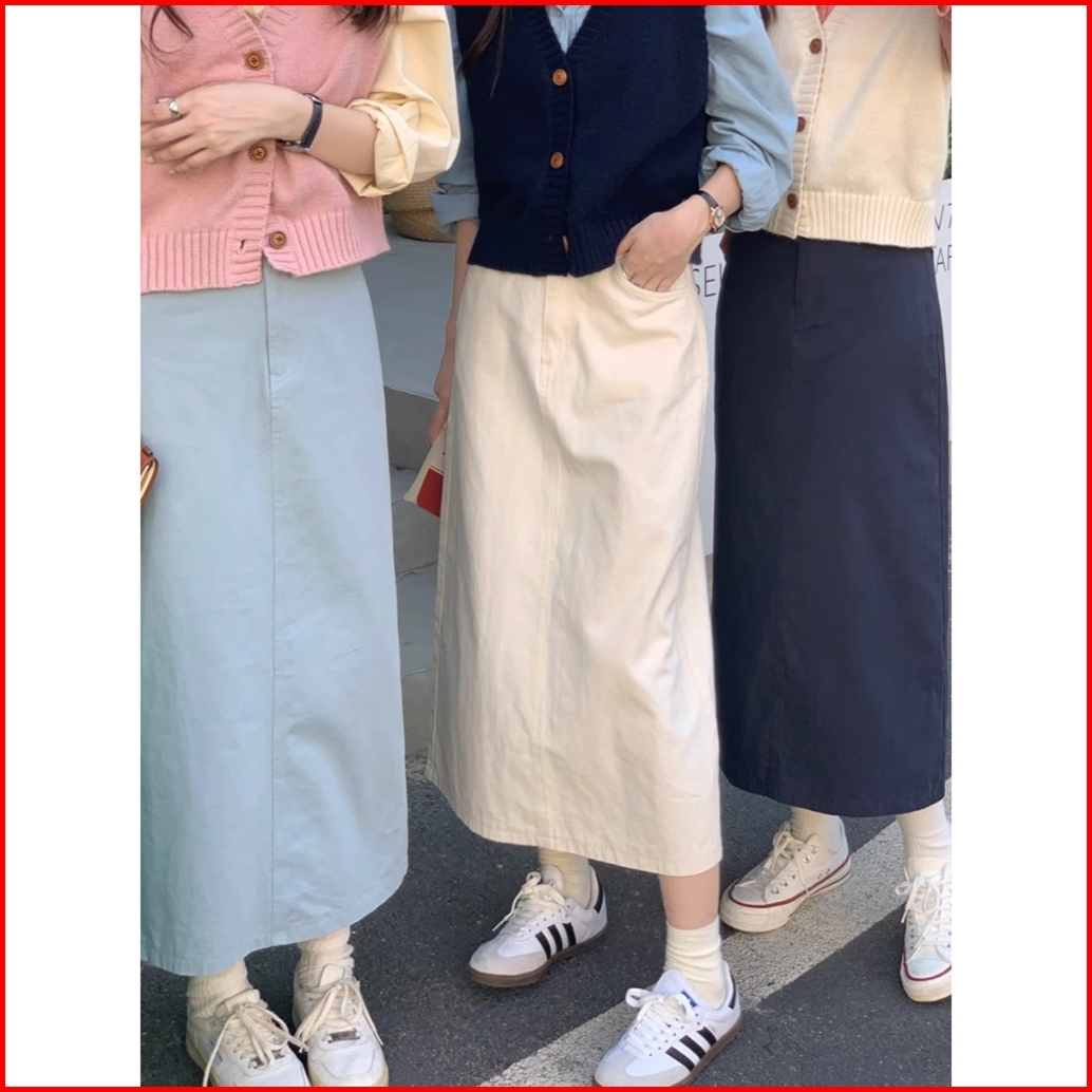 Rok Denim A-line Kasual Lurus Longgar Pinggang Tinggi Gaya Korea Yang Sederhana Dan Modis Rok Cargo Jeans Cream