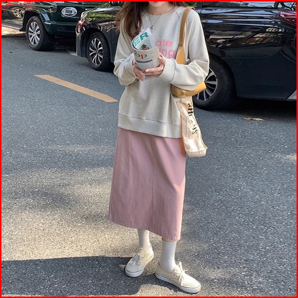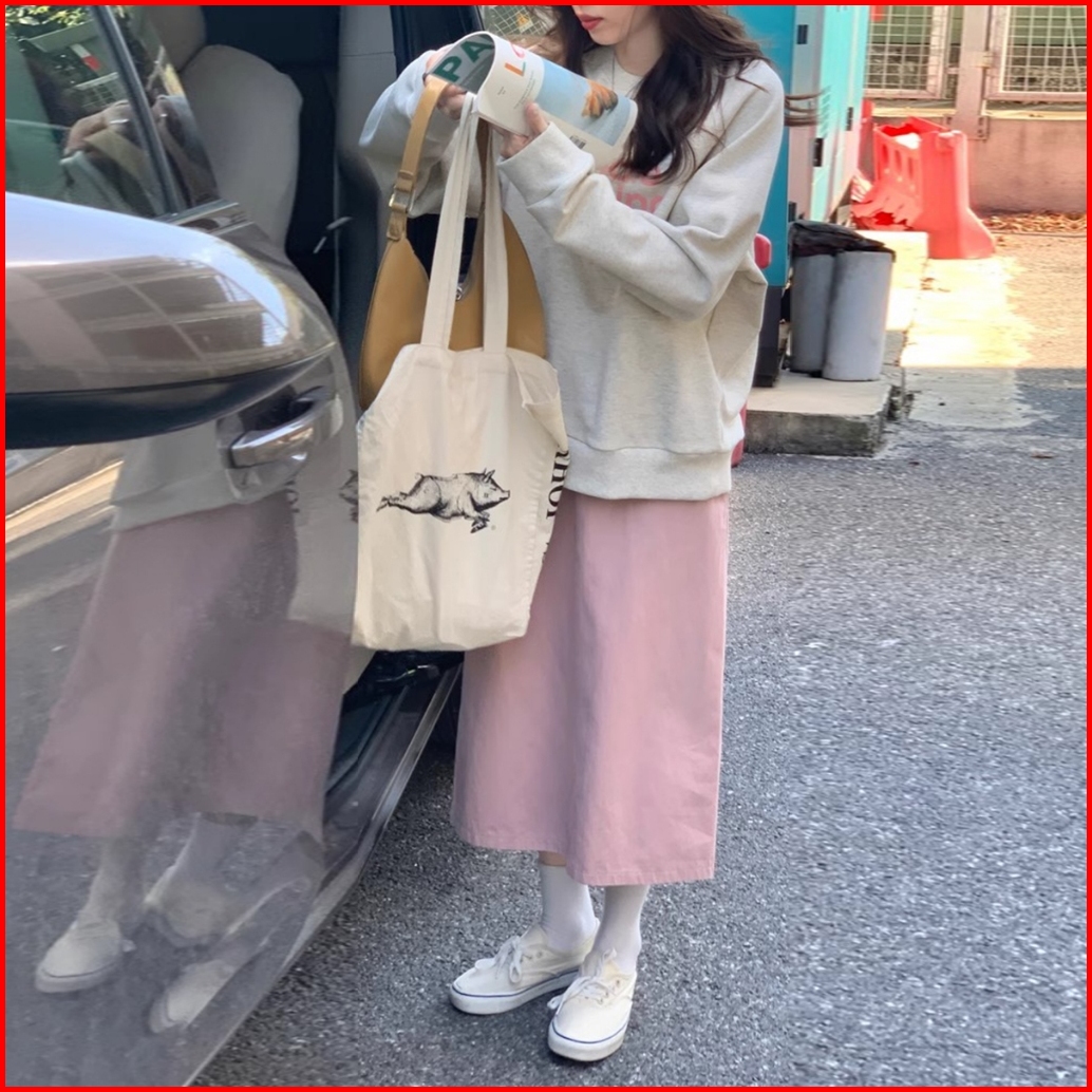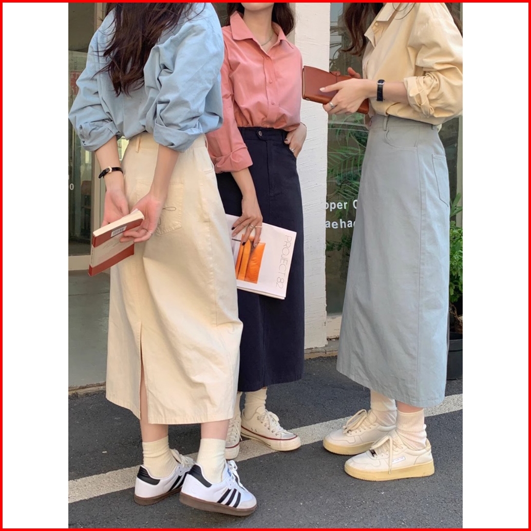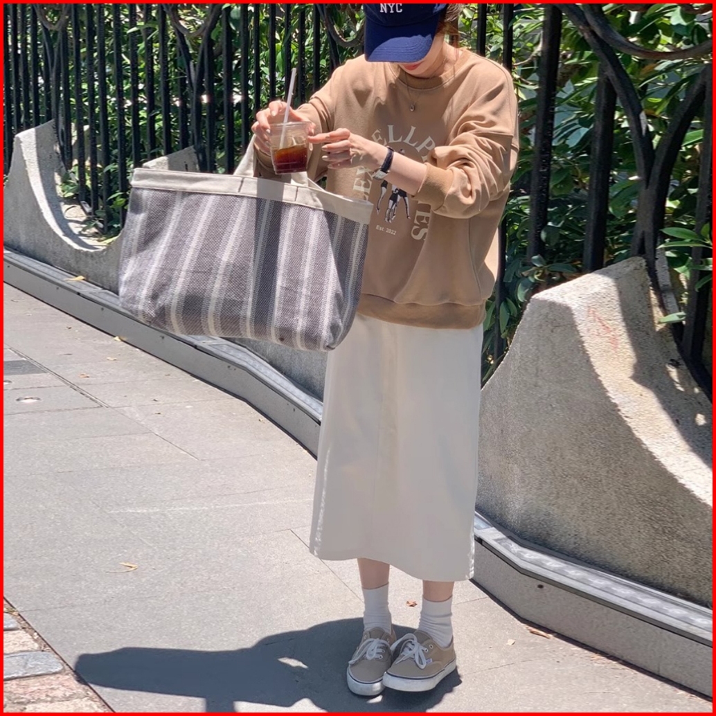 Rok Denim A-line Kasual Lurus Longgar Pinggang Tinggi Gaya Korea Yang Sederhana Dan Modis Rok Cargo Jeans Cream