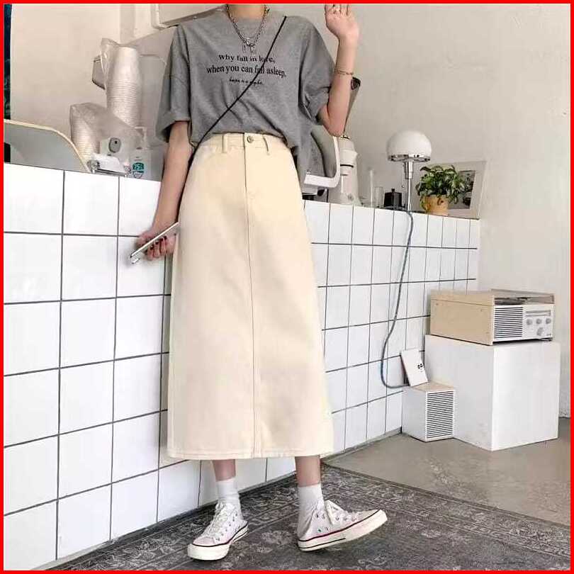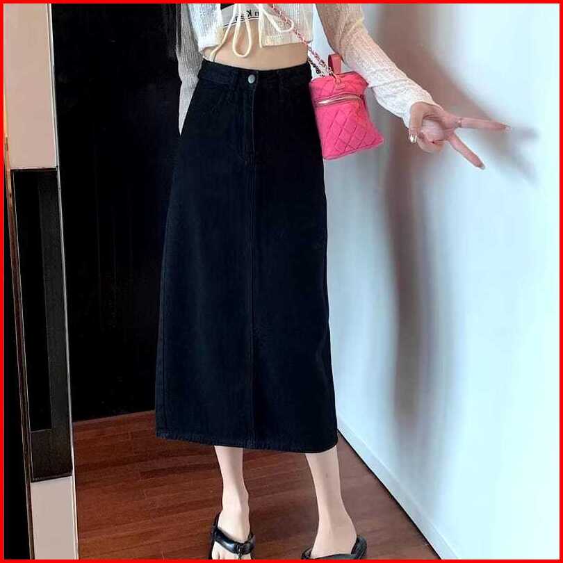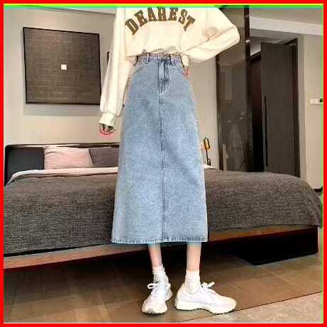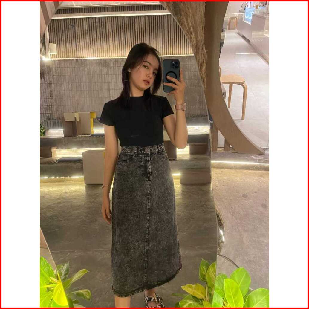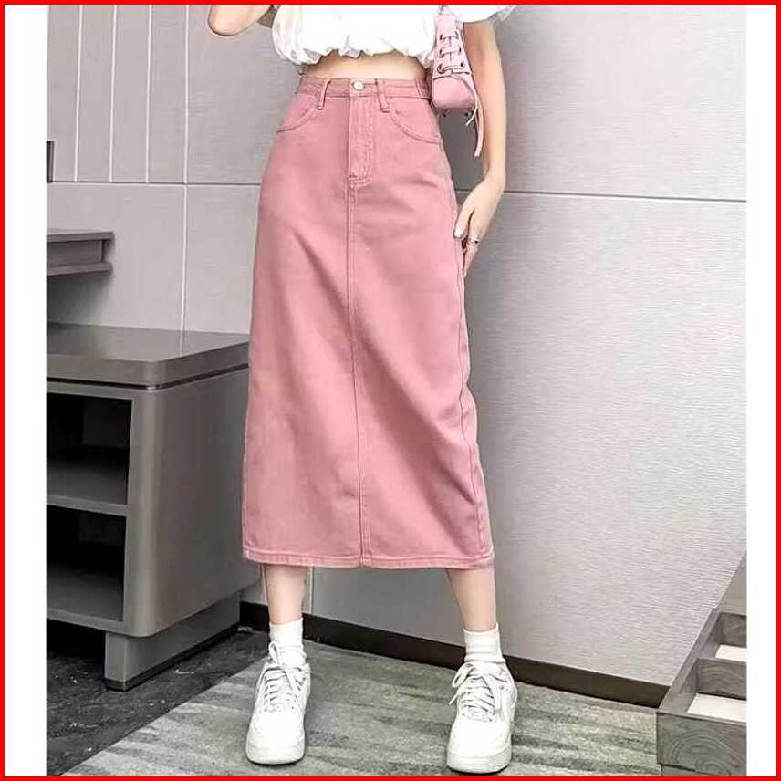 Jeans Rok Wanita Pink Highwaist Rok Midi A-line Denim Split