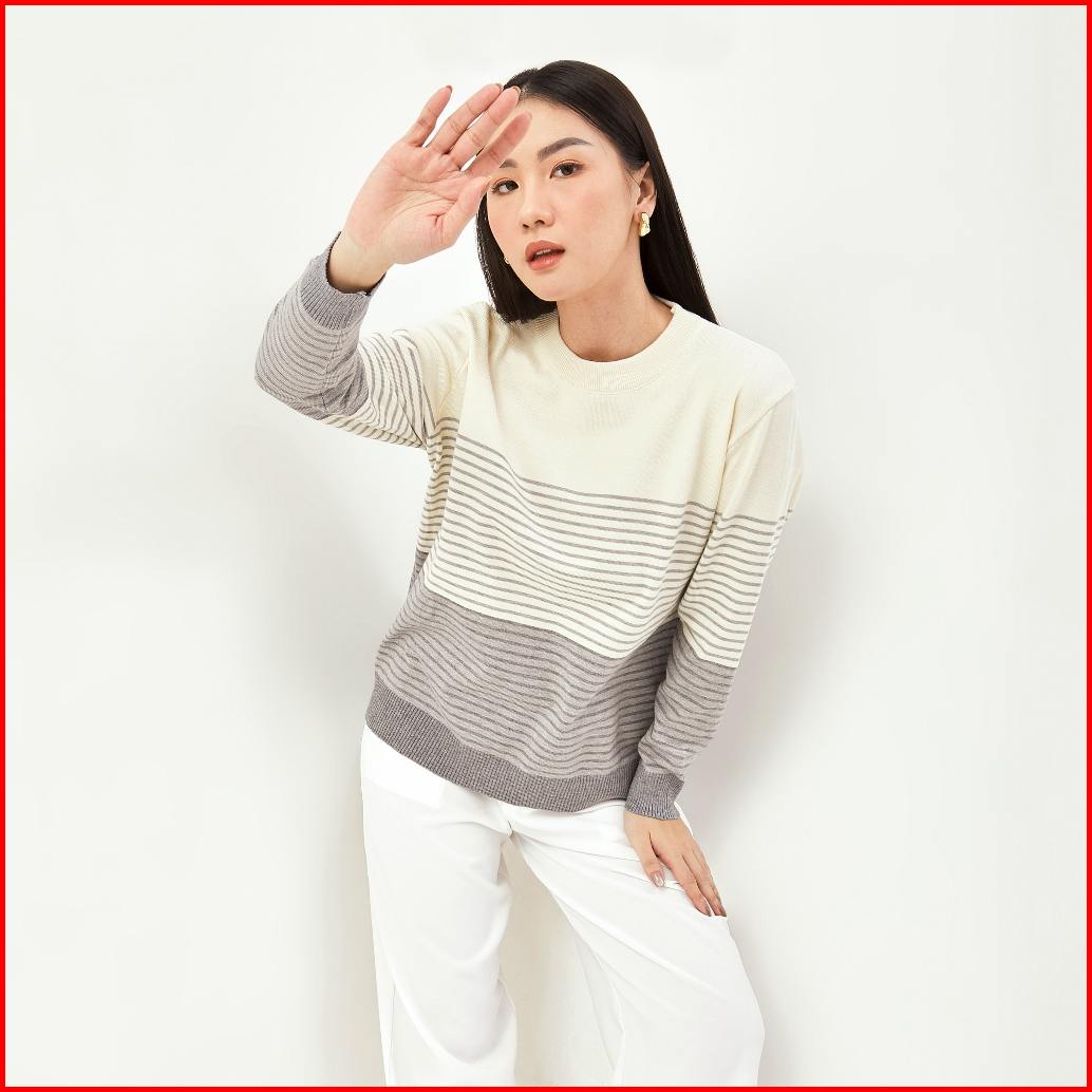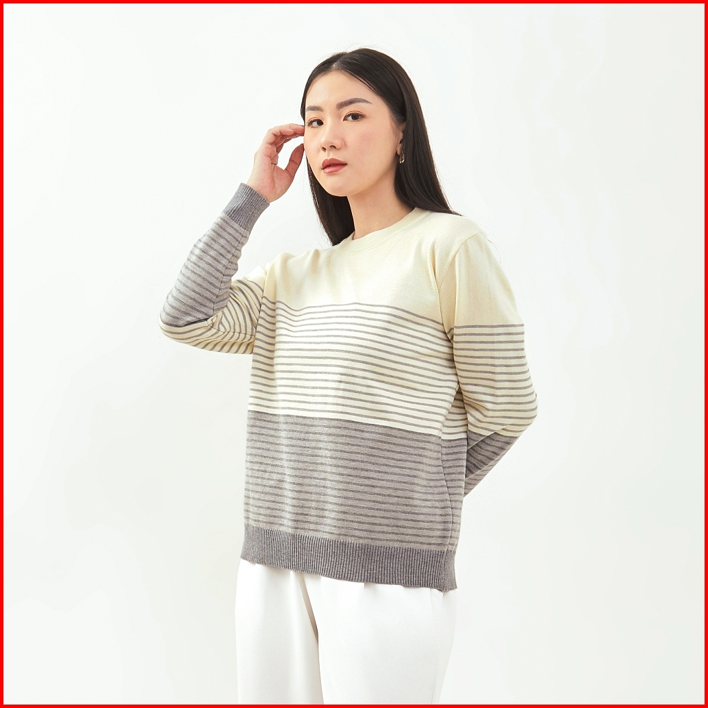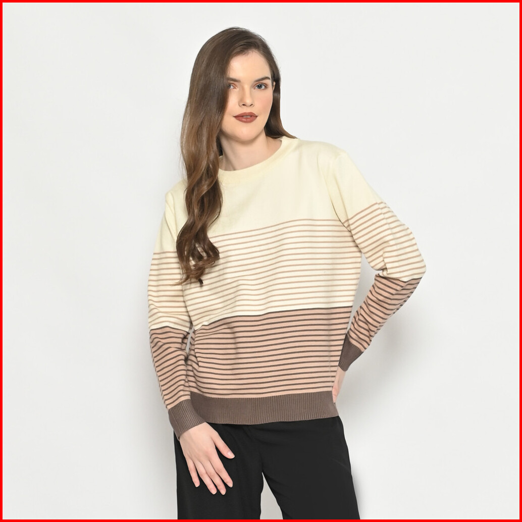 Queentin Sweater Wanita Rajut 446 Stretch Cashmere Knit Motif Salur Lengan Panjang