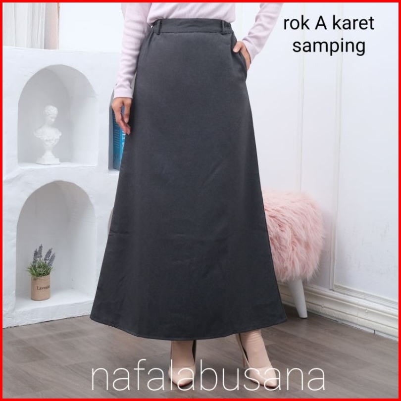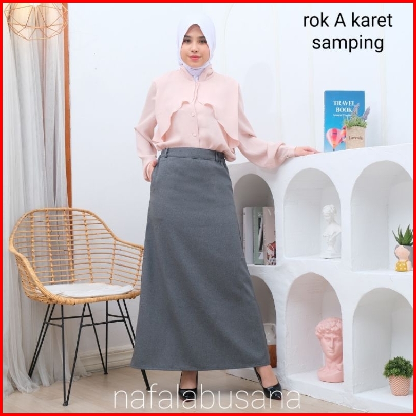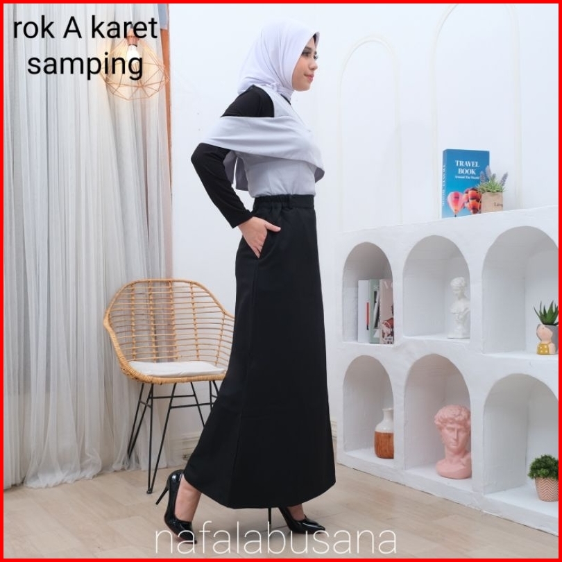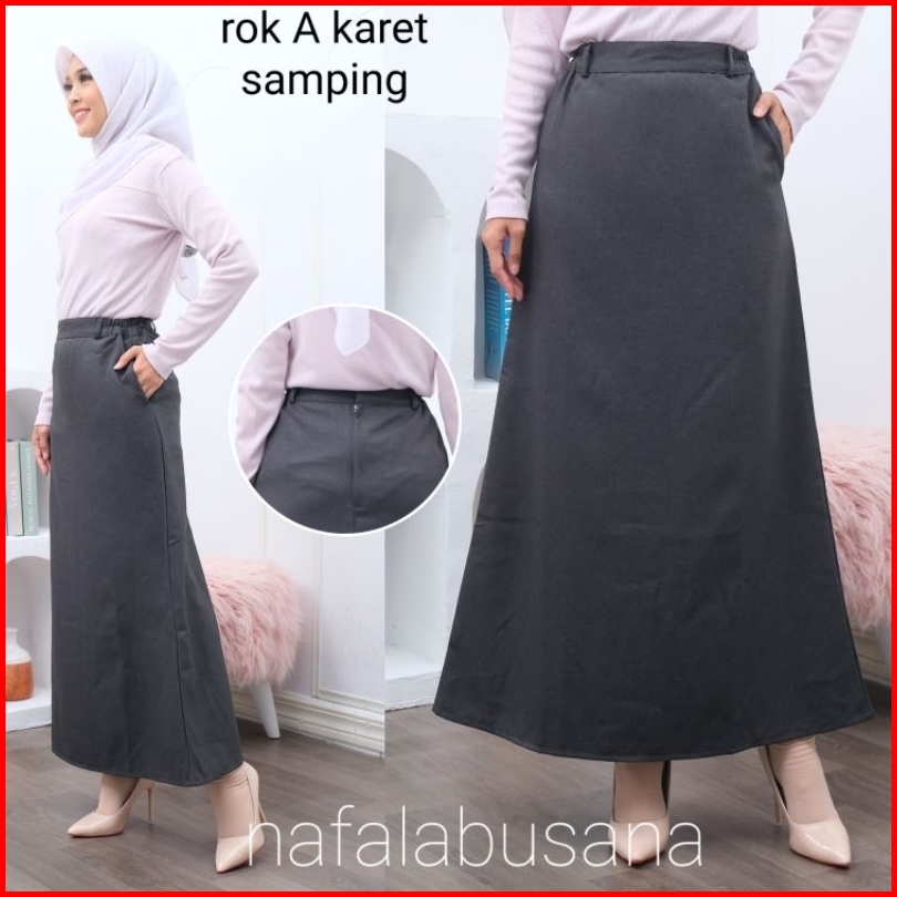 Rok Kerja Wanita A Line Ada Kantong Pinggang Karet Samping
