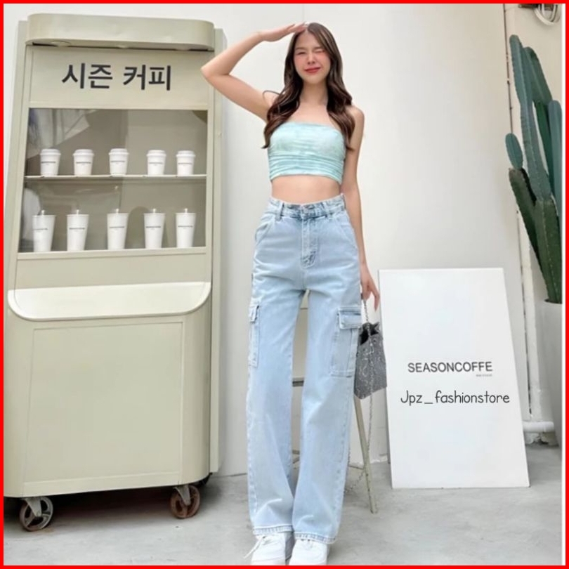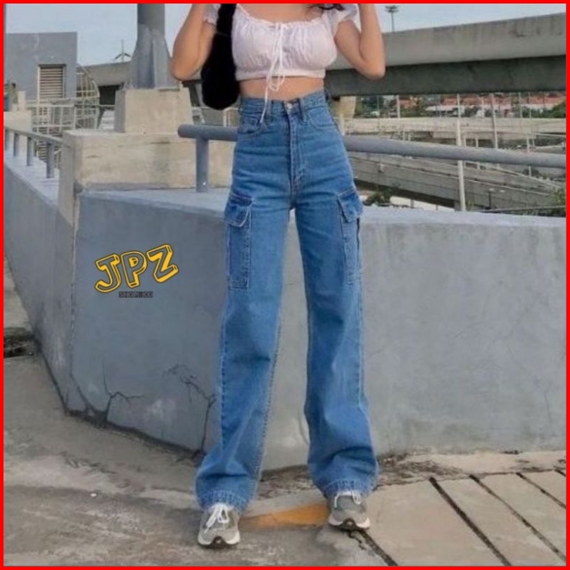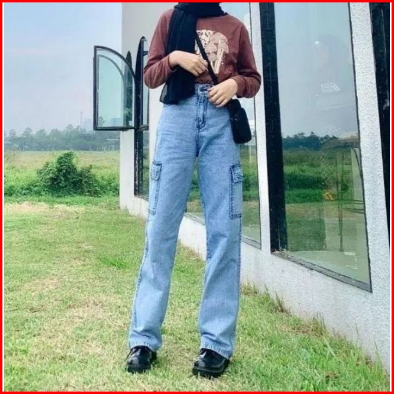 Celana Cargo Jeans Higwaist Wanita Celana Jeans Saku Tempel Terbaru Viral