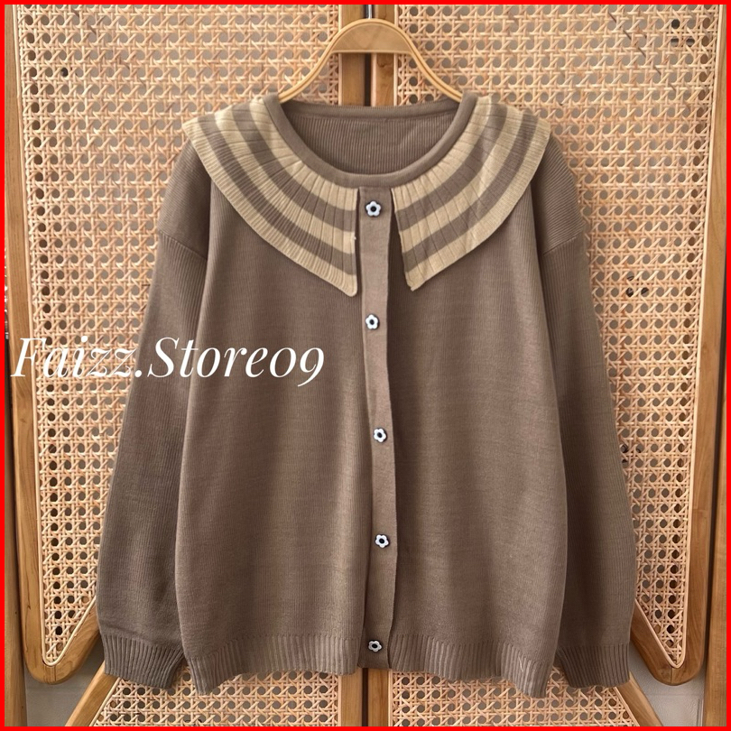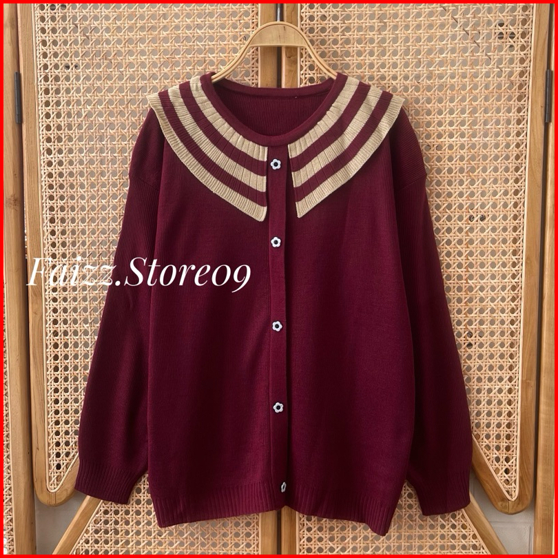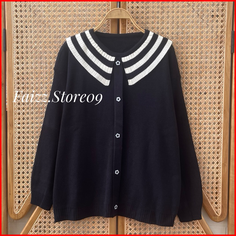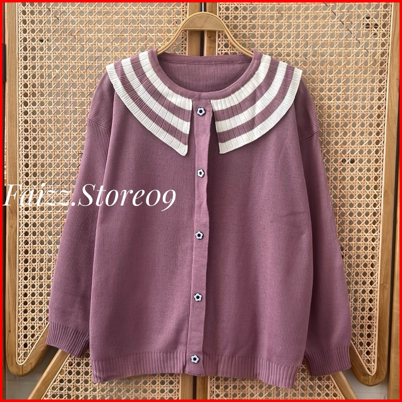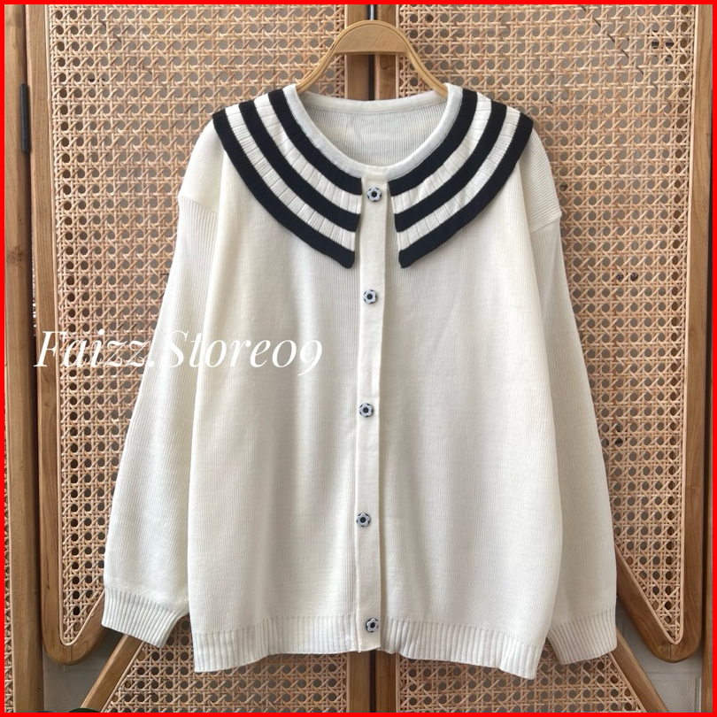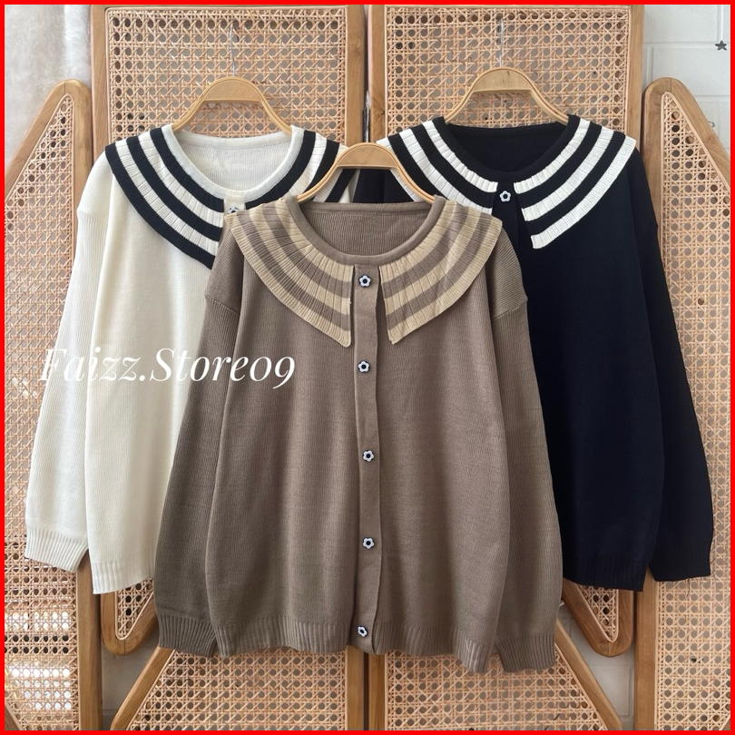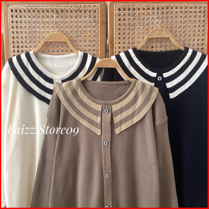 Gardena Knits Premium Sweater Rajut Oversize Motif Kancing Kerah Stripe Lengan Panjang Wanita