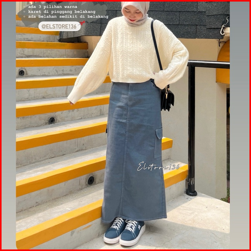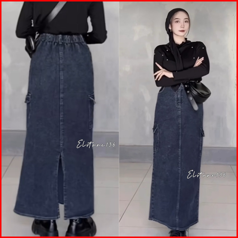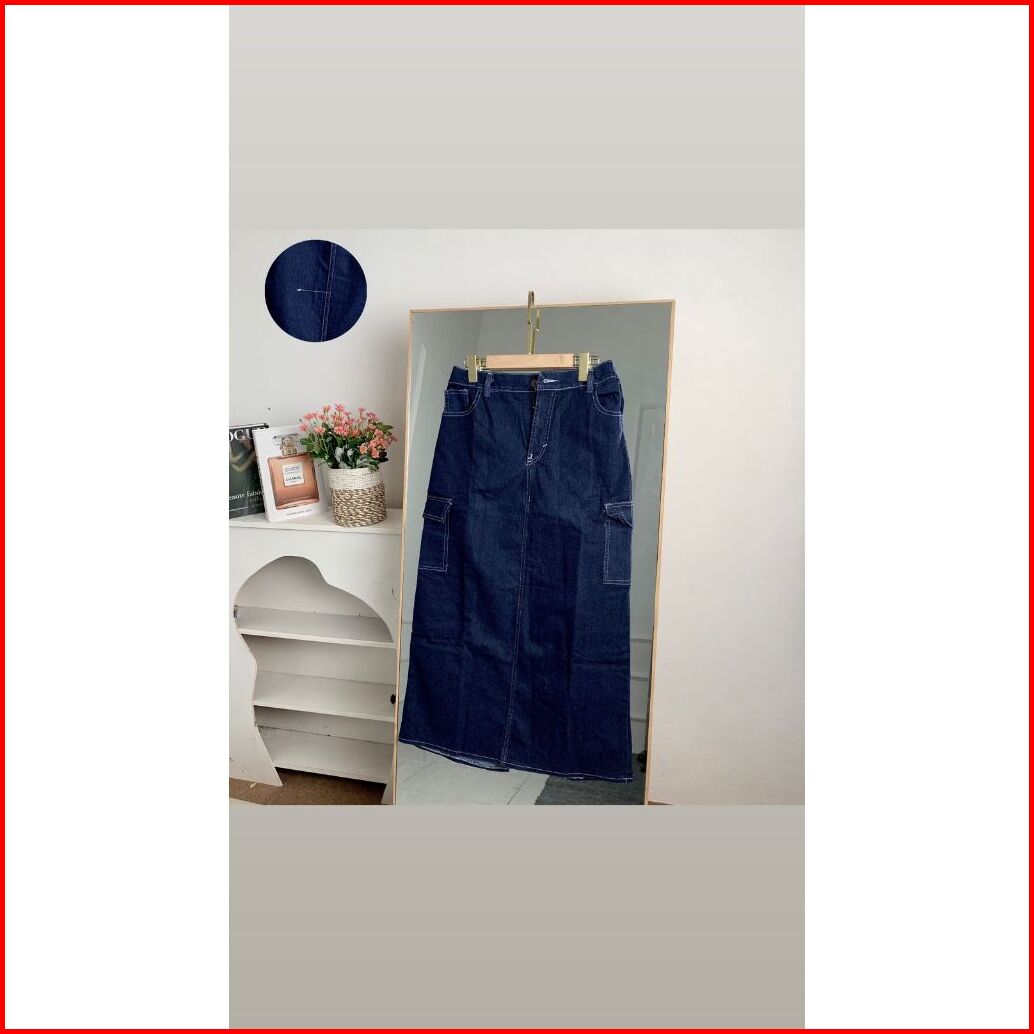 Kenza Highwaist Rok Cargo Jeans Denim Split Panjang Korea Style