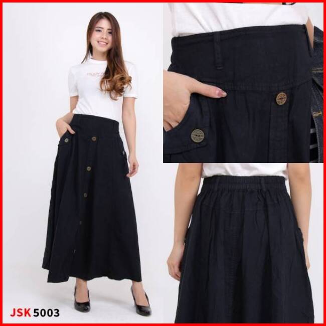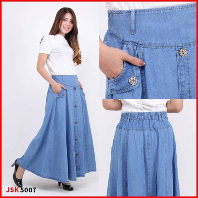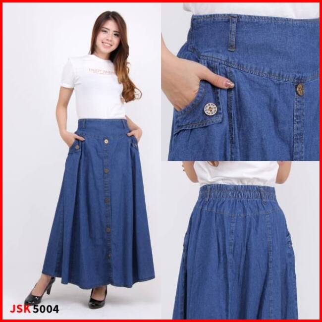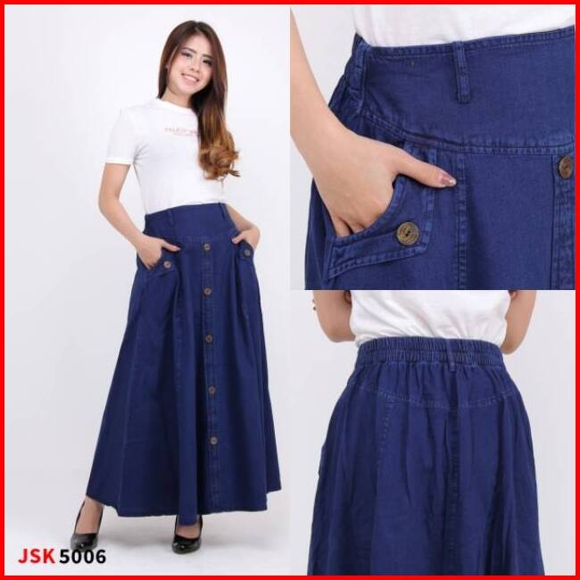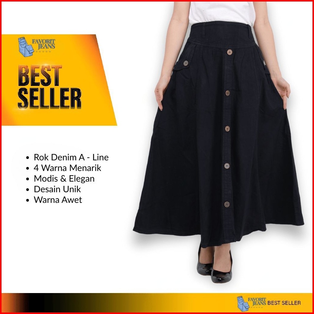 Rok Panjang Jeans Wanita Model A-line Elegan Kancing Depan Untuk Sehari-hari