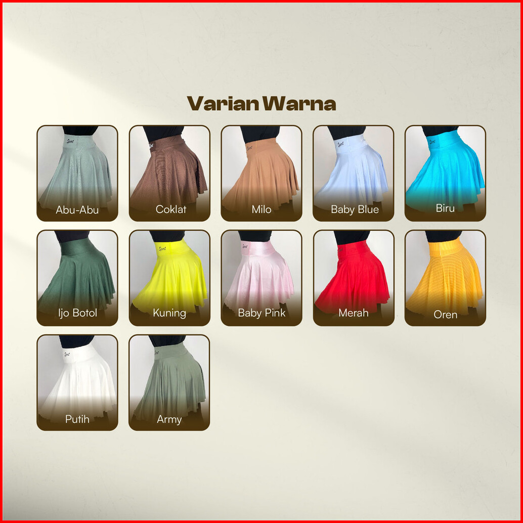 Merah (Knit), Putih (Knit), Abu Misty, Peach, Hitam, Maroon, Merah, Oren, Pink, Putih, Stabilo (Knit), Baby Blue (Knit), Kuning (Waffle), Hijau (Jersey), Baby Blue (Waffle), Abu Tua, Denim, Army (Knit), Sage, Biru (Waffle), Biru Knit, BabyBlue, Milo, Peach Salur, Mocca, Coksu (Knit), Abu Bintik (Knit), Brown, Sage (Knit), Silver (Knit), Lemon, Burgundy, Pink Fanta, Cream, Lilac (Waffle), Oren (Knit), Putih Salur, Biru Elektrik (Knit)