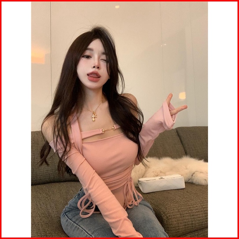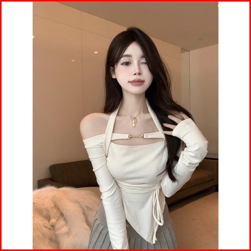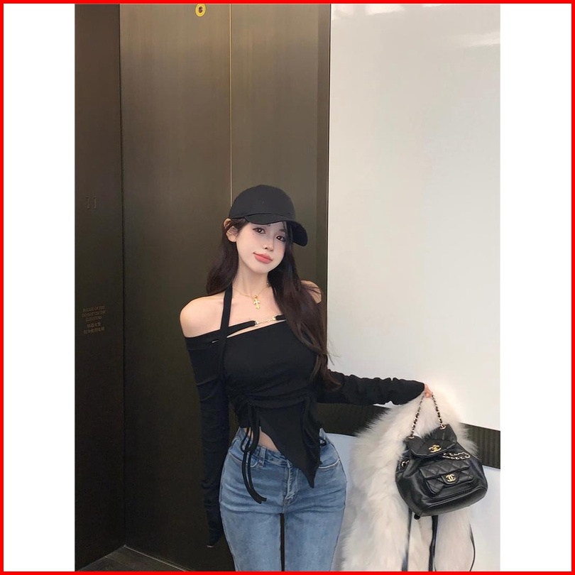 Cohan Ds011 Women S Croptop Slimbody Square Neck Long Sleeve Hitam Putih S M L