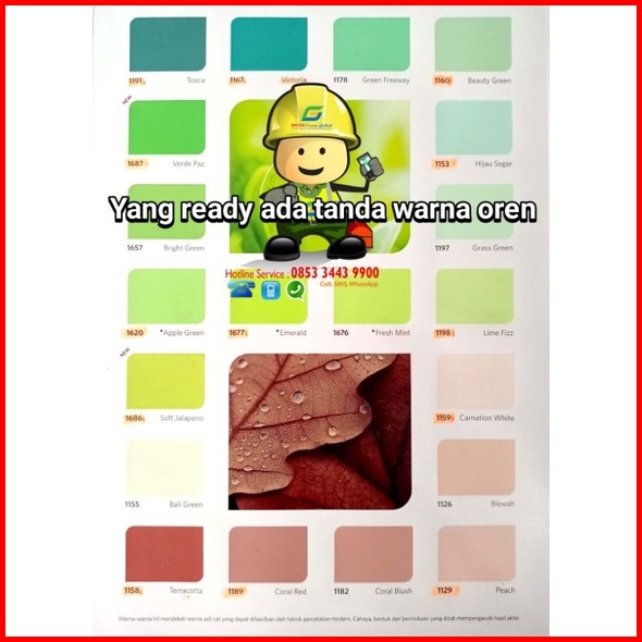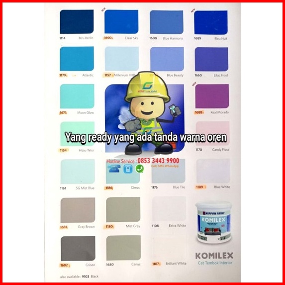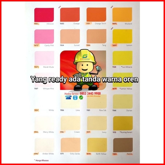 1185 hibiscus, 1683 orange, 1131 orange torch, 1685 mustard, 1672 candy pink, 1184 tang, 1684 lemon, 1127 merah muda, 1674 lemon yellow, 1102 white, 1192 Merry White, 1116 cream, 1117 ivory, 1196 amber white, 1610 earth yellow, 1183 pebble, 1191 tosca, 1167 victoria, 1687 verde paz, 1153 hijau segar, 1620 apple green, 1677 emerald, 1686 soft jalapeno, 1159 carnation white, 1158 terracotta, 1189 coral red, 1129 peach, 1179 atlantic, 1157 millenium bluee, 1168 blue beauty, 1671 moon glow, 1688 real morado, 1154 hijau telor, 1186 cirrus, 1109 bluwhite/salju, 1681 gray brown, 1180 mist grey, 1682 griseo, 1107 brillian white, KOMILEX GOLD (mix), 1690 clear sky, 1689 blue nuit, 1657 bright green, 1145 ciling white, 1114 Biru Berlin, 1676 Fresh mint