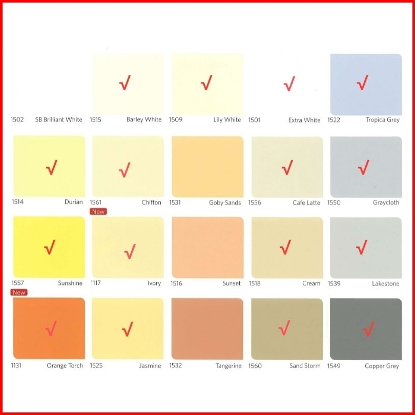 1505 Putih, 1552 Posypink, 1553 Lavender, 1523 Victoria, 1547 Swimingblue, 1514 Durian, 1525 Jasmine, 1557 Sunshine, 1515 Barleywhite, 1509 Lilywhite, 1518 Cream, 1549 Coppper, 1546 Limegreen, 1539 Lakestone, 1550 Greycloth, 1556 Caffe latte, 1534 Marina, 1548 Stone grey, 1562 Candy pink, 1540 Green freeway, 1501 Xtra white, 1561 Chifon, 1560 Sandstorm, 1117 Ivory, 1131 Orange, 1531 Gobysands, 1564 Happyfuschia, 1657Bright Green, 1559 Lilac
