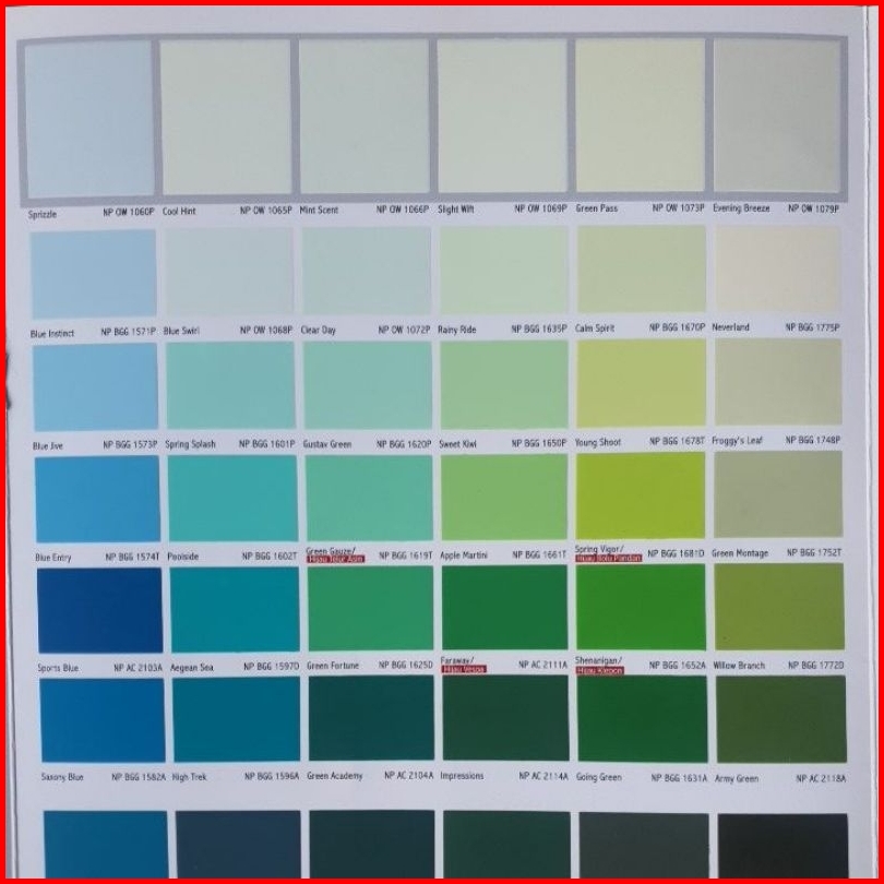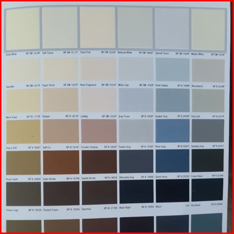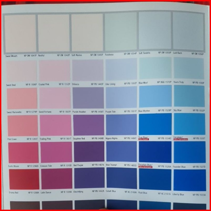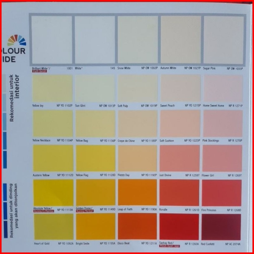 PB 1430P OPHELIAS SO, PB 1534D TRUE BLUE, 1001 BRILLIANT WHITE, YO 1223P SOFT CUSHIO, R 1261D KORALLE, OW 1019P SOFT PULP, YO 1155A BRIGHT SMIL, BGG 1775P NEVERLAND, YO 1102P YELLOW JOY, BGG 1670P CALM SPIRI, BGG 1661T APPLE MART, OW 1072P CLEAR DAY, BGG 1619T GREEN GAUZ, PB 1530P YOURS TRULY, PB 1535T CERULEAN, PB 1502P LILAC LININ, PB 1445P ORINOCO, R 1312P CRYSTAL PINK, R 1301T TRAILING PIN, N 1865P WALL ARTE, N 1849D PECAN SMELL, N 1873P SHITAKE, N 1173P WARM TOAST, 1050P WHITE LILAC, N 1992P STILETTO GRA, 1831P ALMOND CHIP, OW 1032P LULLABY, 1523P LINGERING B, R 1271P HOME SWEET H, 1021P SWANLIKE, OW 1022P PEACH PINCH, 1068P BLUE SWIRL, BGG 1738T YOUNG STAL, 1843T PASTRY PUFF, N 1822T WOOD BOX, 1407A RED PURPLE, PB 1528P BLUE RHYTHM, 1800D TERRESTRIA, BGG 1772D WILLOW BRA, 2118A ARMY GREEN, YO 1149D GOLDEN DOME, 1112D AUSTERE YEL, BGG 1650P SWEET KIWI, 1652A SHENANIGAN, R 1309A LATIN DANCE, 1540(D1) GREEN FREEW, BGG 1787T SECRET GAR, 1602T POOLSIDE, BGG 1625D GREEN FORT, 1010P WALDEN WHIT, N 1868T STAIRSTEP, 1874T SOFT FUR, PUTIH PASTEL, PUTIH TINT, PUTIH DEEP, OW 1011P SOFT TISSUE, N 1883A SADDLE BROWN, 1460P LIGHTHEARTED, BGG 1597D AEGEAN SEA, 1759T SWEET ESCAPADE, N 1989D SILHOUETTE G, 1043D CHARTREUSE, N 1863D MORSELS, 1867P TAVERN BUFF, OW 1083P RETICENT WH, 1721T DRIED PALM, R 1269T FLOWER GIRL, 1605T LUSH, N 1864T ARTIST'S IMP, 1897A TEMPEST BROWN, N 1853T CURLING BARK, 1805T RIVER PORT, YO 1240T SEDONA STON, 1344A ROSY DREAMS, 1486T NIGARA NIGHTS, 1079P EVENING BREZZE, 1939A LAVENDER HEDGE, 2106A GREAT SEASCAPE, 1002P SNOW WHITE, 2045T SMOKING GRAY, 1994T WHETSTONE, 1596A HIGH TREK, 1173D OCEAN CALM, 1273T IMPATIENS PINK, 1912T HARRISON GRAY, 1301T TRAILLING PINK, 1307P GOOD FORTUNE, 1279P SWEET MARIONET, BGG 1802P PINE BUD, R 1283T PINK CROWN, BGG 1631A GOING GREE, BGG 1588T PERSIAN BL, PB 1518T BLUE EMOTIO, 1102 WHITE, 1560 SAND STORM, OW 1081P RESERVED WH, BGG 1712P PICKET FEN, BGG 1758D TORRENTS, R 1363P CRUSHED CLAY, BGG 1665T PIXIE LEAF