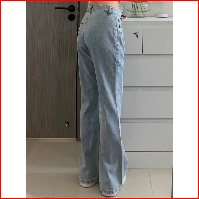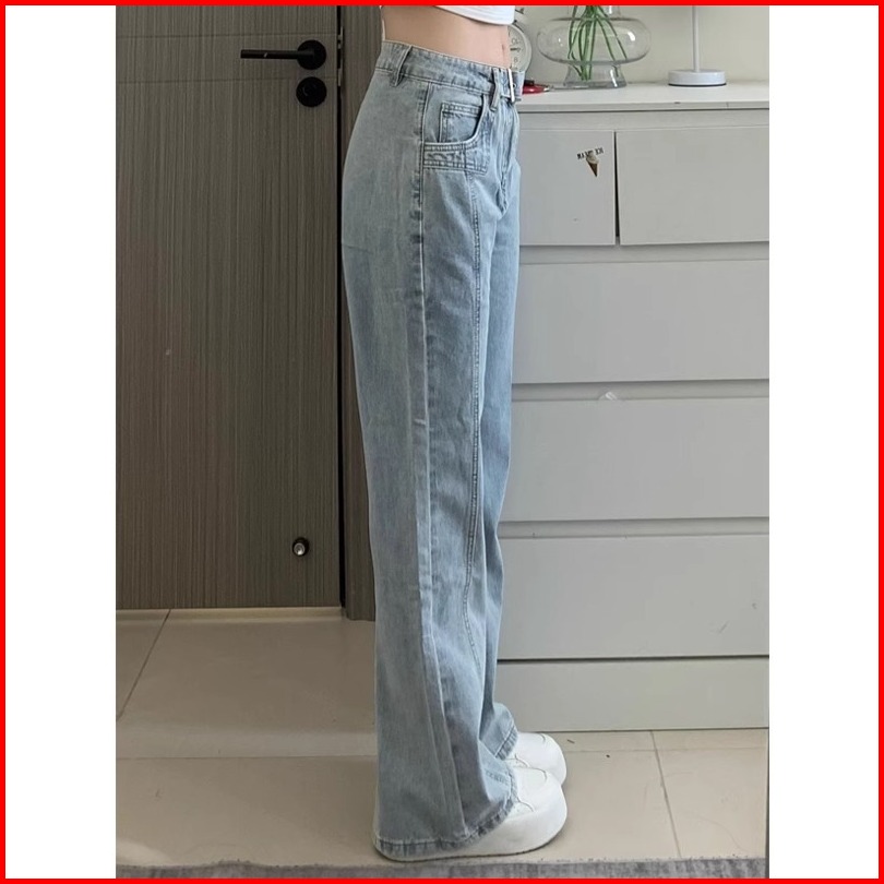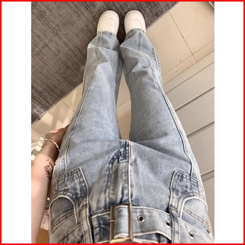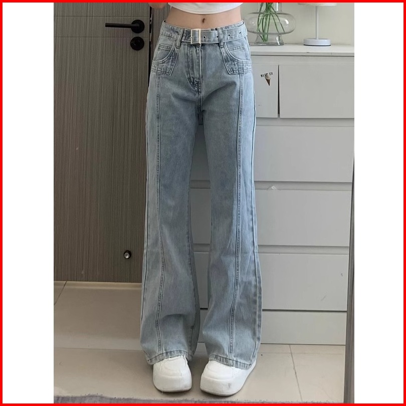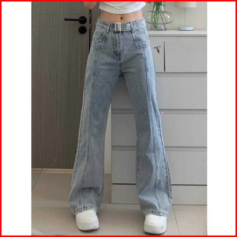 High Waist Biru Muda Premium Calana Panjang Jeans Wanita Import Murah Sabuk Denim