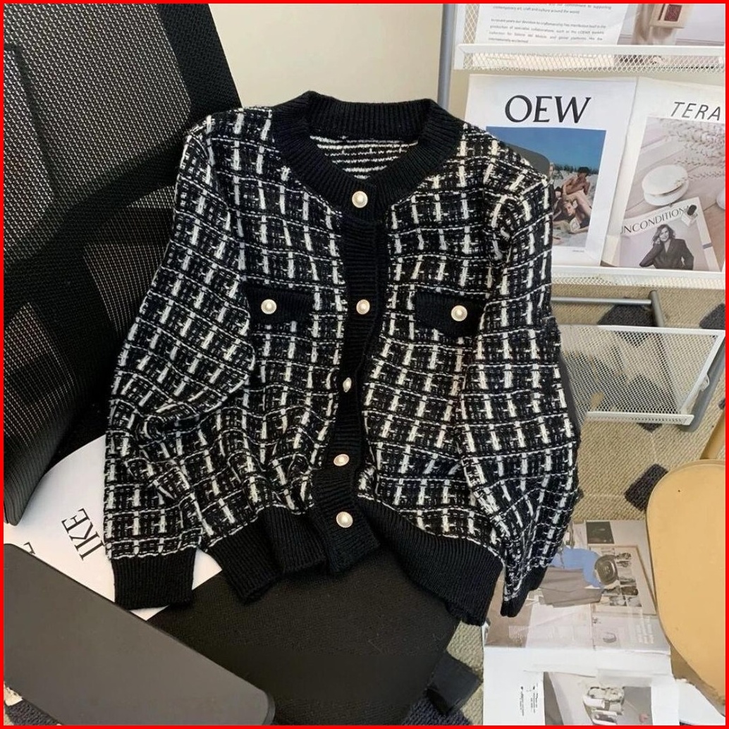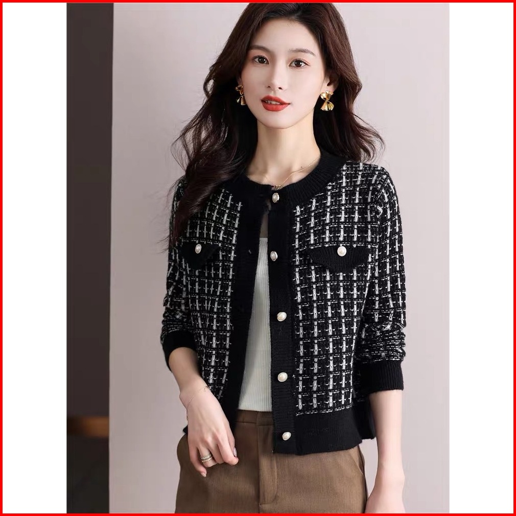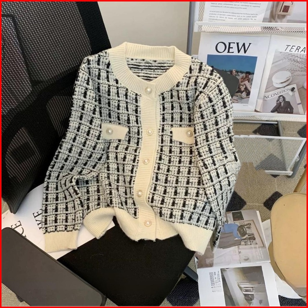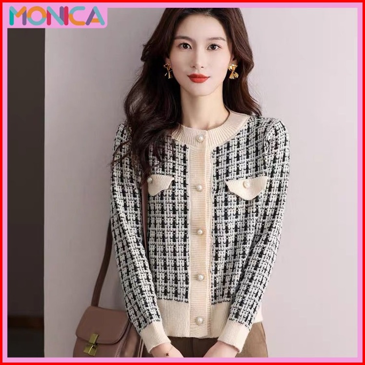 Monica Cardigan Rajut Sweater Santai Round Neck Persegi Setrip Baju Panjang Knitwear Wanit