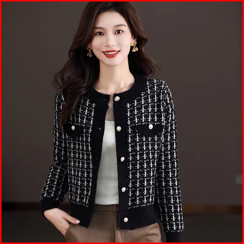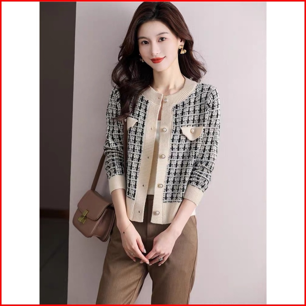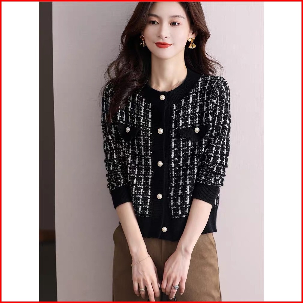 Monica Cardigan Rajut Sweater Santai Round Neck Persegi Setrip Baju Panjang Knitwear Wanit