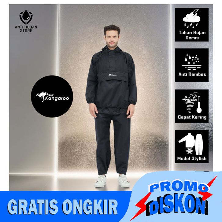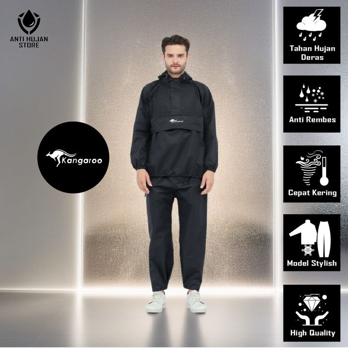 PAKET JAS HUJAN KANGAROO ORIGINAL RAINCOAT SETELAN MANTEL HUJAN ANTI AIR HUJAN DERAS BERKENDARA MOTOR - BLACK, M